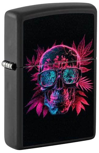 Zippo Stormtändare, matt svart (Black Matte), med neonbild cannabis-dödskalle, påfyllningsbar och återanvändbar, med vindskyddad design, presentförpackning, tillverkad i USA