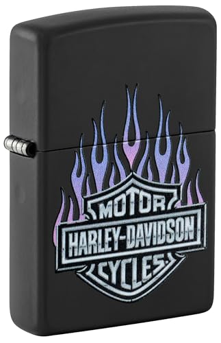 Zippo Stormtändare, matt svart (Black Matte), med färgbild av Harley Davidson, påfyllningsbar och återanvändbar, med vindskyddad design, presentförpackning, tillverkad i USA