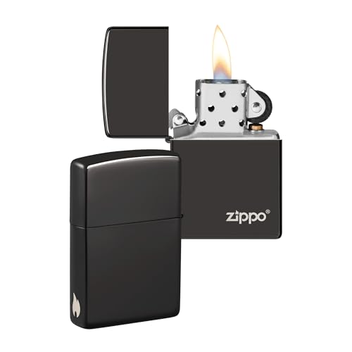 Zippo stormtändare - Svart högblank krom med logotyp och sidograverad flamma, påfyllningsbar, återanvändbar, vindskyddad, presentförpackning, tillverkad i USA – Amazon Exclusive