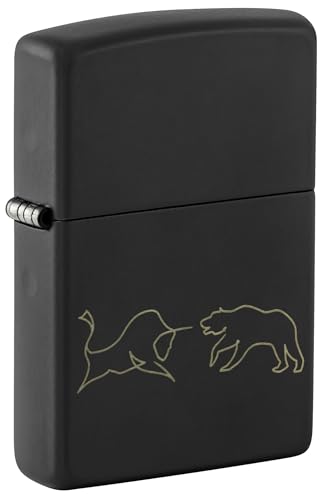 Zippo Stormtändare, matt svart (Black Matte), med lasergraverad tjur och björn, påfyllningsbar och återanvändbar, med vindskyddad design, presentförpackning, tillverkad i USA