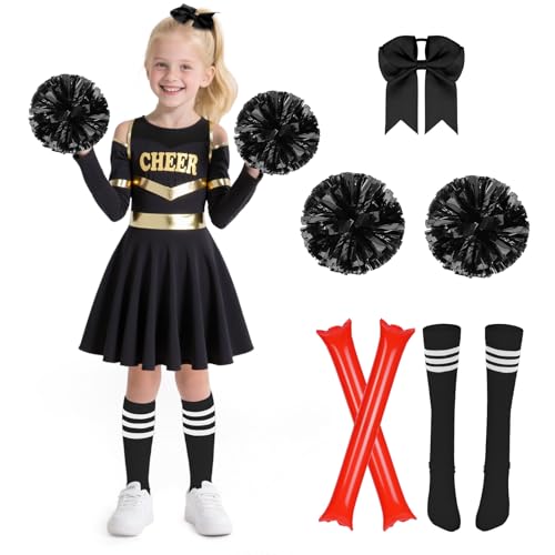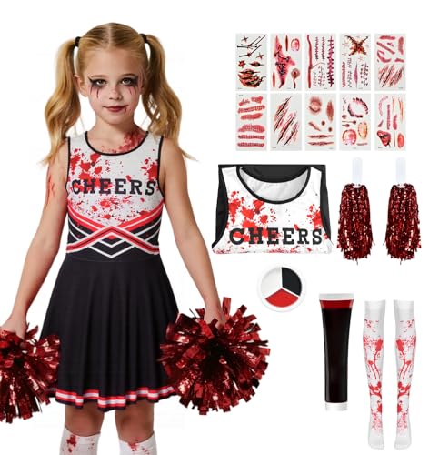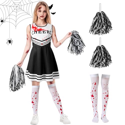 AYBUY Cheerleader-halloweenkostym, flicka cheer outfit karnevalsklänning, zombie cheerleader med pompoms, strumpor, uppblåsbara pom och huvudbonad för karneval, halloween, cosplay fester, 160