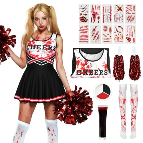 HarnyLoom Cheerleader kostym barn vuxna zombie cheerleaders klänning flickor kvinnor outfit blodiga pompoms klistermärken döda läskiga halloweenfester utklädning