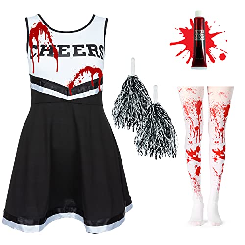 HarnyLoom Zombie Cheerleader Kostym Flicka, Zombie Kostym Uniform Blod Cheerleader med Pom Strumpor Adesivi Halloween Fester (Svart, L)