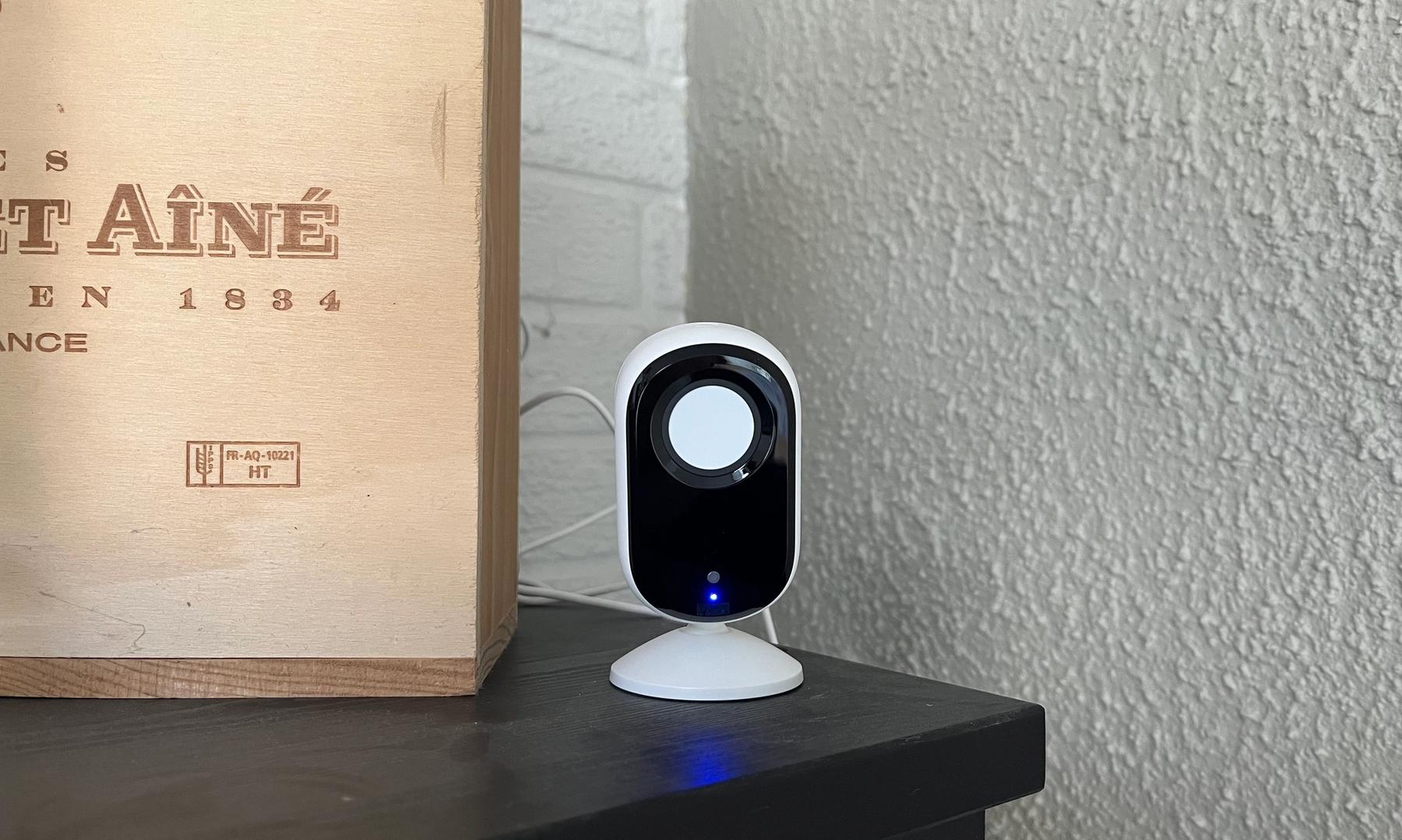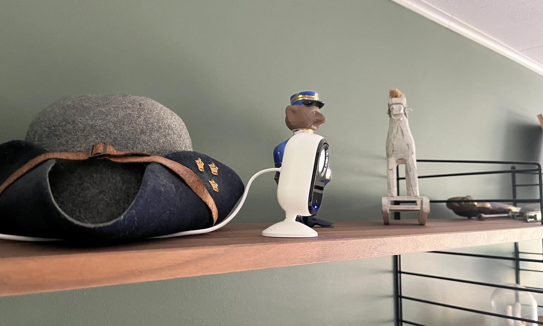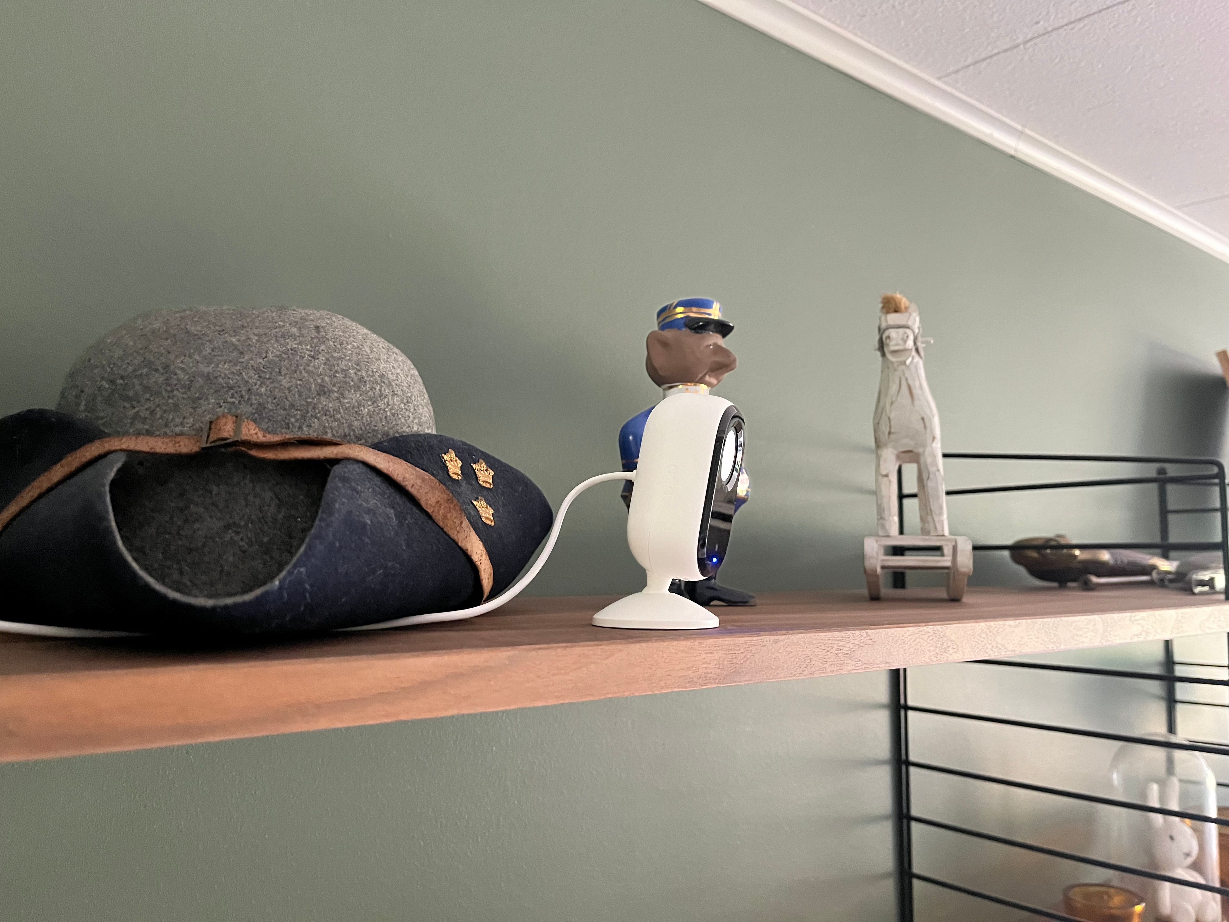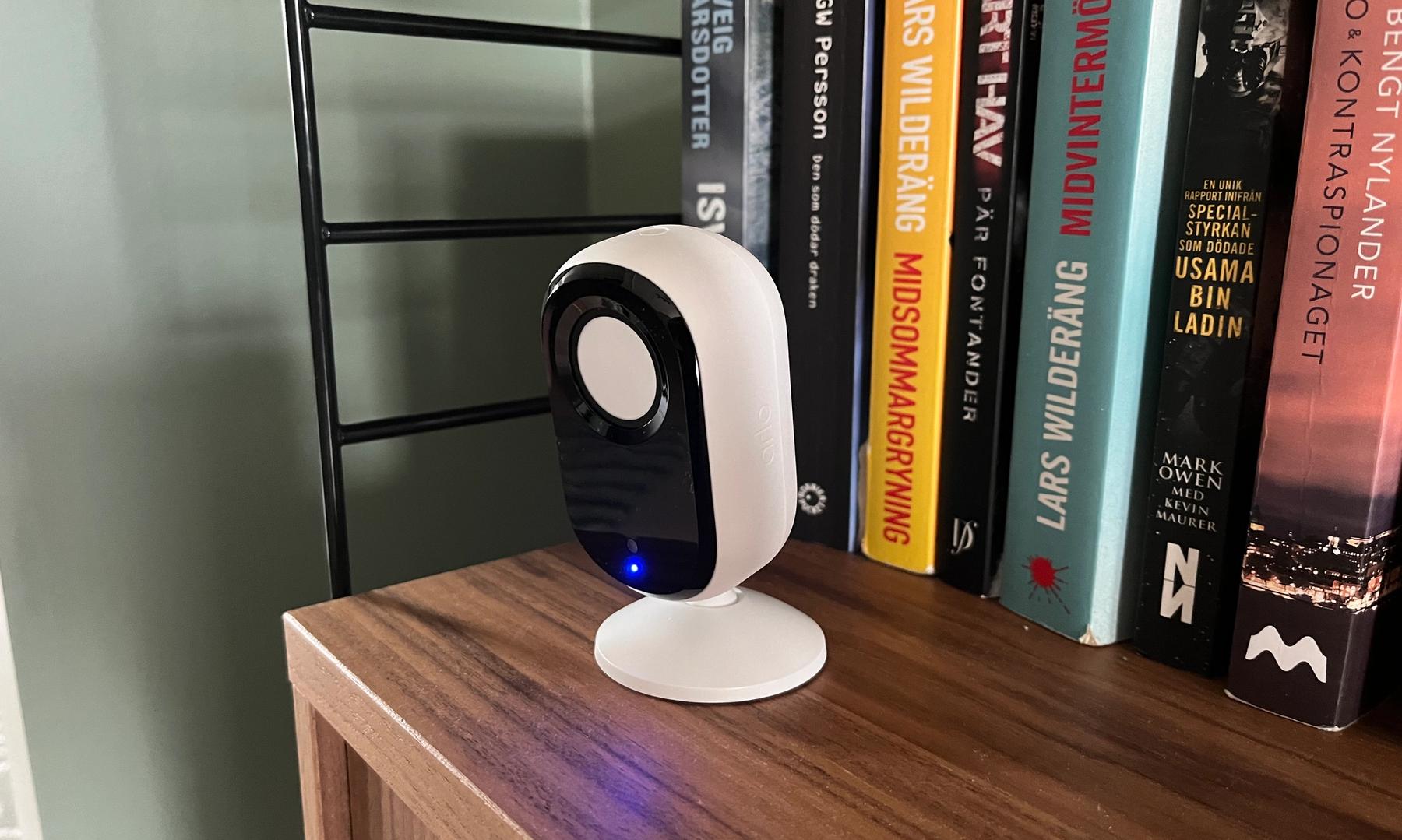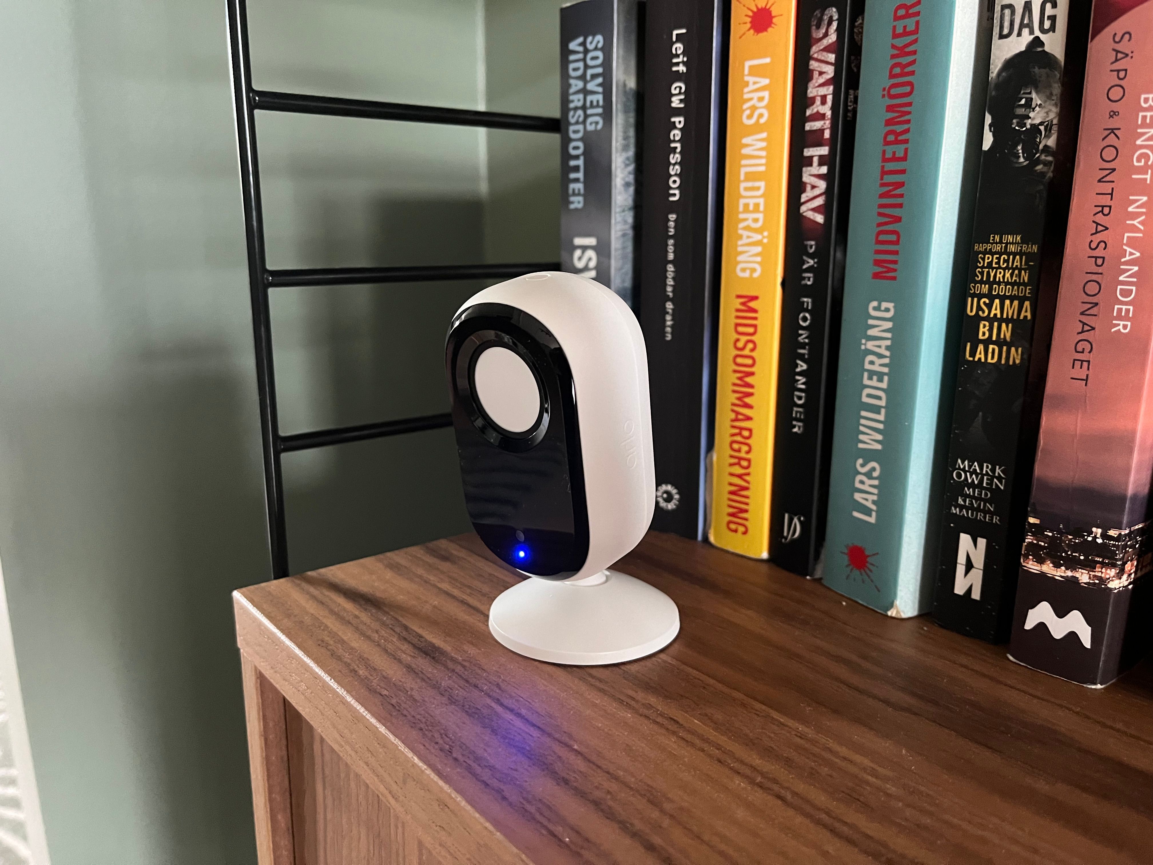 Arlo Indoor Camera kommer monterad med en fot för att enkelt ställa kameran i hyllan eller ovanpå något för att sedan rikta den mot området den skall bevaka.