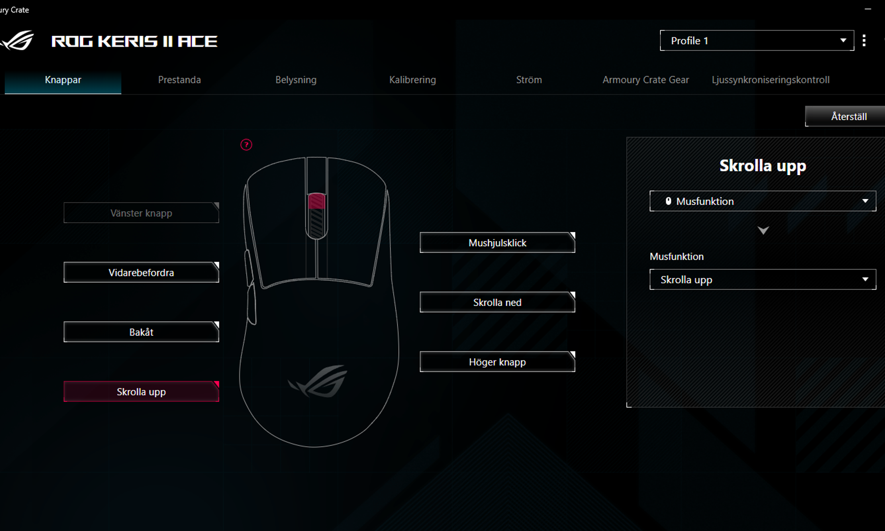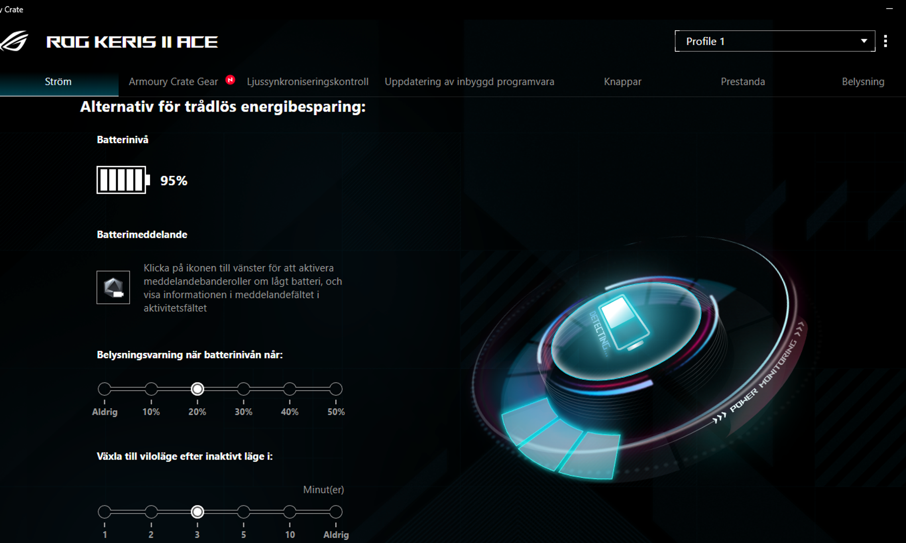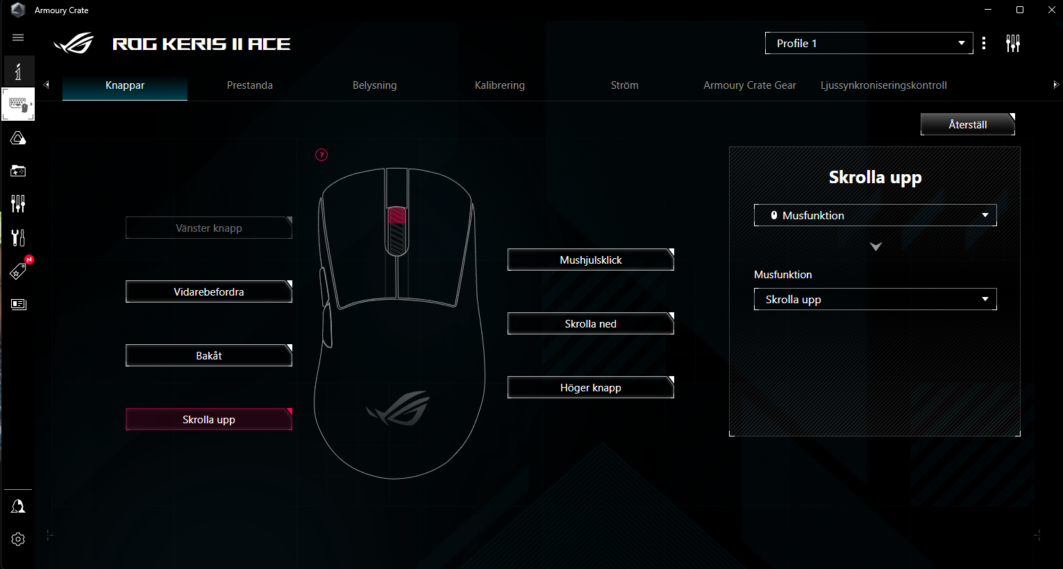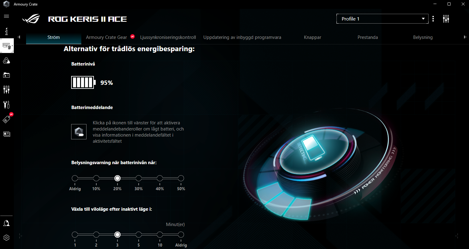 I Armoury Crate kan du bland annat kalibrera din mus efter vilken sorts musmatta du använder, ställa in en belysningsvarning när batteriet börjar ta slut och bestämma när musen ska gå in i viloläge.