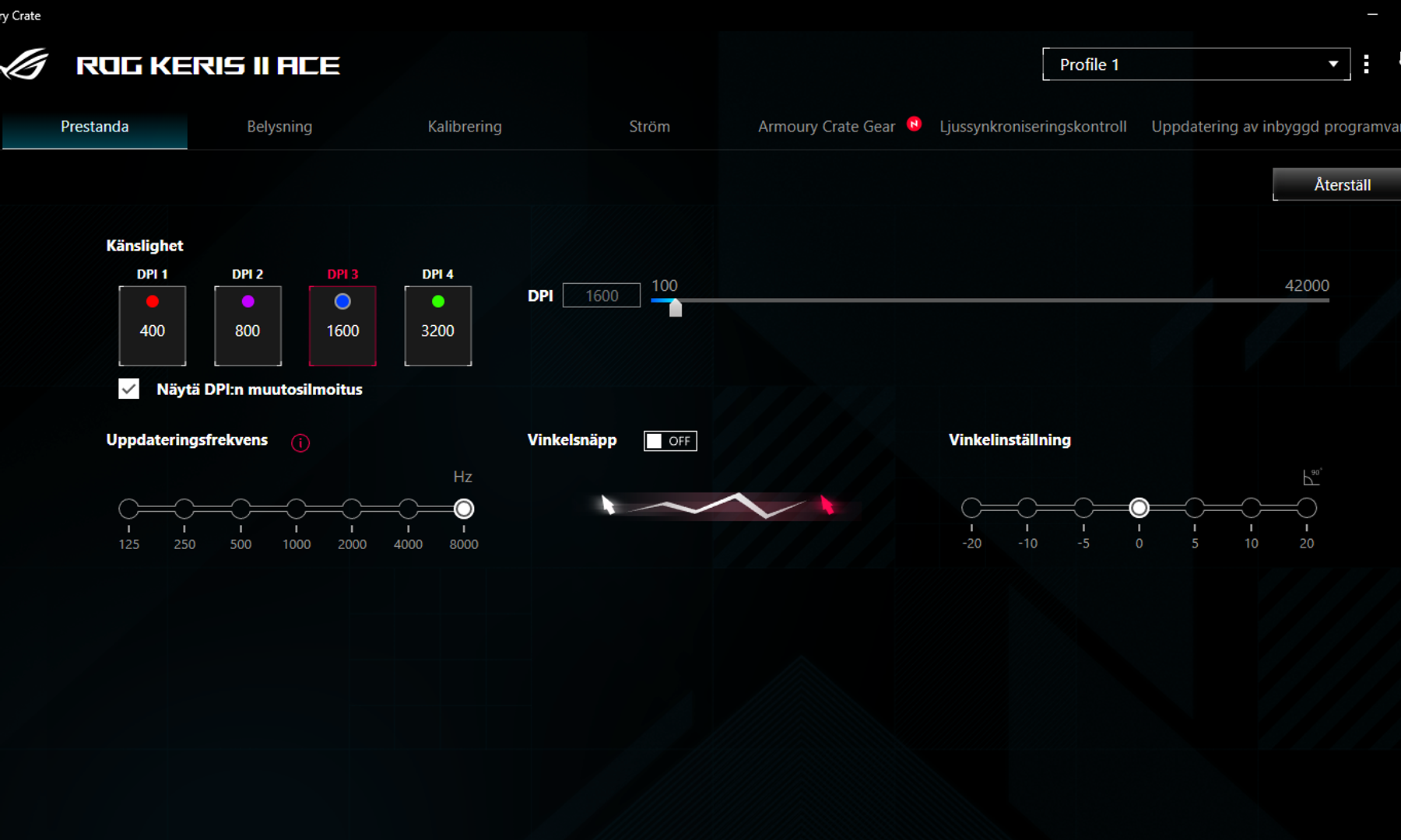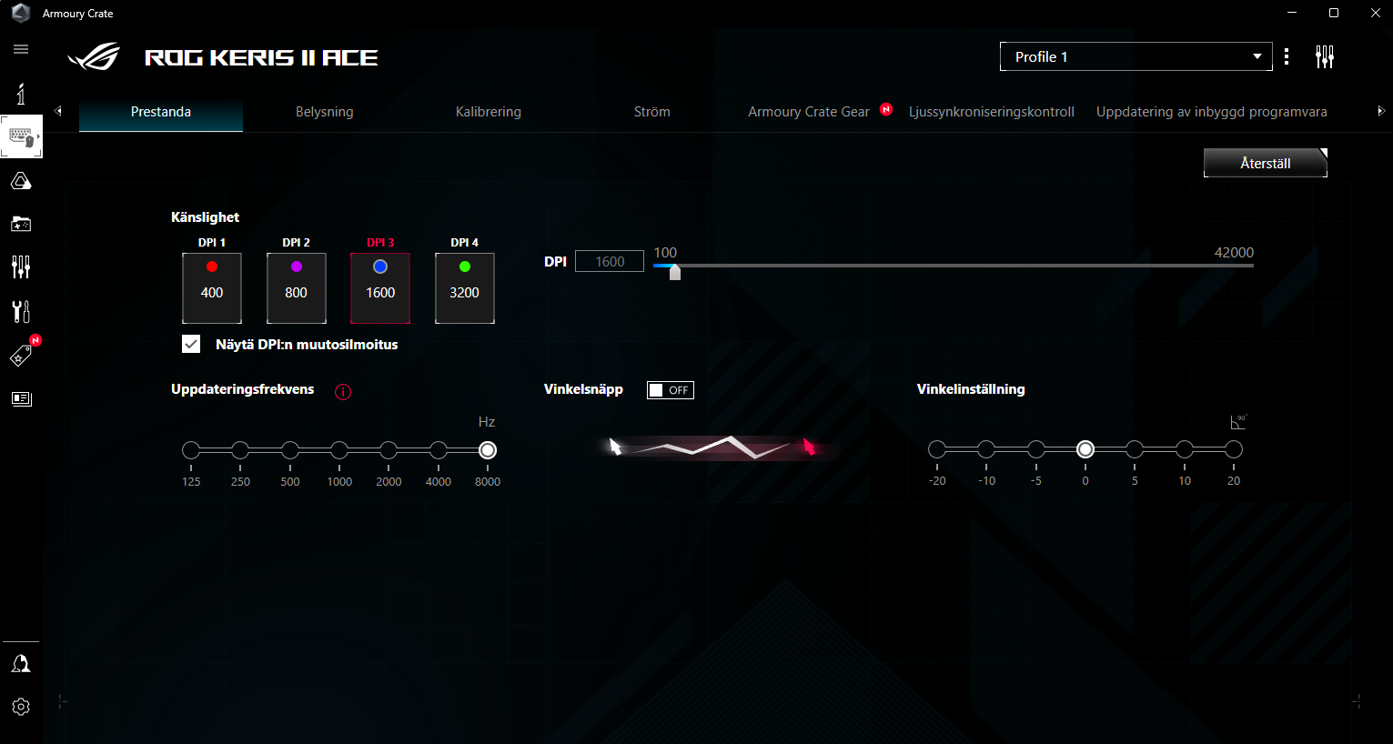 Du kan även justera känslighet (DPI), uppdateringsfrekvens, vinkelsnäpp och vinkelinställning – se bild 3.