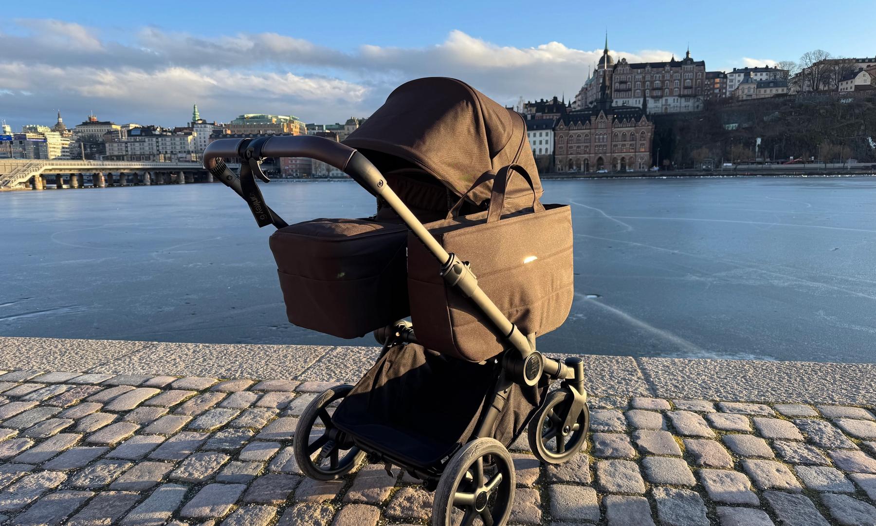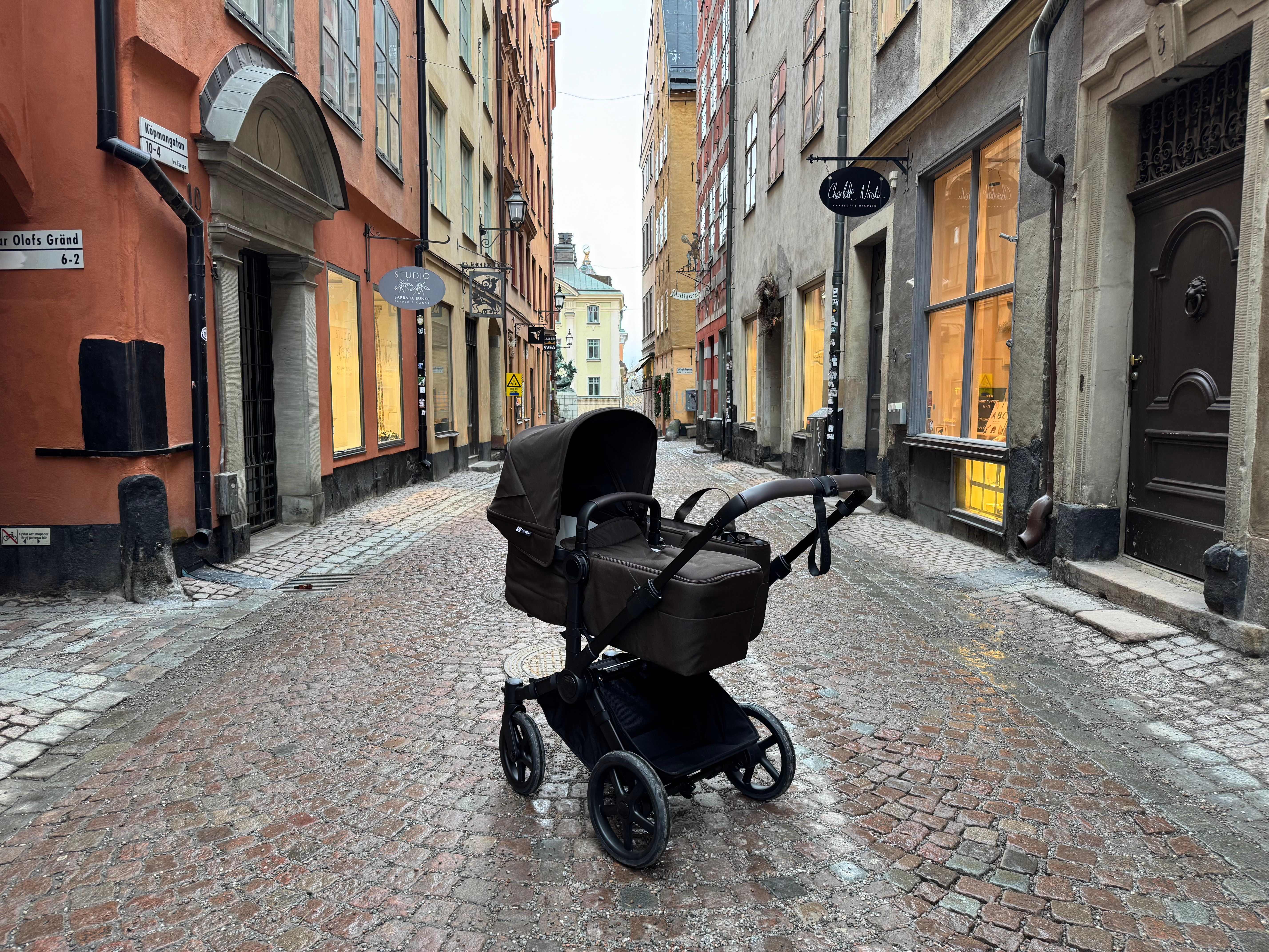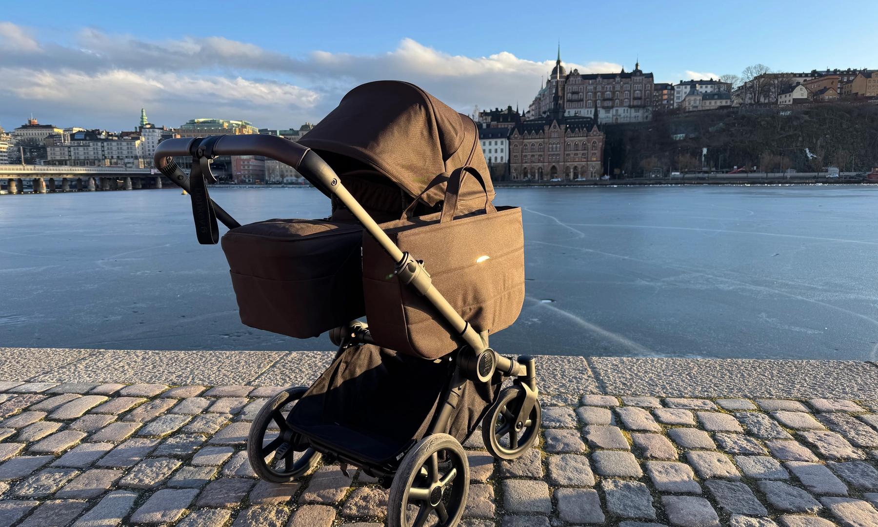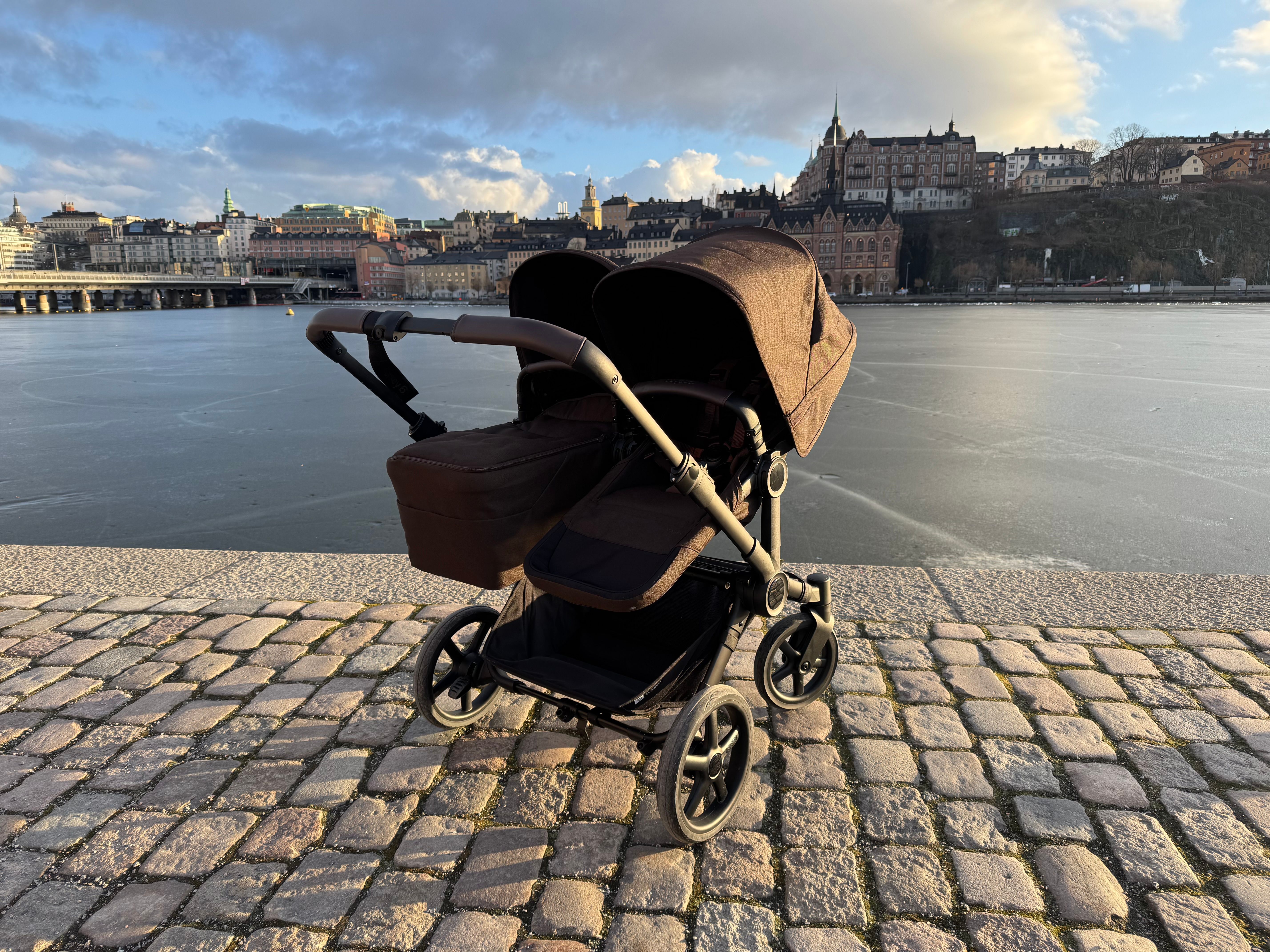 Den passar också dig som har tvillingar eller täta syskon då den på ett par sekunder ändras från enkel- till dubbelvagn. Den blir inte för bred i duoläget utan håller sig inom det så kallade stockholmsmåttet, vilket är 75 cm brett.