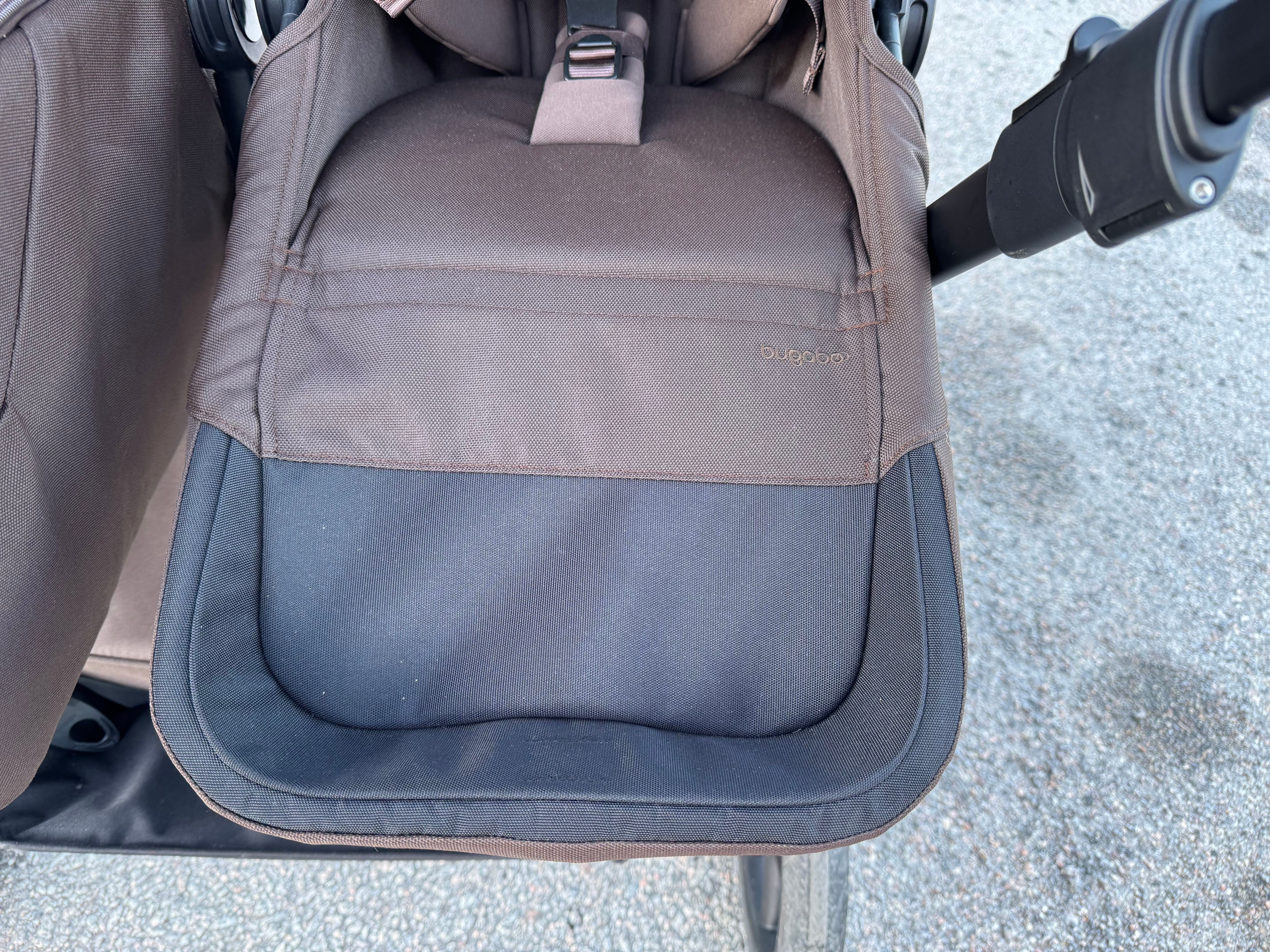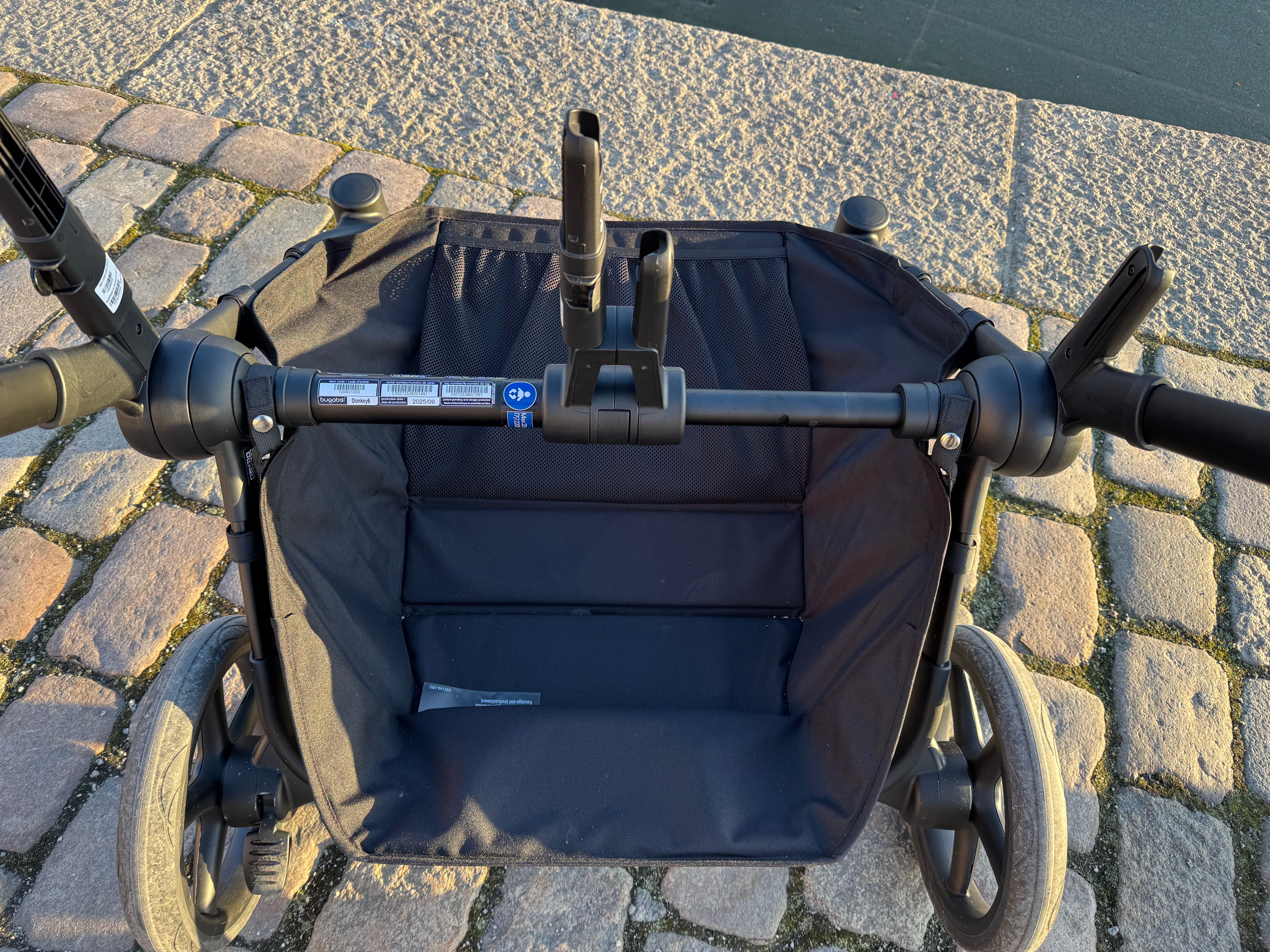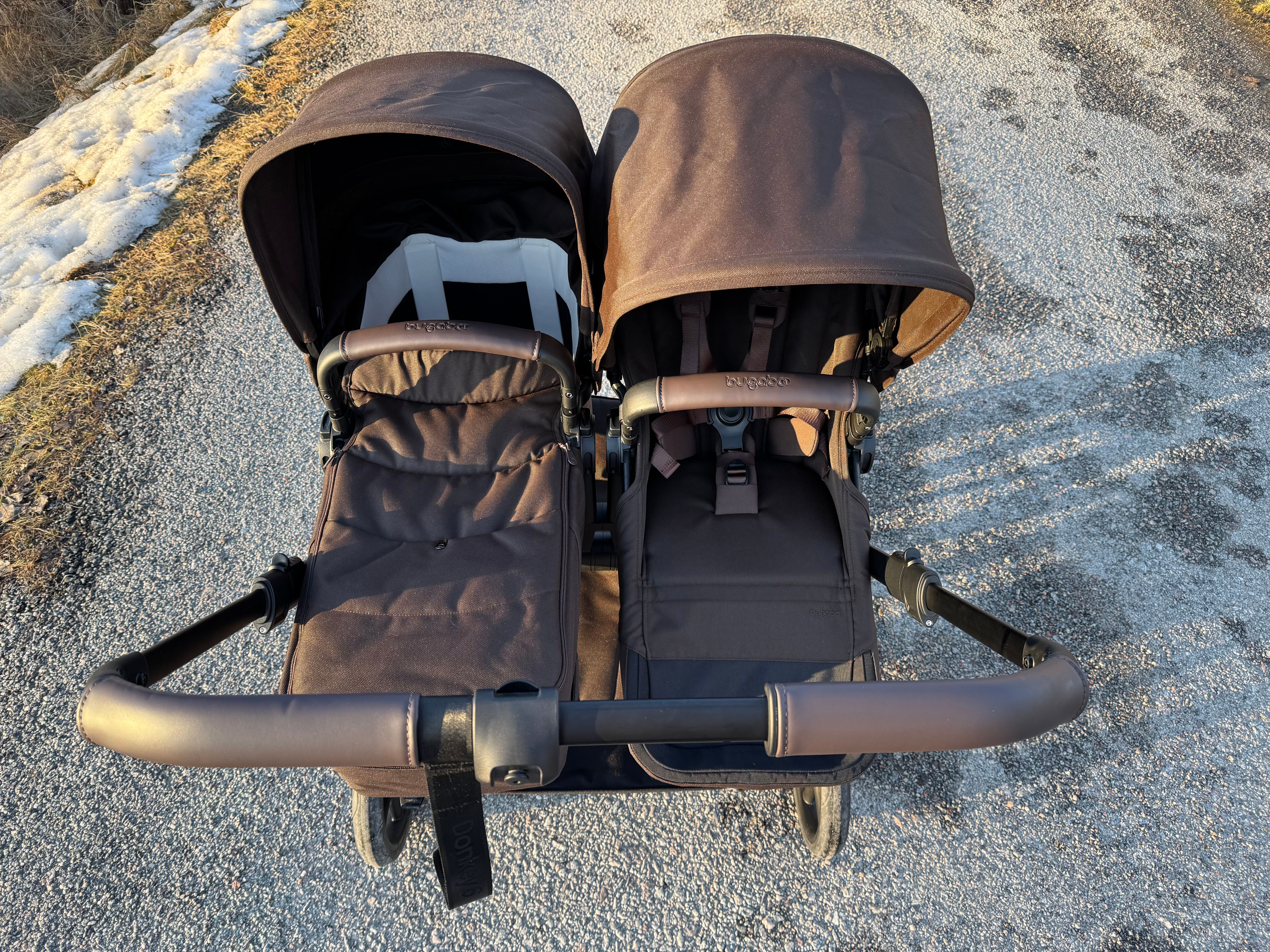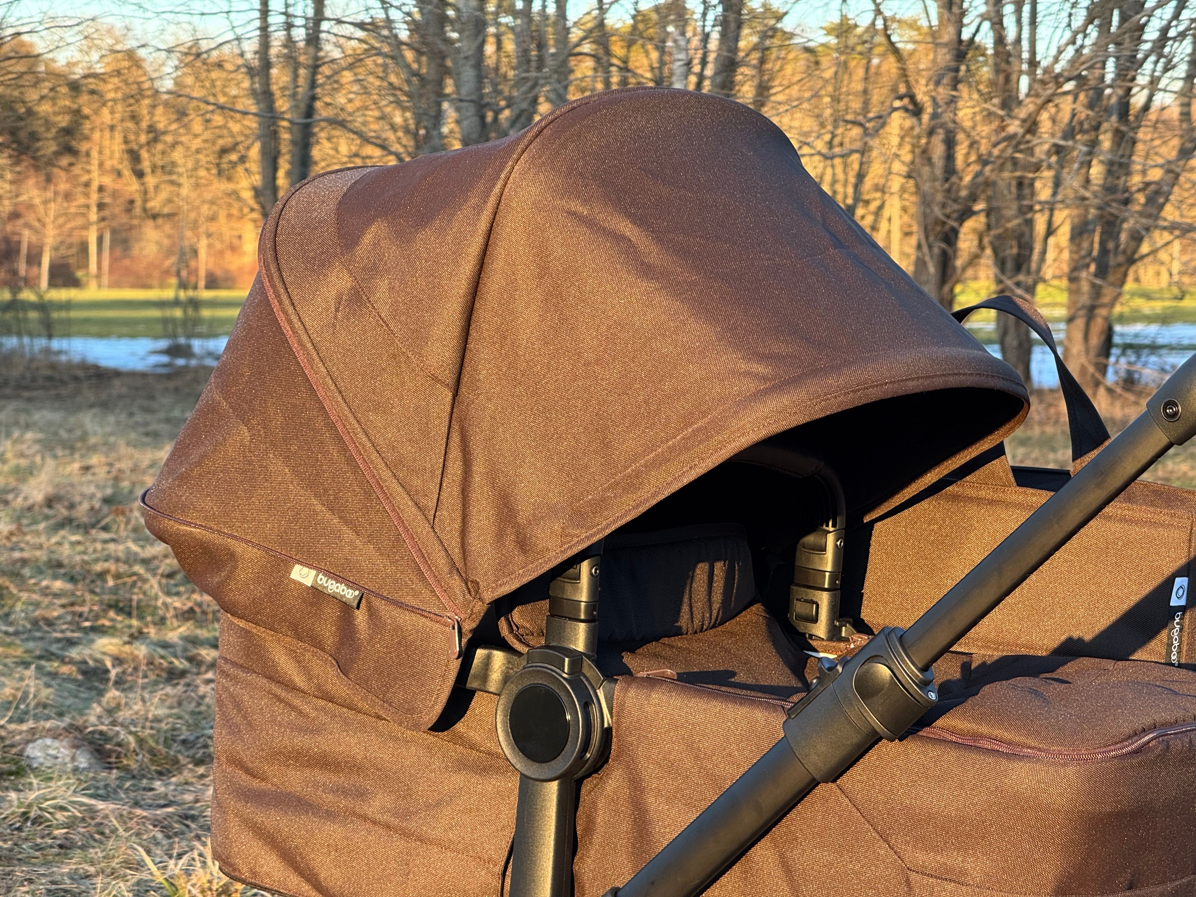 Ska du t.ex. lämna ett äldre syskon på förskolan och sedan inte vill rulla en dubbelvagn därifrån kan du enkelt lyfta av sittdelen, skjuta ihop chassit och rulla vidare med vagnen som enkelvagn. Och om det inte finns plats för den extra sittdelen på förskolan så går det att lägga den i varukorgen under vagnen. Bugaboo har tagit patent på denna lösning och är således helt ensamma på marknaden med den här smidiga lösningen.