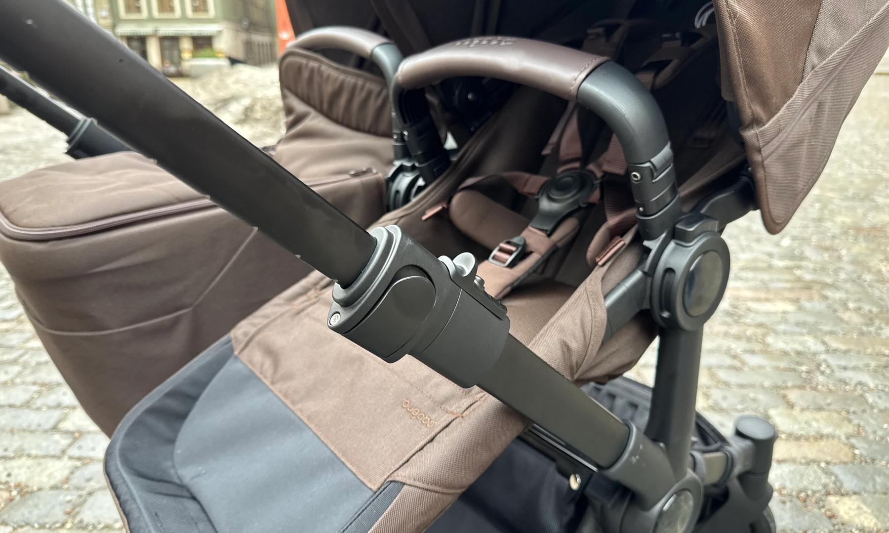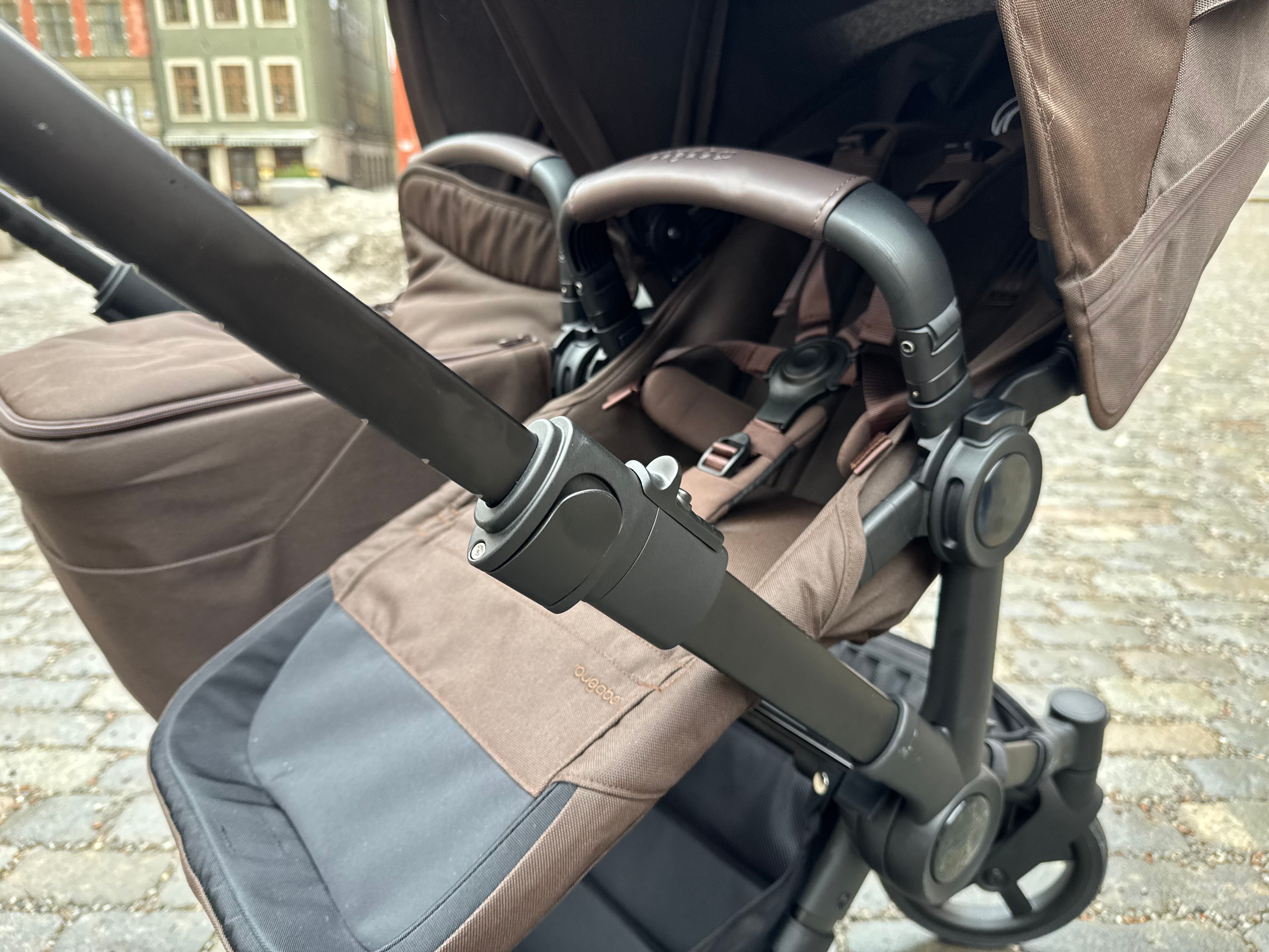 En av de absolut bästa funktionerna på Bugaboo Donkey 6 är hur man ändrar vagnen från mono till duovagn. Man öppnar tre spärrar och sedan skjuter man in chassit för att få den i mono/enkelvagnsläge. Sedan drar man ut det för att få den i duo/syskon/tvillingläge. Jätteenkelt och supersmidigt! Bugaboo har verkligen tänkt till och fått till en smidig lösning.