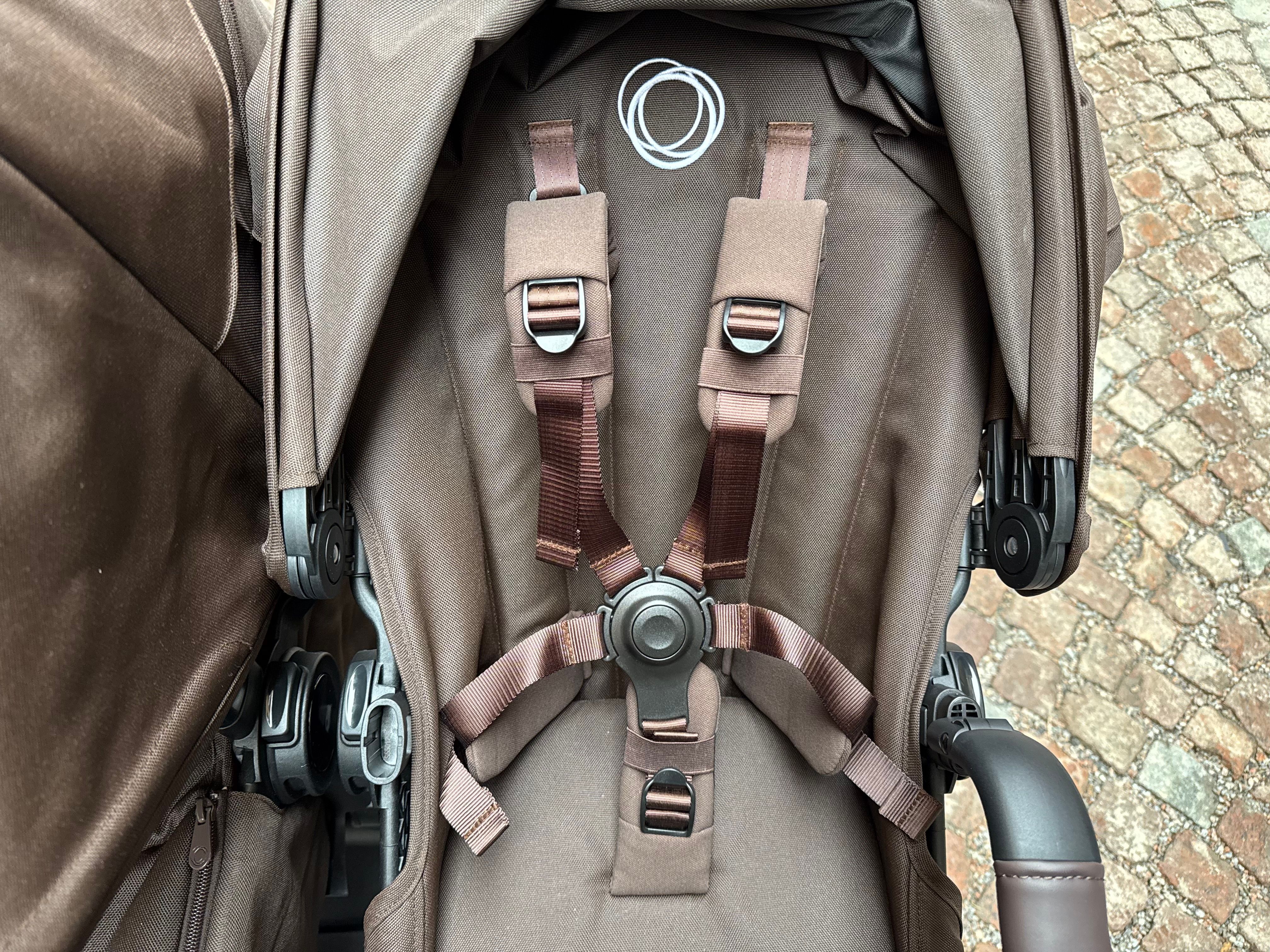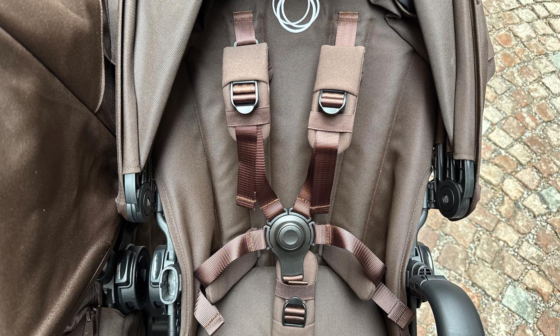 Sittdelen har även en vadderad fempunktssele där alla delarna är individuellt användbara. Vill man bara knäppa över barnets midja går det, eller bara över axlarna så går det. Smidigt att kunna använda delarna lite olika beroende på hur rymningsbenäget barnet är :-) En ny designdetalj är att selen är i samma färg som övriga tygdelar på vagnen.