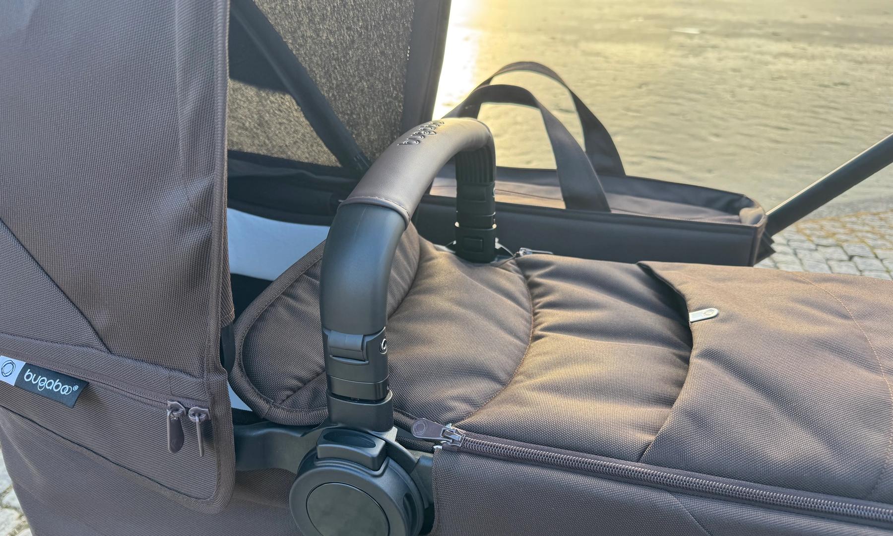 Bygeln är öppningsbar och har en swing away-funktion vilket innebär att man öppnar den på ena sidan, viker den åt sidan och kan lyfta i och ur barnet. Detta är bra då man slipper stå med en bygel i handen som man undrar var man ska göra av när man ska lyfta sitt barn. Nytt är att bygeln numera har Bugaboo instansat mitt på. Praktiskt om man ska köpa en bygel begagnad, men annars är det bara en designgrej.