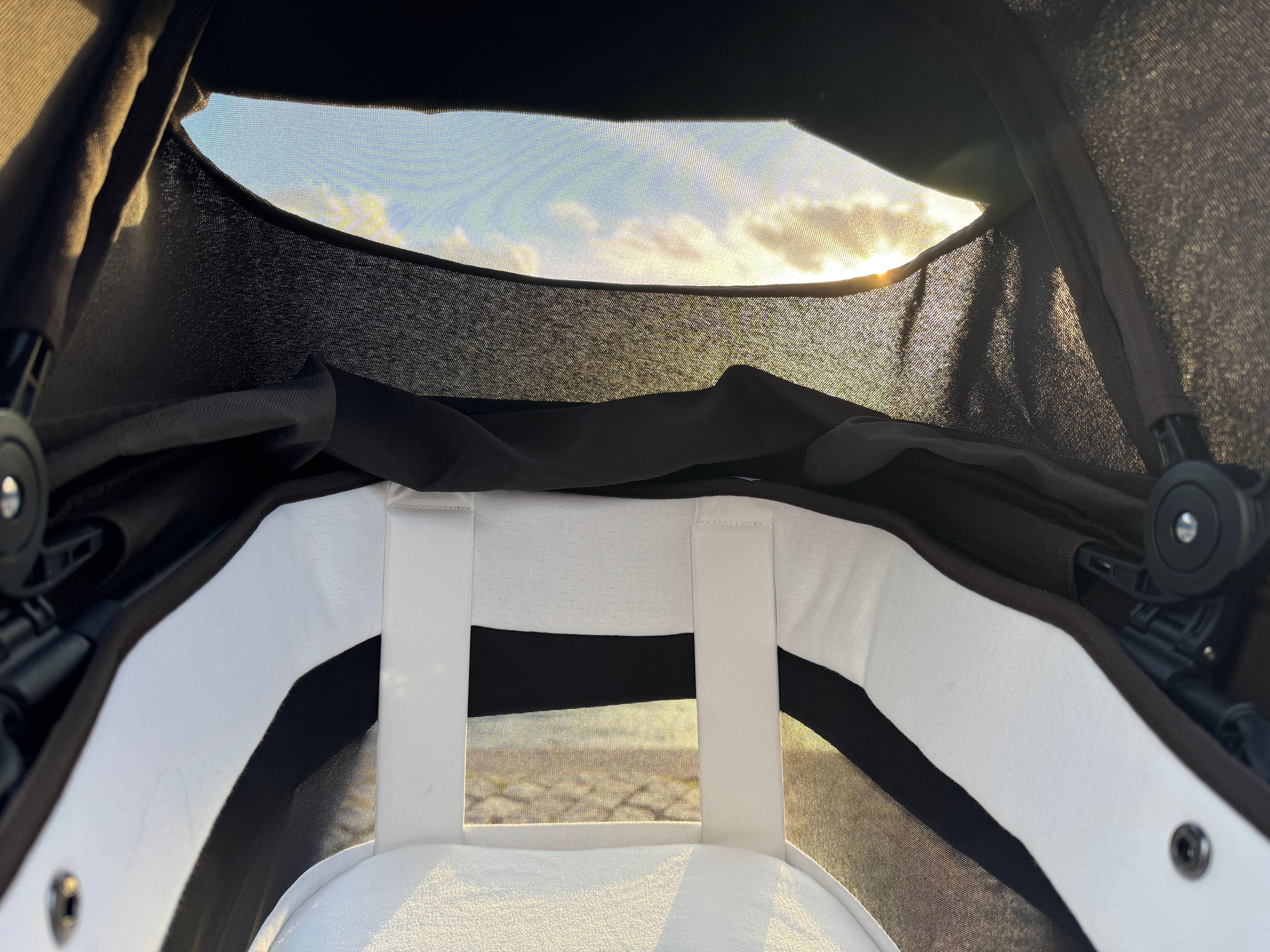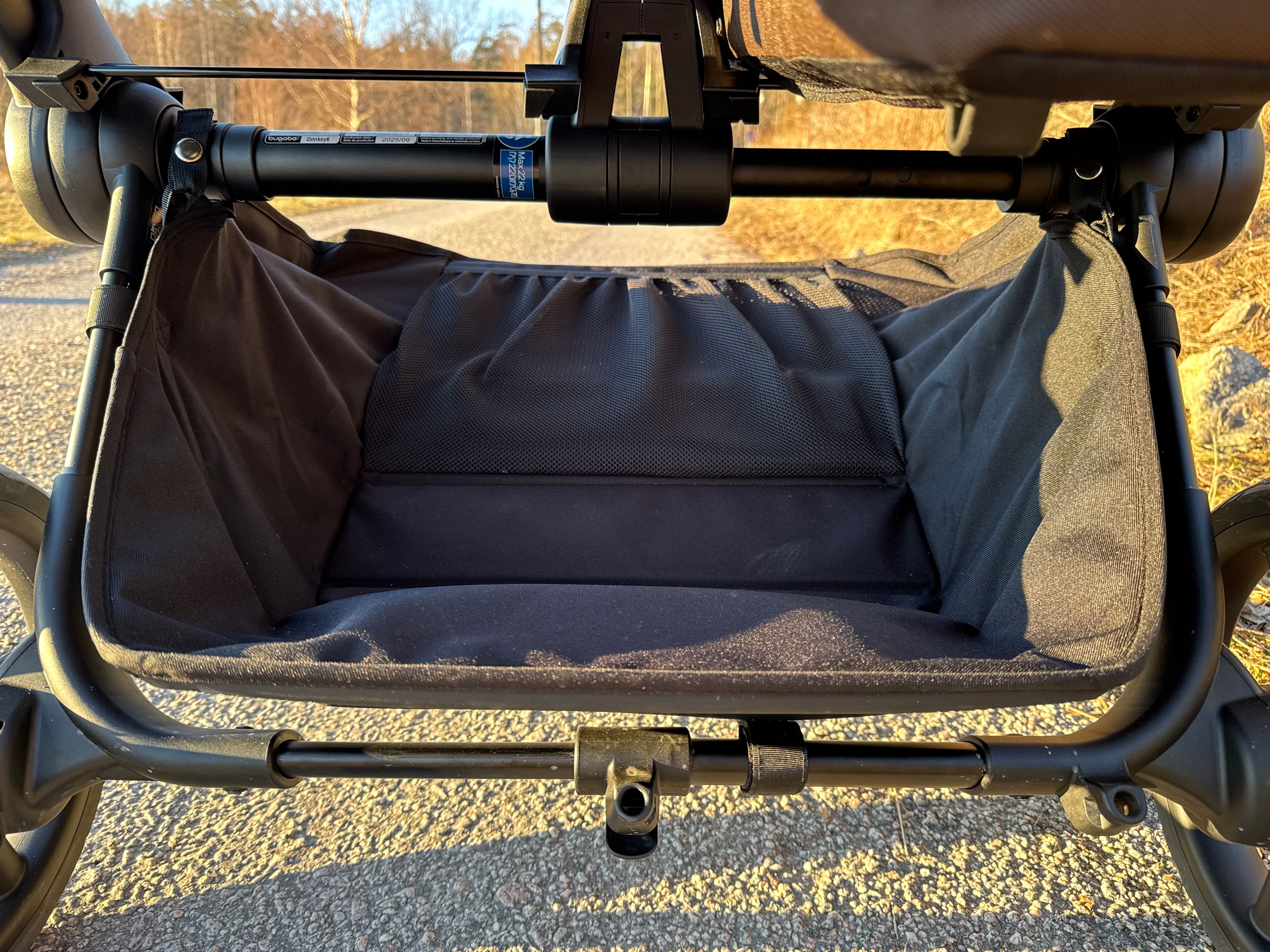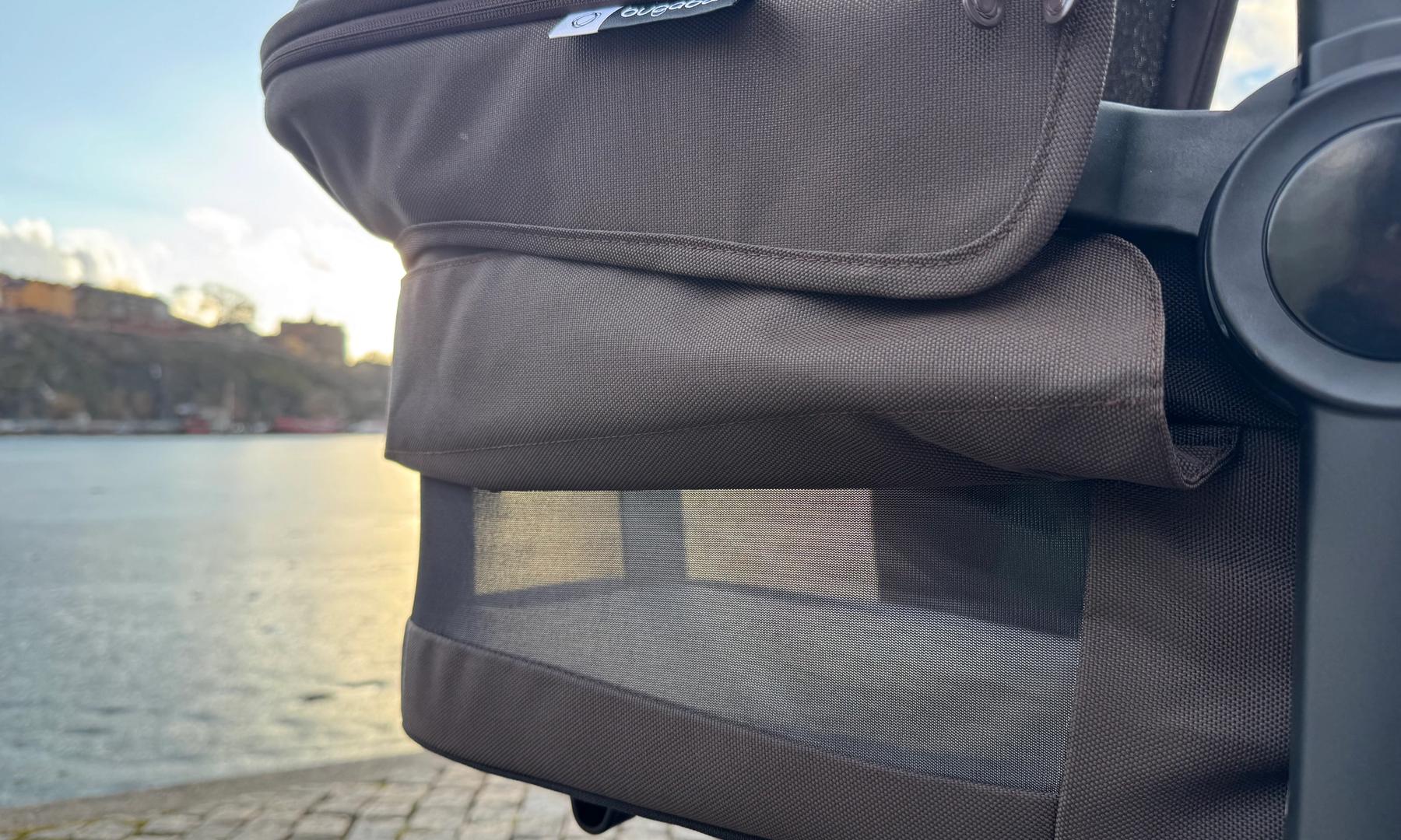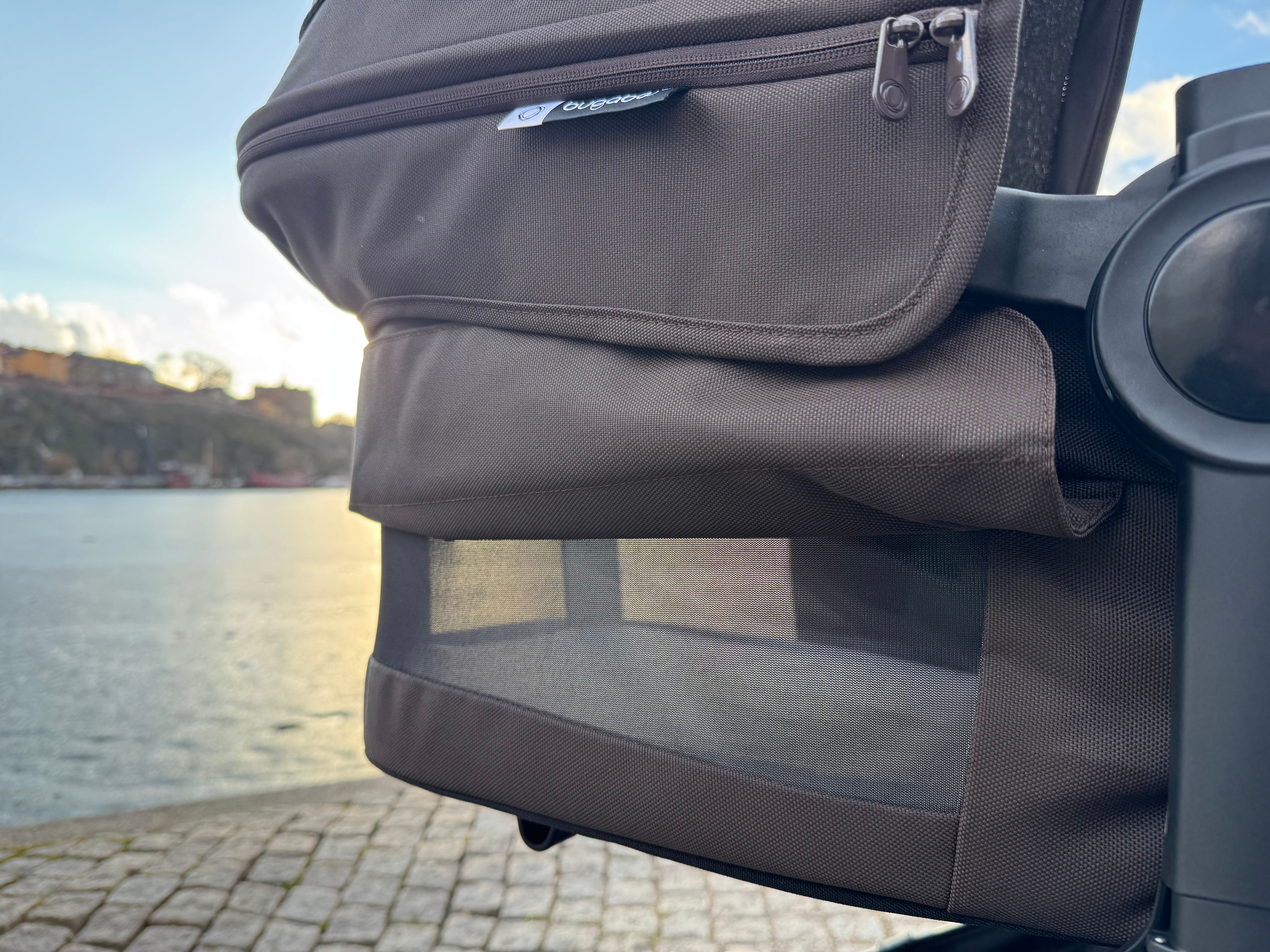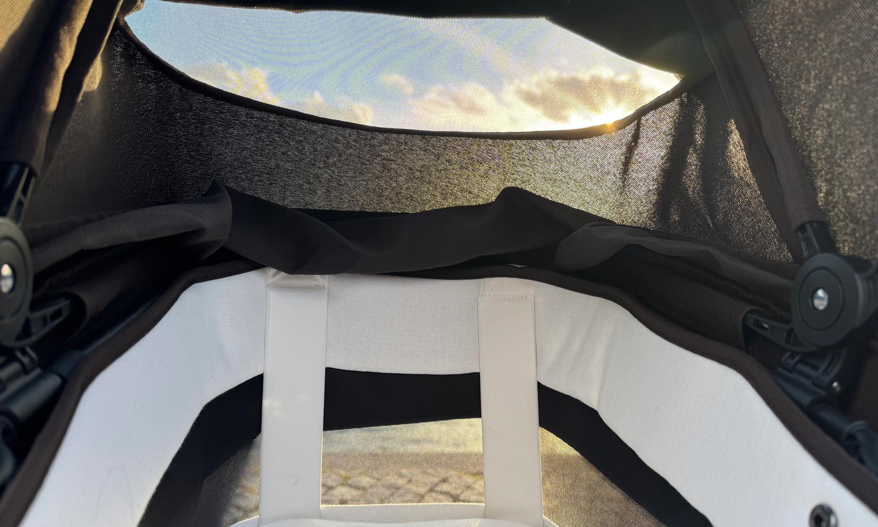 Liggdelen är ombonad och rymlig. Den har nedfällbart tyg framme vid huvudet för att öka ventilationen under varma dagar.