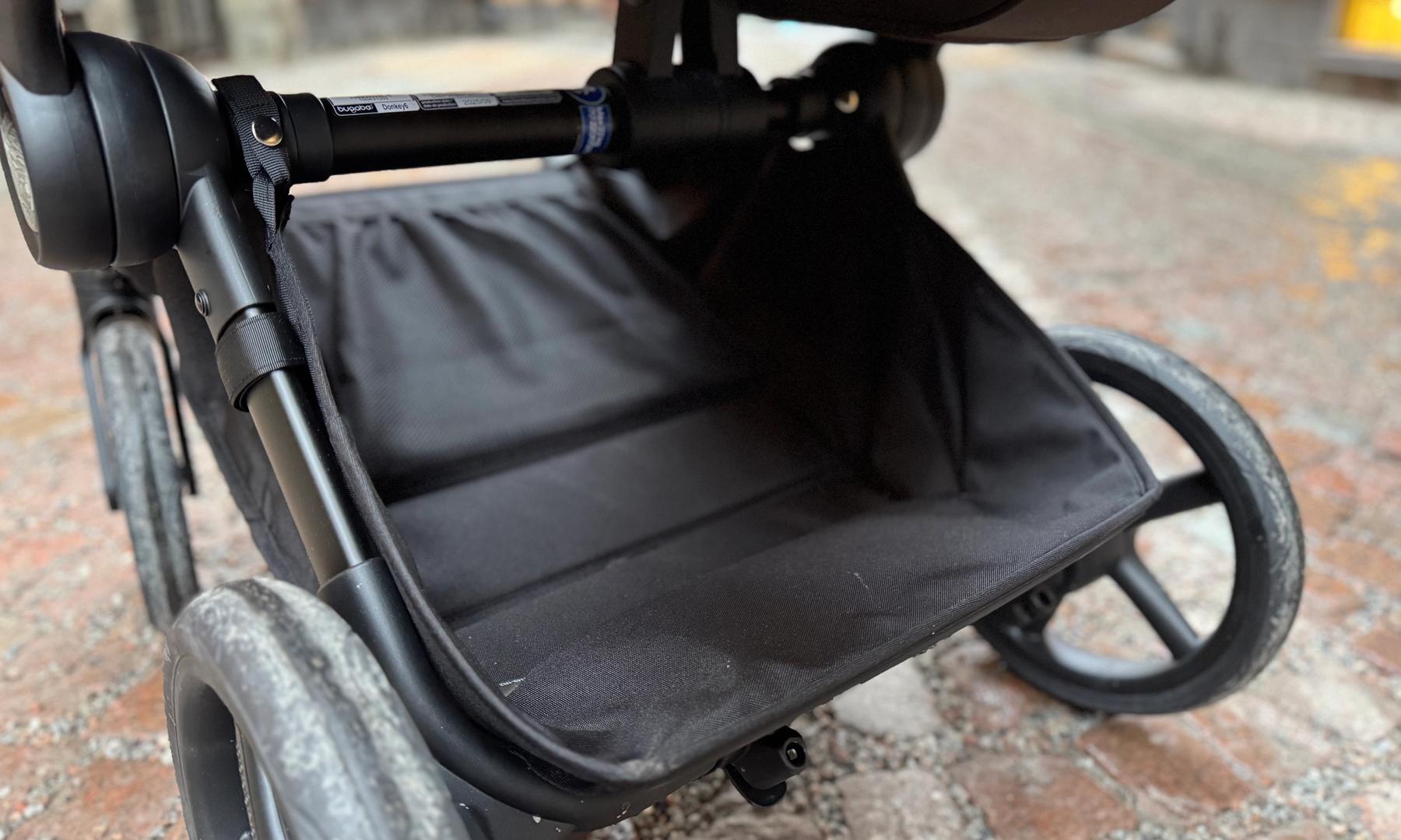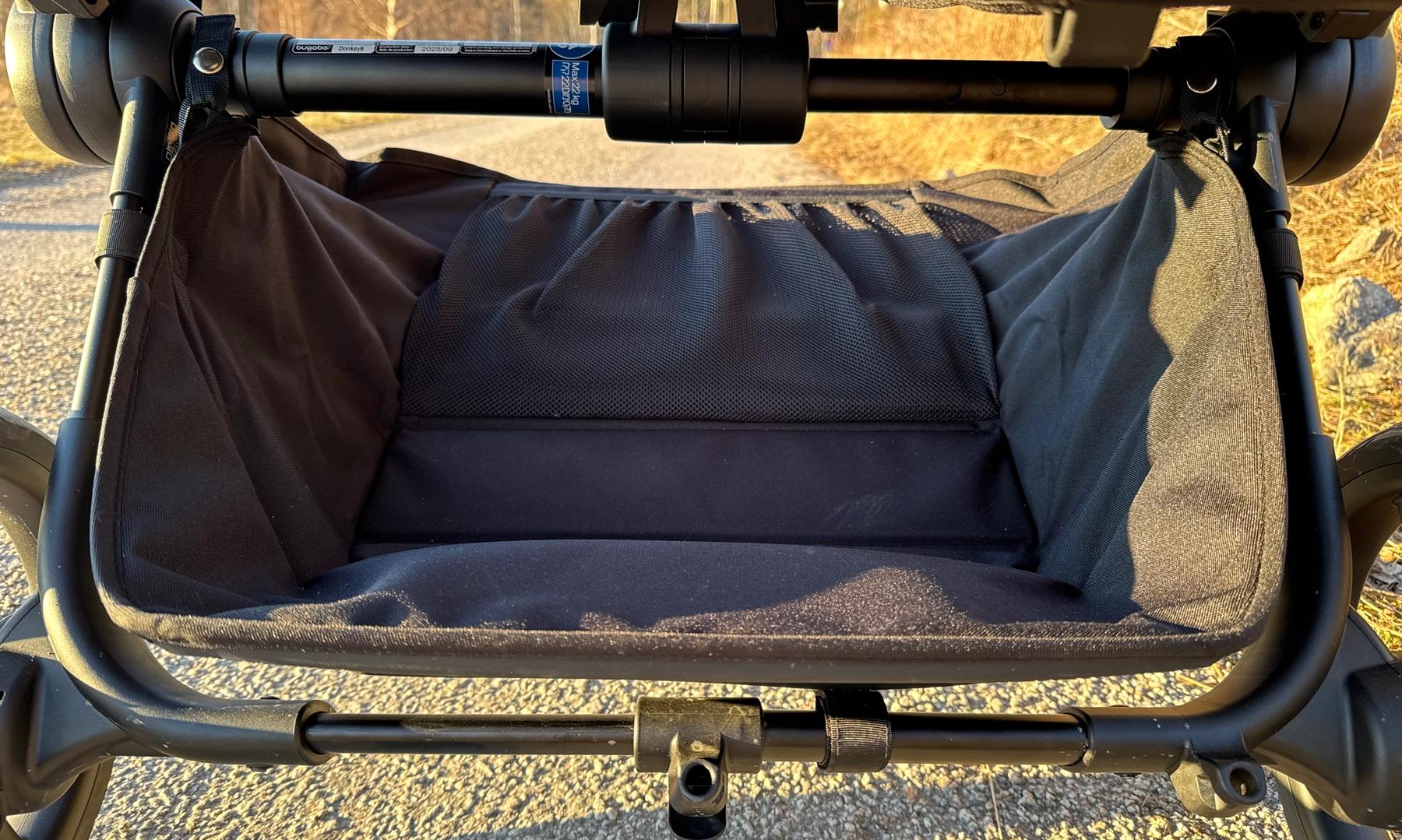 Varukorgen har blivit större än på tidigare modeller. Den är densamma både i enkel- och dubbelvagnsläge, den dras med när chassit blir bredare. Den har fått en ny design och rymmer mycket mer i 6:ans modell. Jag gillar att den fått som ett skydd baktill mot bakaxeln, den känns inte riktigt lika öppen längre.
