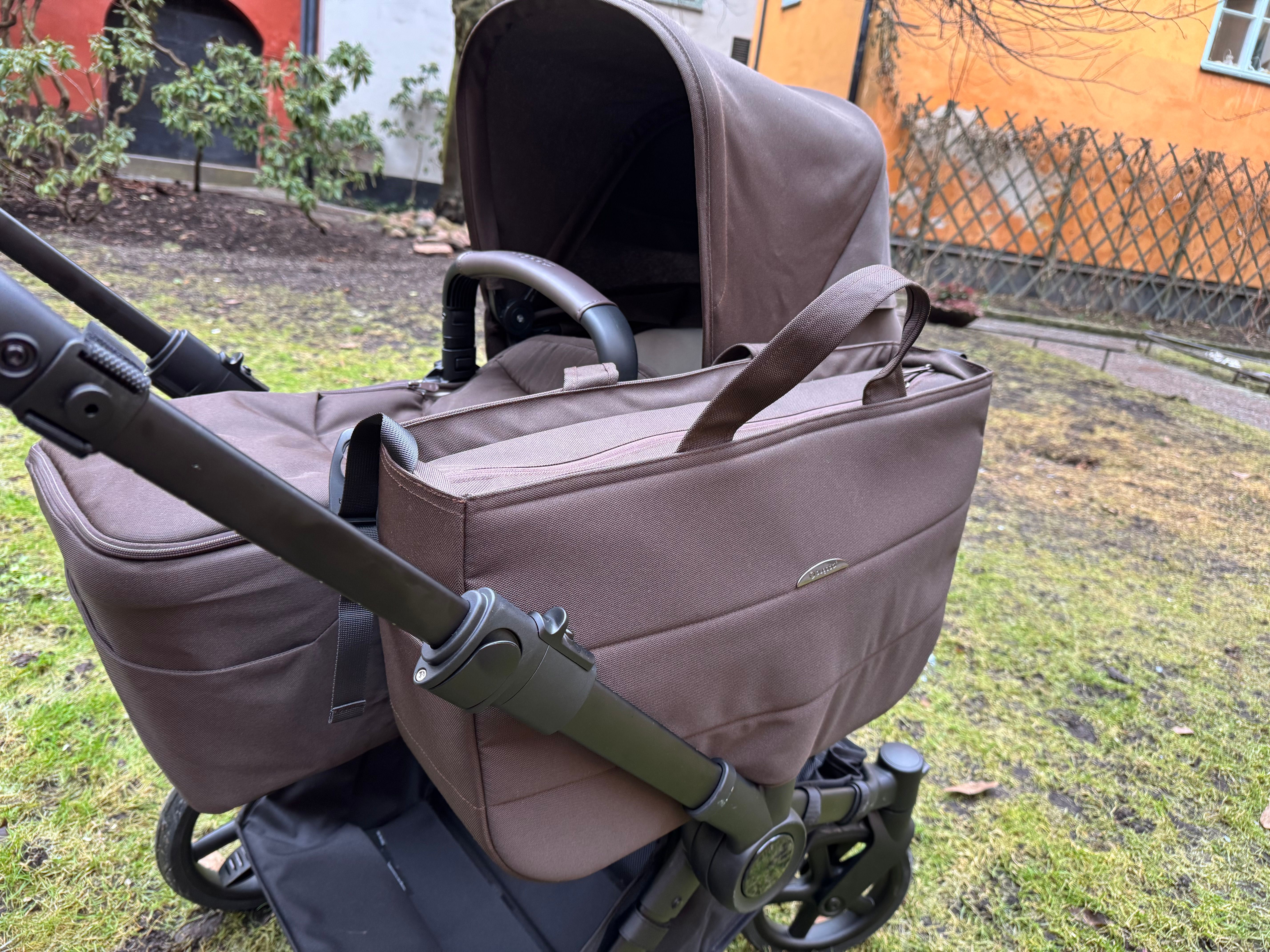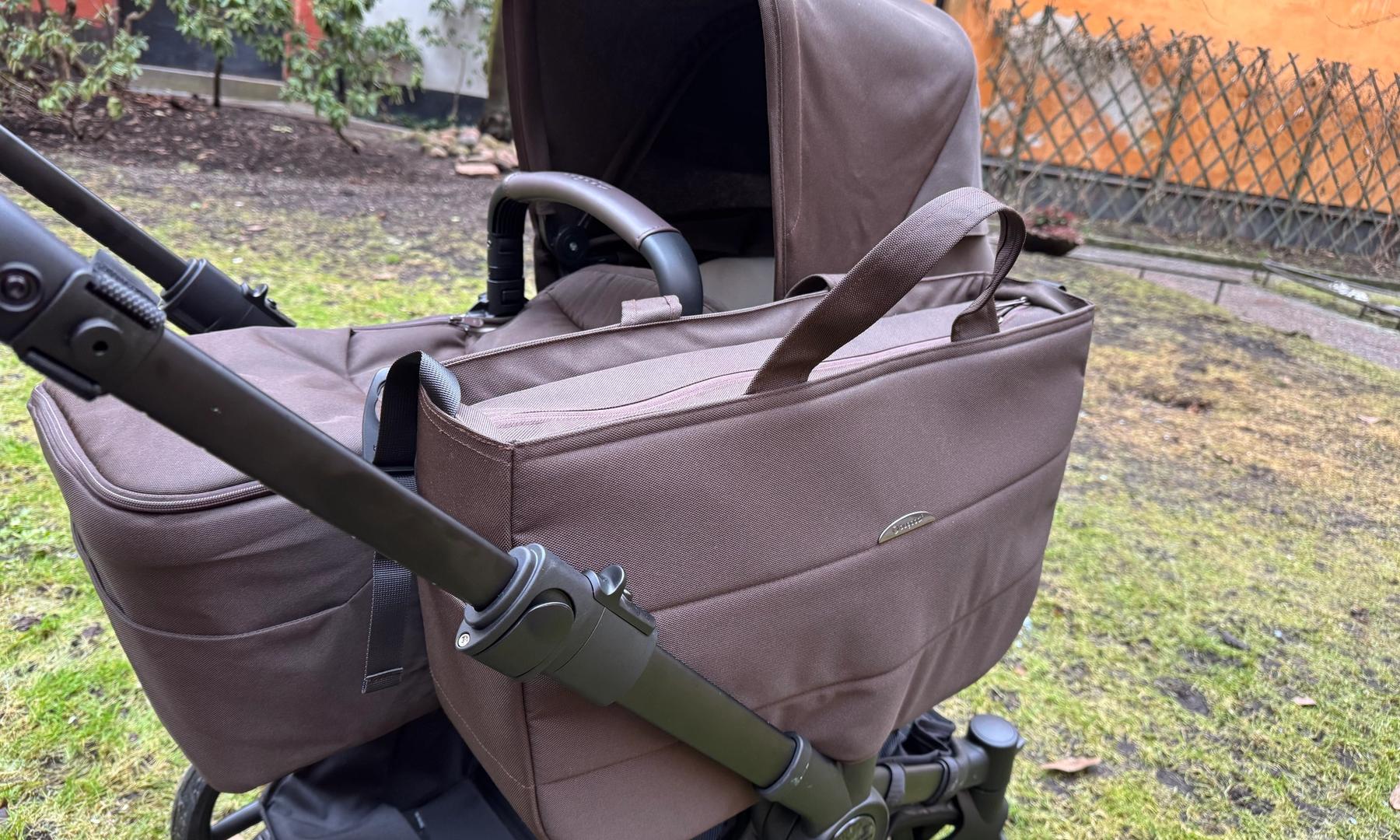 På sidoväskans sidor finns inbyggda fästen för att montera väskan på handtaget. Detta är bra ifall du rullat vagnen i monoläge och sedan vill använda den i duoläge, t.ex. för att hämta syskonet på förskolan. Då kan man med hjälp av ett par fästen som man fäster med kardborre på handtaget sätta fast sidokorgsväskan där. Dock får väskan endast väga 4 kg på handtaget men då kan man lägga över saker i varukorgen om man packat den tyngre.