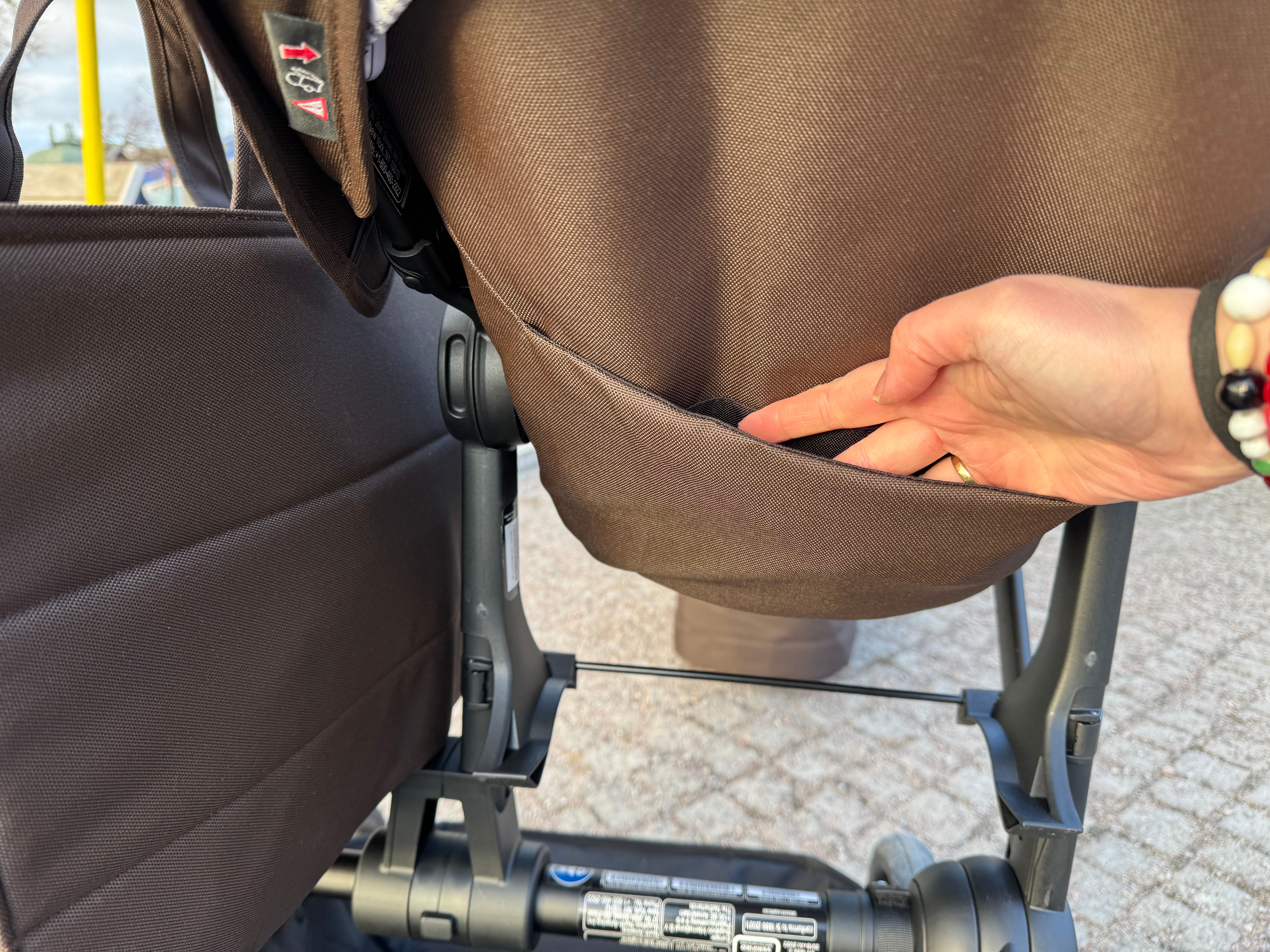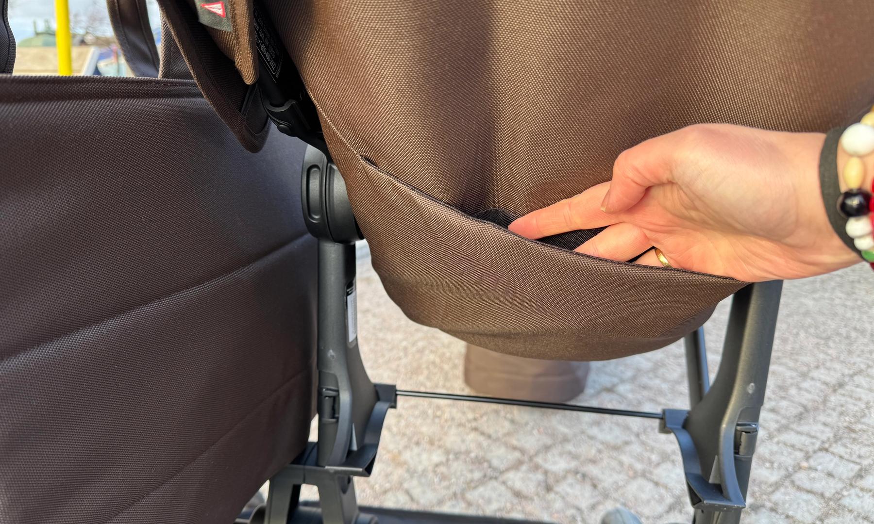 På baksidan av ryggstödet finns en förvaringsficka. Passar för ett litet paket våtservetter, näsdukar eller en liten bok eller liknande.