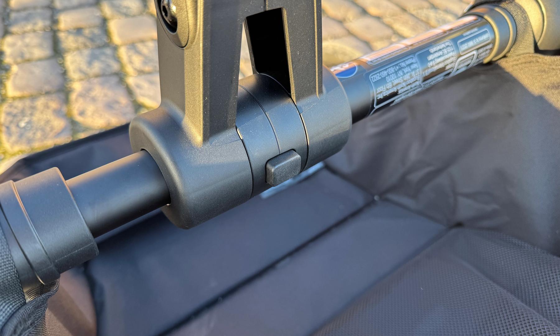 Handtaget är ett teleskophandtag och är ställbart i 11 olika lägen. Det lägsta läget är 89 cm och det högsta är 105 cm. Jag gillar det översta läget, men även de två under använder jag ibland. Ingen risk att slå i bakaxeln trots mina 183 cm. Det lägsta läget är mycket bra om man ska åka i trånga hissar eller förvara vagnen i t.ex. hallen och utrymmet är begränsat. I nedersta läget är handtaget innanför ligg-/sittdelsramen och gör att vagnen blir så liten den kan.