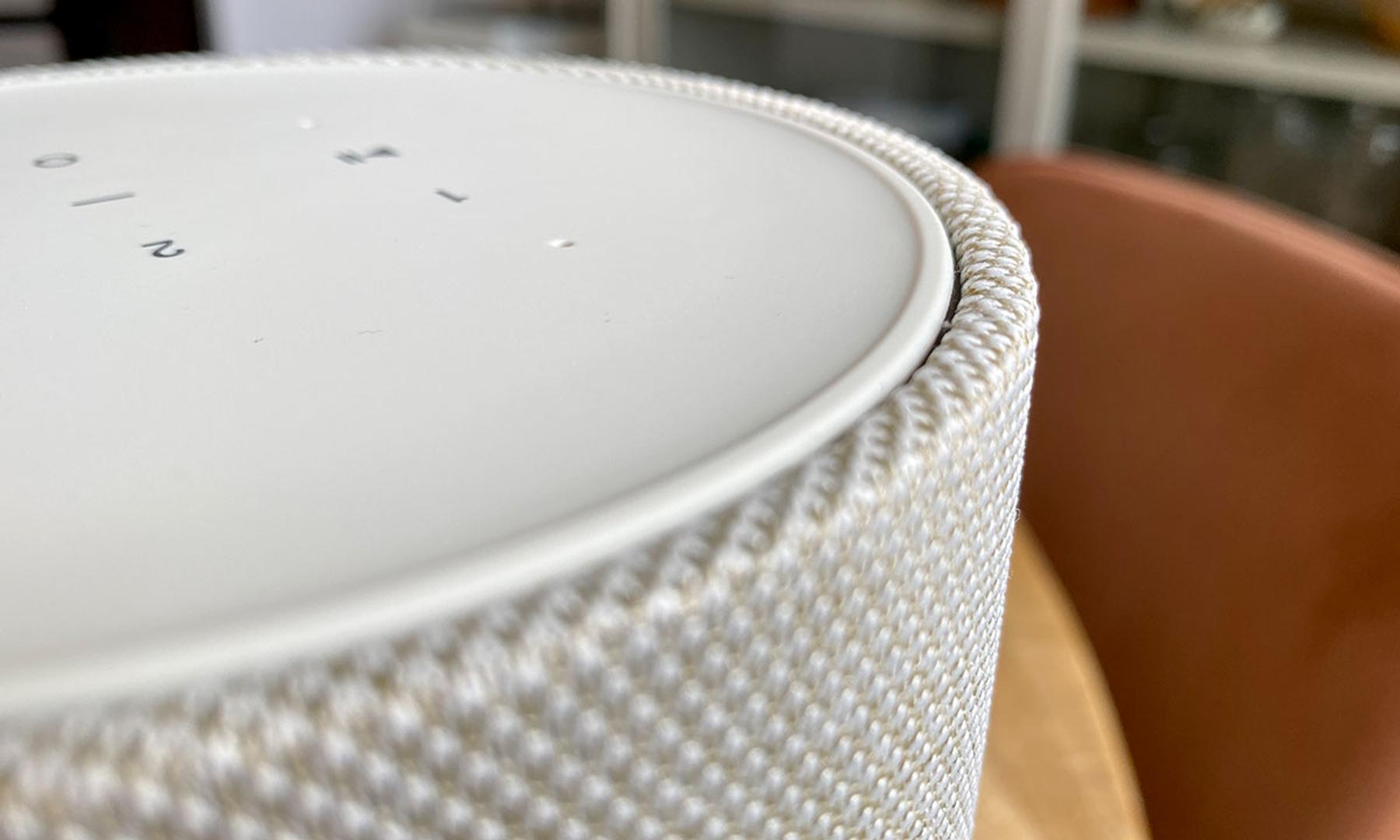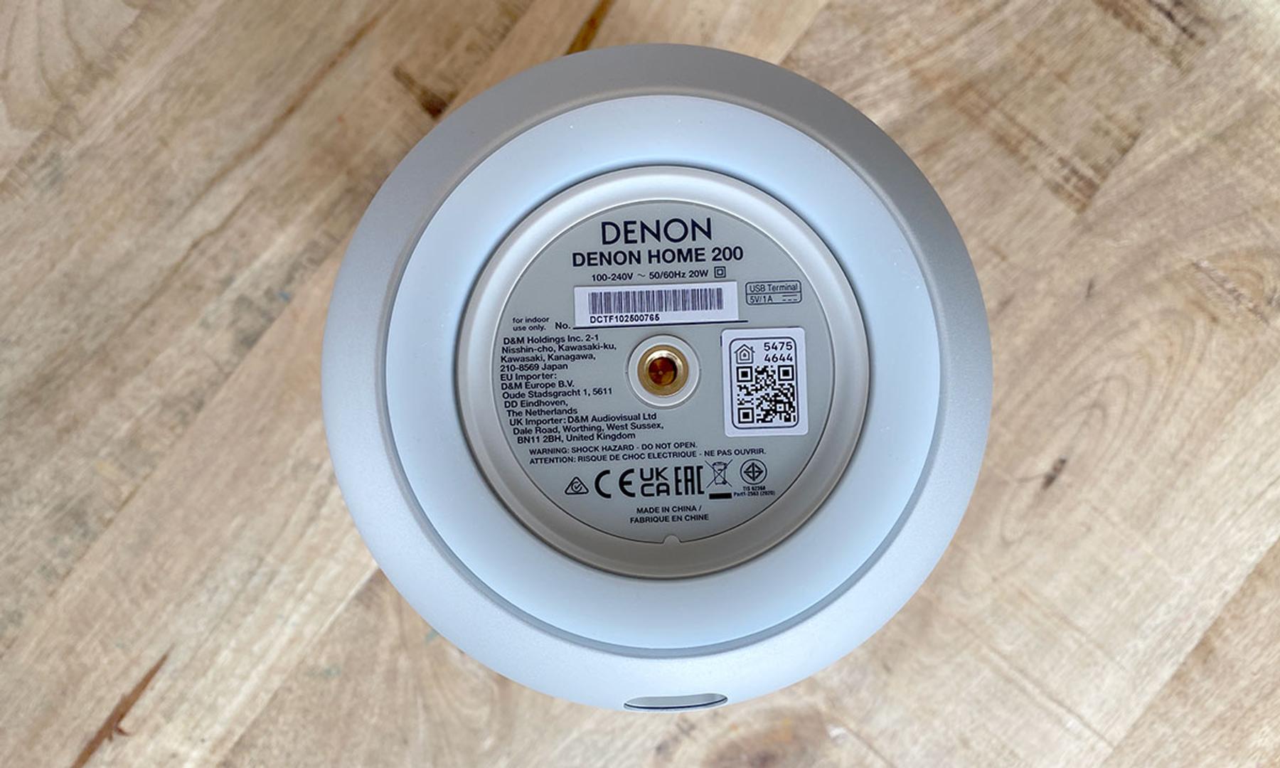 För att börja på utsidan är Denon Home 200 en riktigt stilfull skapelse med en ganska diskret design bestående av ett omslutande tygmaterial tillsammans med ordentlig plast i nederkant och en gummerad botten för stadig placering. Utseendet drar utan tvekan tankarna till Sonos Move 2-högtalare. Vilket subjektivt inte är att betrakta som något negativt och här tycker jag dessutom att Home 200 drar det längsta strået då den är mer ”möbel-lik”.