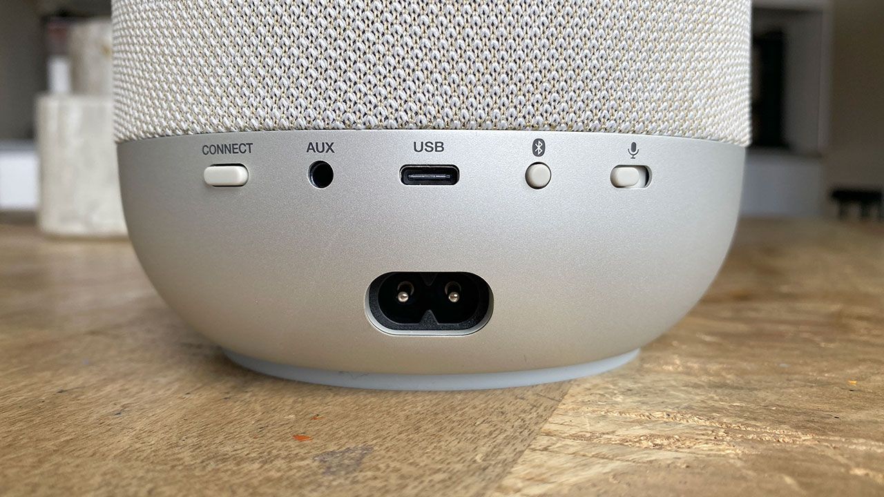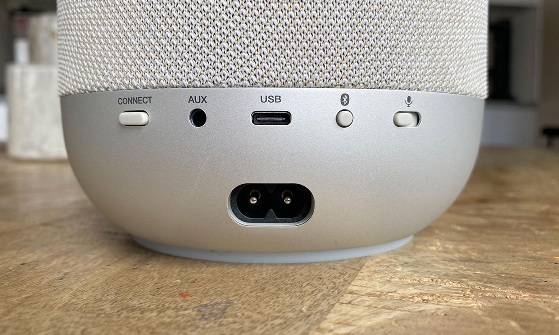 Färgmässigt kommer Home 200 i en mörk och en ljus variant, där jag testat den senare av de två. Bakpå högtalaren finns, bortsett från en strömanslutning, en knapp för att ansluta högtalaren till ett nätverk, en AUX in-port (titta Sonos, det går att ha den inbyggd!), en USB-C-anslutning, en Bluetooth-knapp och ett reglage för att aktivera eller stänga av de inbyggda mikrofonerna. Själva anslutningen görs primärt via Wi-Fi men det går att köpa till en USB-C till nätverksadapter om trådad inkoppling är att föredra.