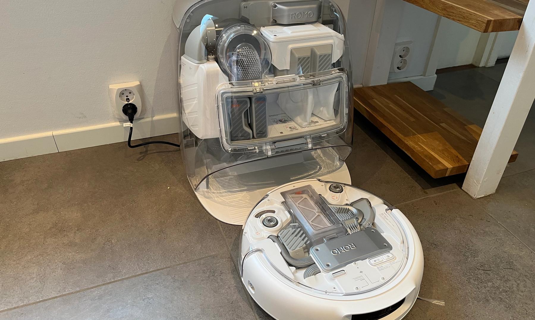 Redan i kartongen märker man ambitionen: basstationen är stor och robust, den är hjärtat i systemet och signalerar att ROMO P är byggd för att ta ett helhetsansvar för städning, inte bara för enstaka dammsugningar.