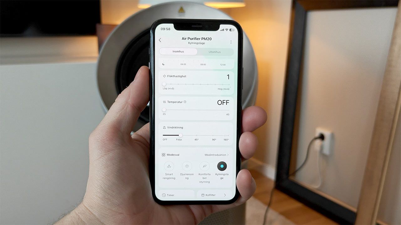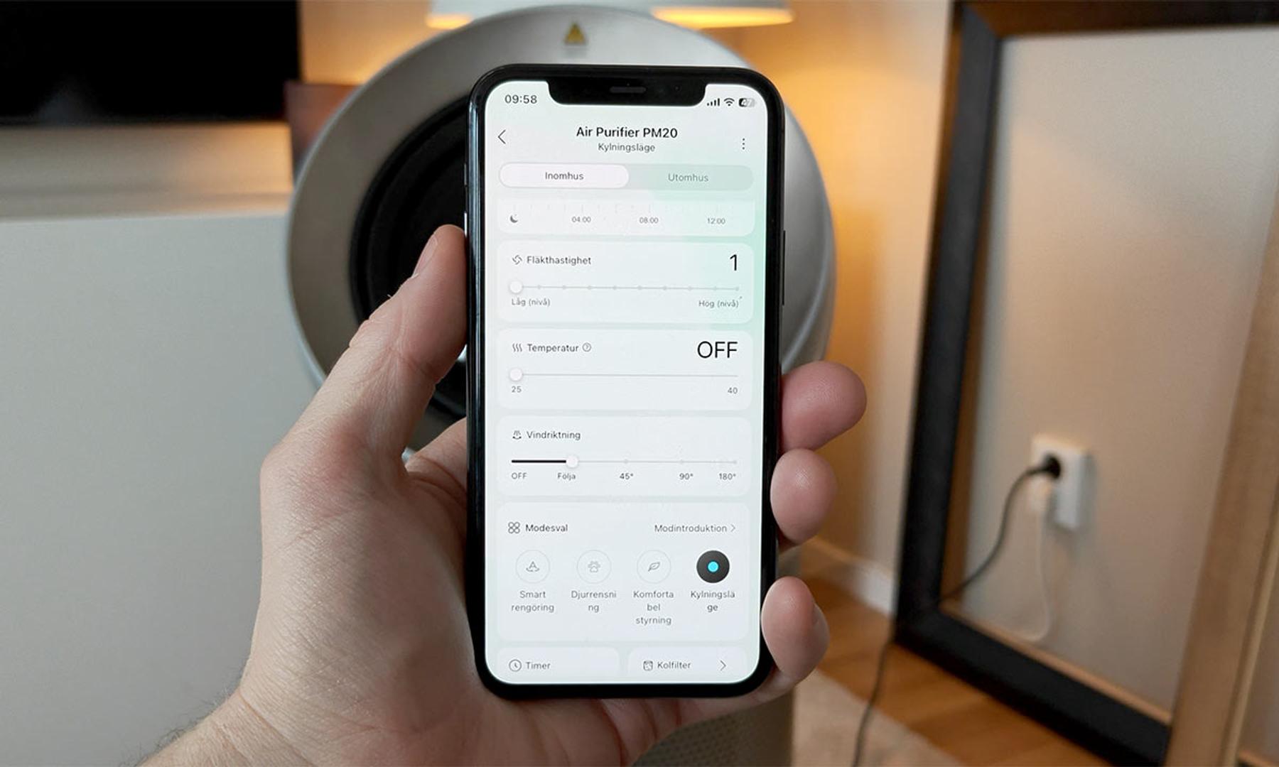 I fallet med appen är det mesta däremot väldigt tydligt när det kommer till att välja typ av luftrengöringsläge, justera fläktstyrka och temperatur (i fallet att du önskar få rummet uppvärmt). Bortsett från auto-läget, där enheten själv justerar fläktstyrkan för att få till så ren luft som möjligt, finns även ett djur-läge där det mesta går på max samt ett sovläge där belysningen dämpas och fläkthastigheten hålls så låg som möjligt. Inbyggt finns dessutom en timer samt möjlighet att justera utluftsriktningen upp till 180 grader i en oscillerande rörelse. Här går det som sagt också att låta PM20 själv snurra på toppen och följa aktiviteten i rummet, något som faktiskt fungerar ganska bra. Även om funktionen som sådan kanske är lite av en gimmick.