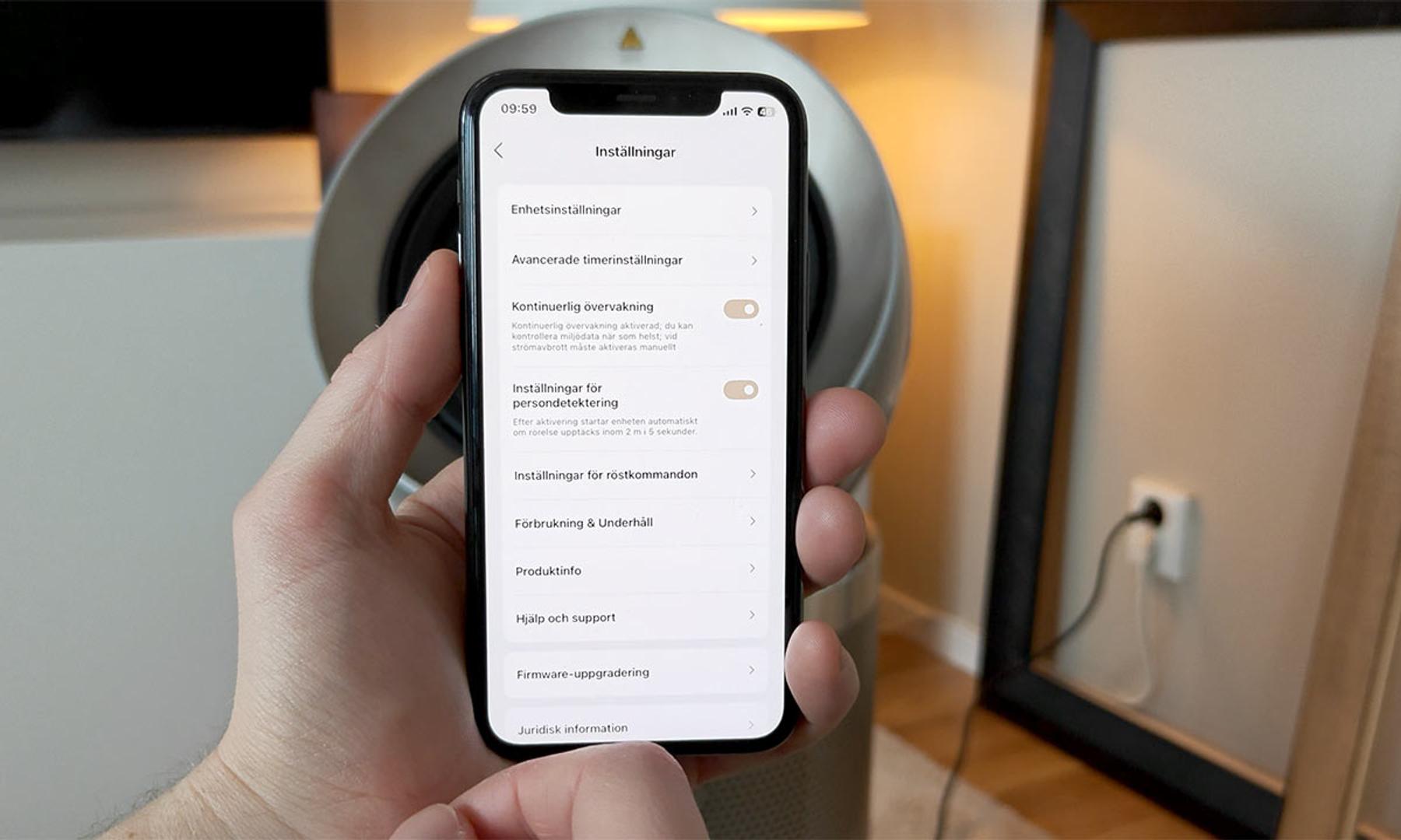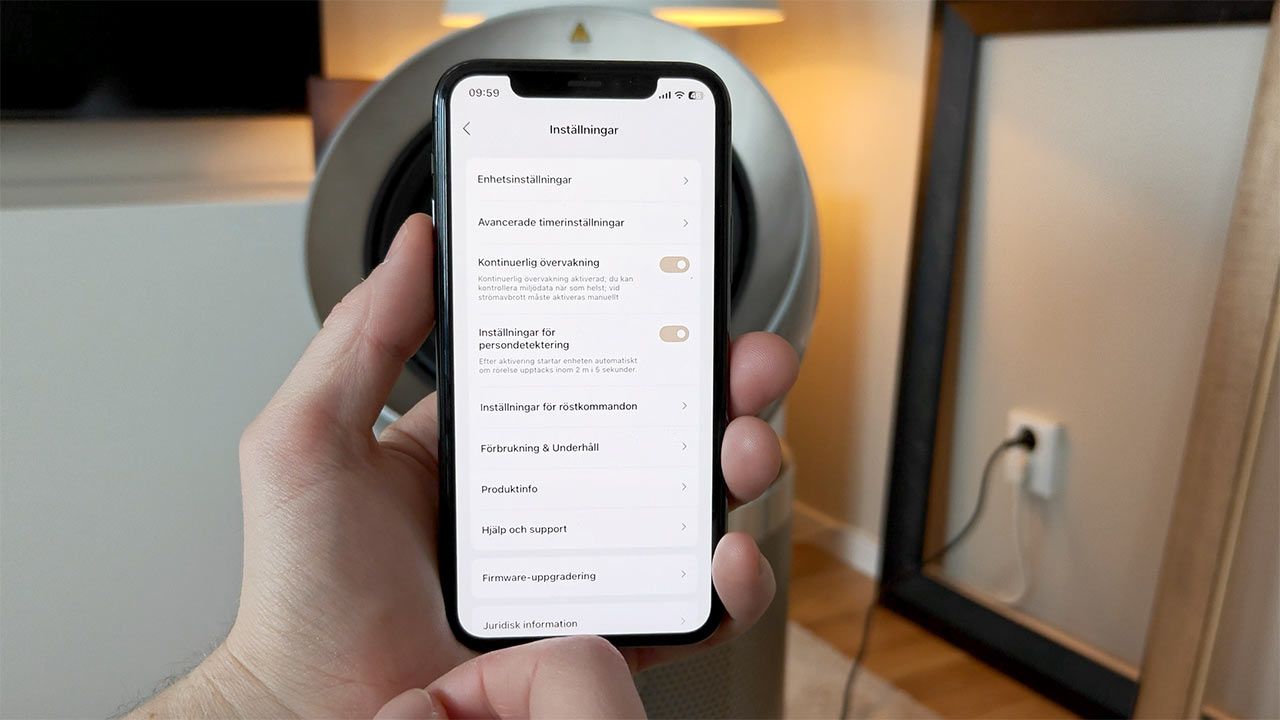 Här går det också att snabba på processen genom att öka hastigheten hos fläkten, som i autoläget och vid dessa, förhållandevis låga, föroreningsnivåer i stort sett är ljudlös. Att köra fläkten på maxhastighet är däremot inget man vill göra en längre tid. Men något extremt ljud är det inte tal om och dessutom går det att flytta ganska ordentliga mängder luft där det riktade flödet känns tydligt flertalet meter från luftrenaren. Både avseende varm och rumstempererad luft.