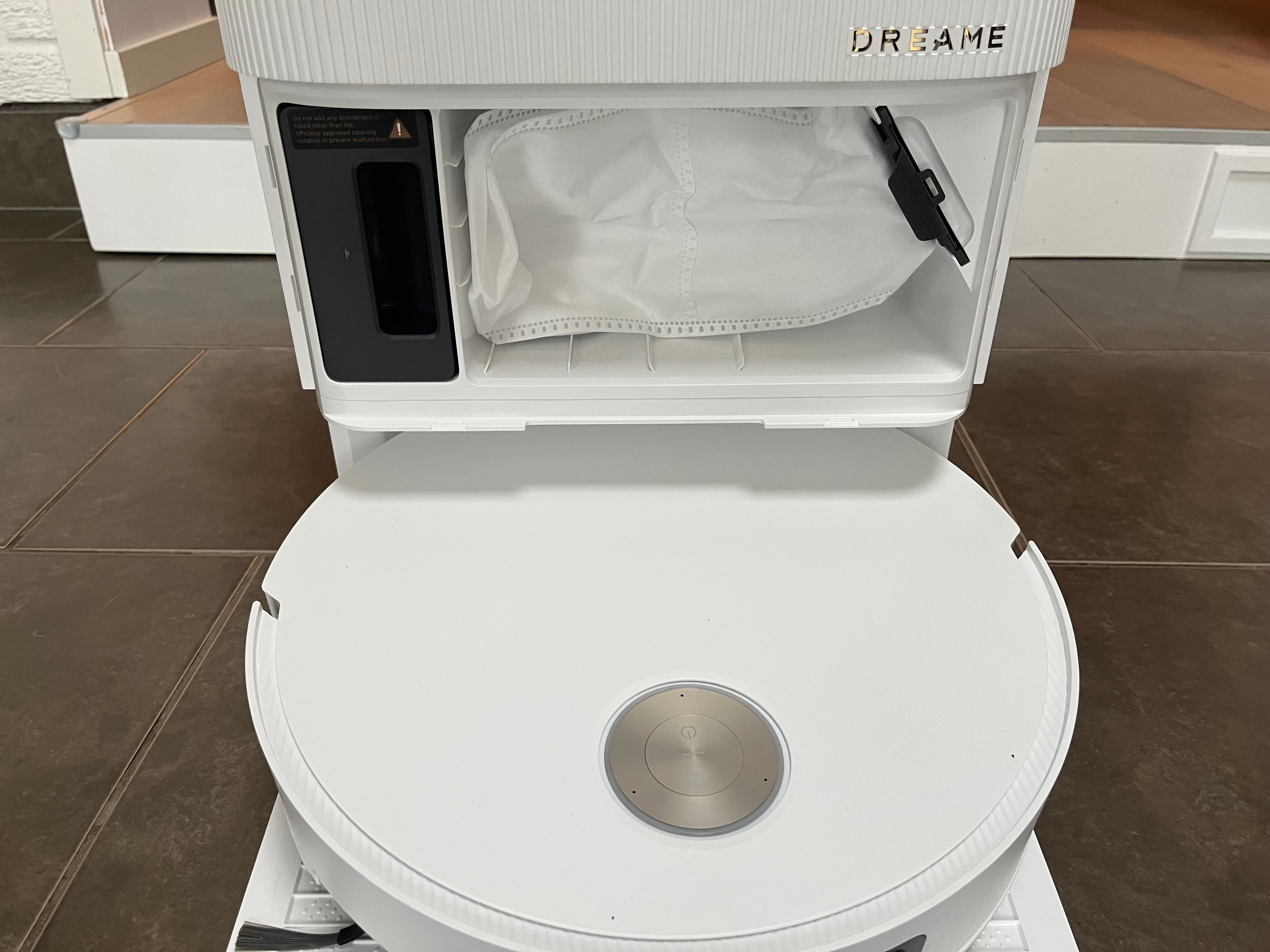 Efter avslutat städpass töms robotens dammbehållare automatiskt i stationens interna dammsugarpåse. Nyheten med X50 Ultra Complete är att stationen använder UV-ljus för att bekämpa bakterier både i dammsugarpåsen och på moppdynorna. Hur effektivt detta är svårt att testa, men Dreame hävdar att bakterierna minskar med 99,98 %.
