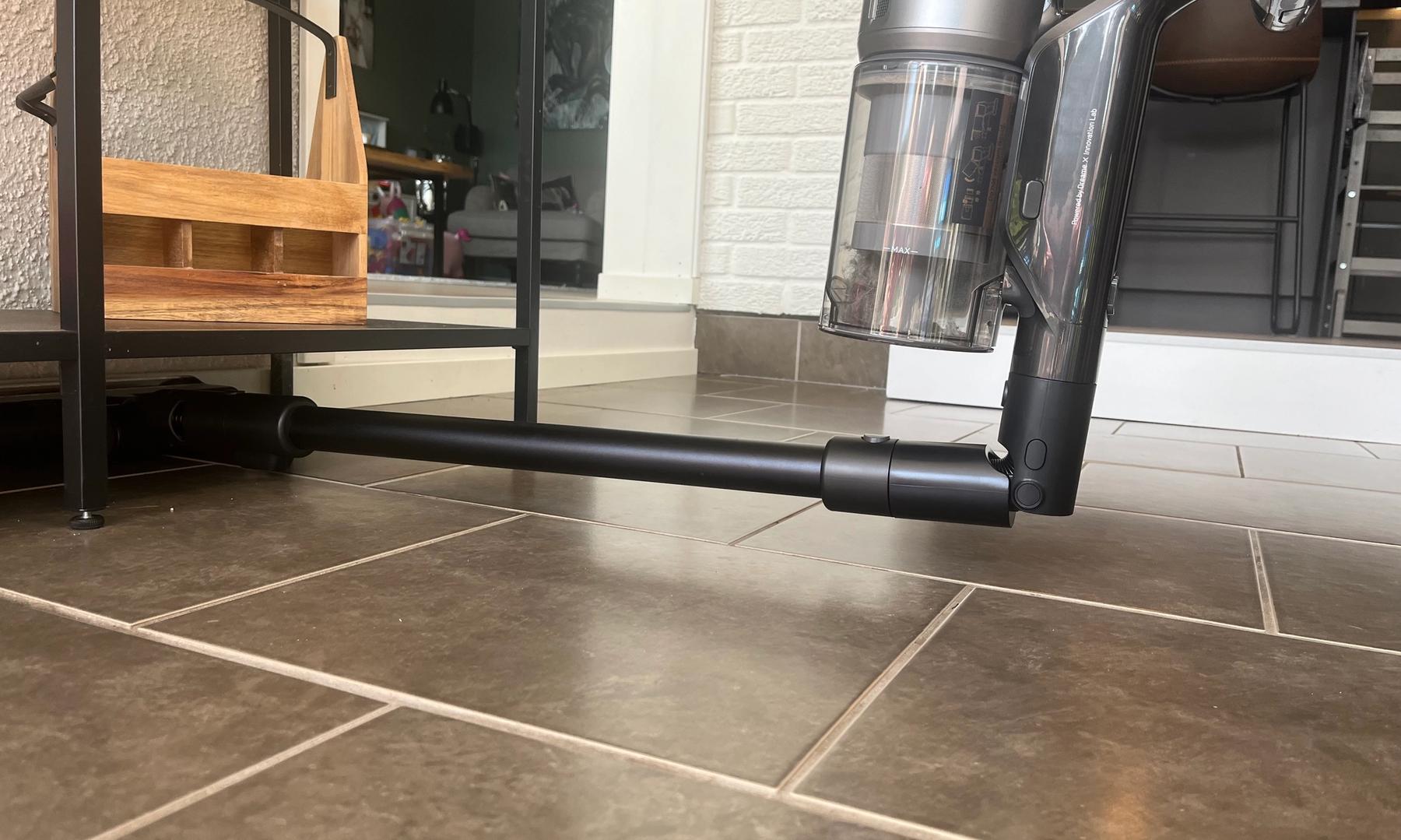 När man sedan kommer till den långa möbeln, trycker man på knappen på sidan och adaptern fäller röret 90 grader så att man kommer under. Detta sker dock så långt upp på dammsugaren att jag, trots mina långa armar, fortfarande behövde böja mig ner för att komma under möbeln med dammsugaren.