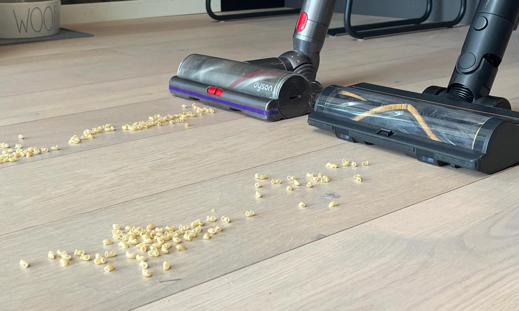 Första testet bestod av att dammsuga något större objekt, liknande småsten, nämligen snabbmakaroner. Båda dammsugarna presterade lika bra och lyckades inte få upp allt på första svepet, utan tog resten vid det andra. Dreame Z30 har en större öppning i munstycket för den här typen av smuts (Dyson har två öppningar, men de sitter mer ut mot sidorna).