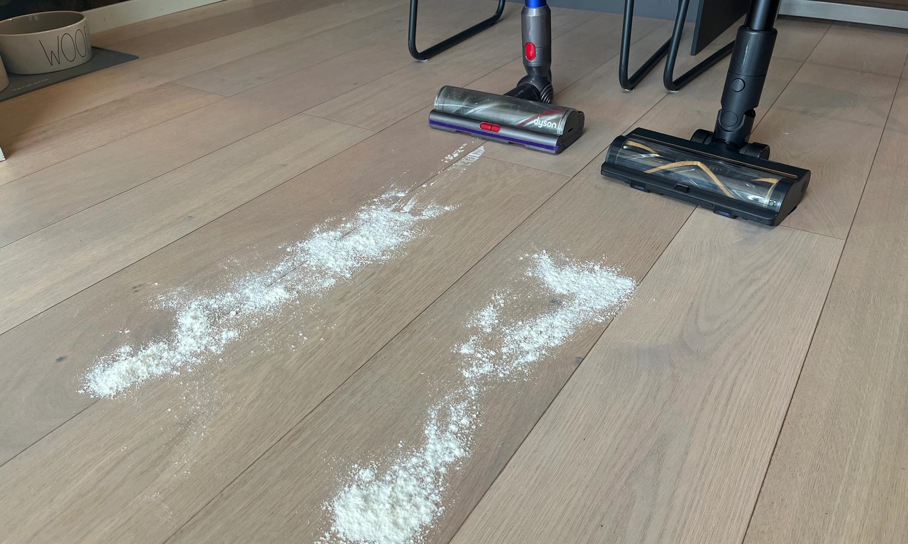 Det andra testet bestod av att dammsuga upp mjöl för att se hur de hanterade finare damm. Här presterade Dreame Z30 bättre än Dyson tack vare sin smutssensor som automatiskt ökar sugeffekten och får upp allt mjöl på första försöket. En annan fördel med Z30 är de två gröna lamporna i munstycket som lyser upp ytan framför dammsugaren, vilket gör att smutsen syns bättre och minskar risken att missa något.