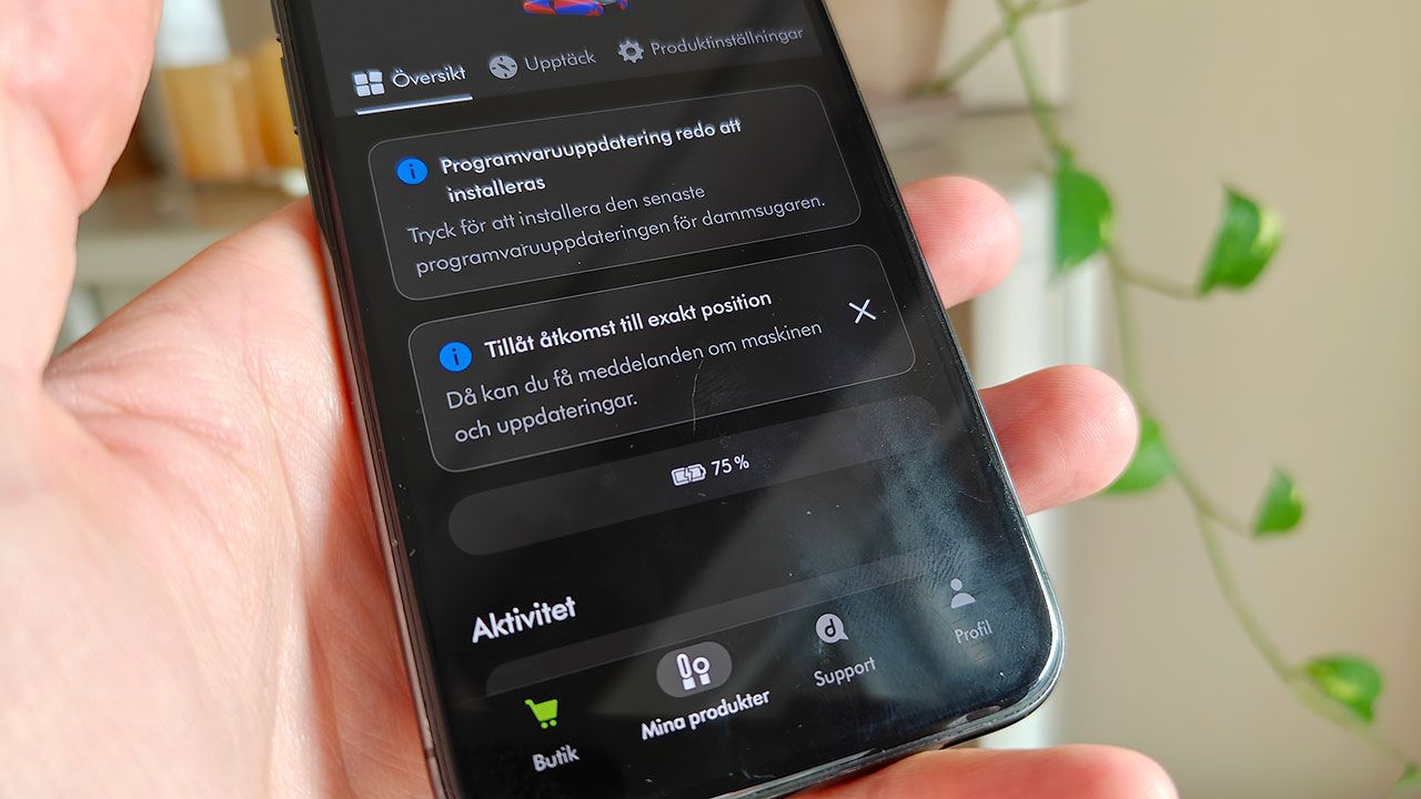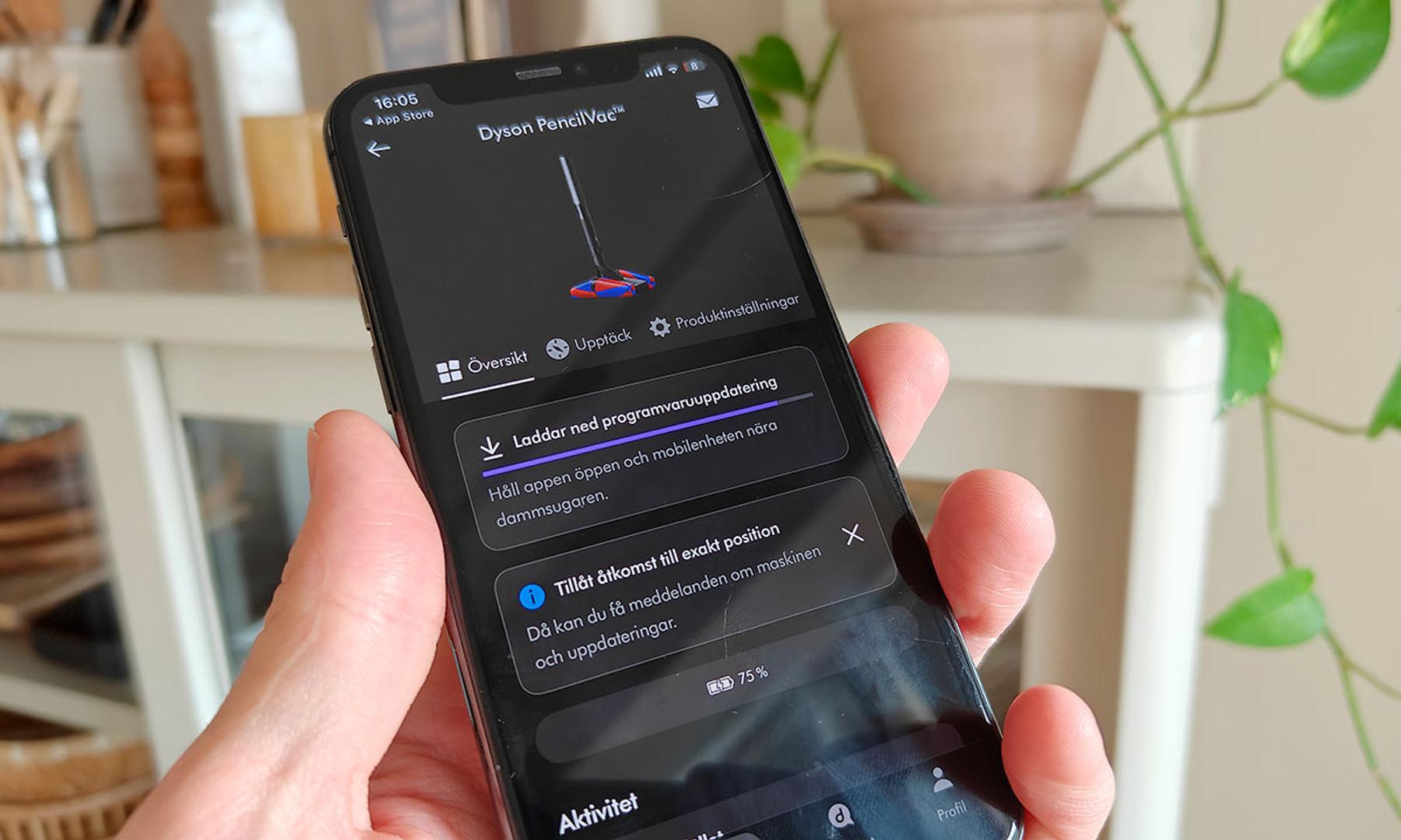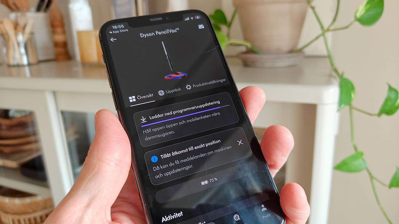 I regel brukar dammsugare bara behöva packas upp och startas. Vilket nästan är sant i fallet med PencilVac. Innan man får möjlighet att använda något annat än Eco-läget behöver den dock (som en engångsföreteelse tack och lov) anslutas till en telefon via Bluetooth och registreras i Dyson-appen. En mycket lustig process om du frågar mig. Här kräver appen också tillgång till precis positionering för att kunna ”…ansluta till din maskin och hålla den uppdaterad med de senaste funktionerna.”. Nej, låt mig kunna dammsuga utan Bluetooth. Sen kan jag heller inte tänka mig att PencilVac bryr sig ett dugg om jag befinner mig i Luleå eller på Gotland. Dyson får däremot garanterat ett större bibliotek av användardata.