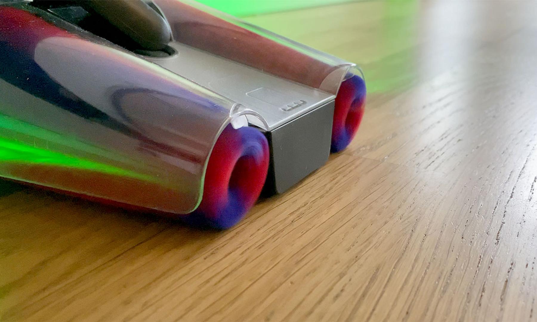Här snurrar de fyra konformade borsthuvudena på åt motsatt håll vilket tillsammans med de extra hjulen på undersidan och den låga vikten om 1,8 kg skapar en väldigt lättglidande upplevelse där alltsammans nästan flyter fram över golvet, dessutom oavsett riktning. Då borstarna också sträcker sig någon millimeter utanför plasthöljet kommer hela pjäsen åt ordentligt nära lister och kanter. Något som tillsammans med den minimala designen som sådan resulterar i en supersmidig användning. Däremot är det värt att nämna att borstarna, som ett resultat av den icke-rektangulära designen, inte kommer åt helt perfekt i hörn.