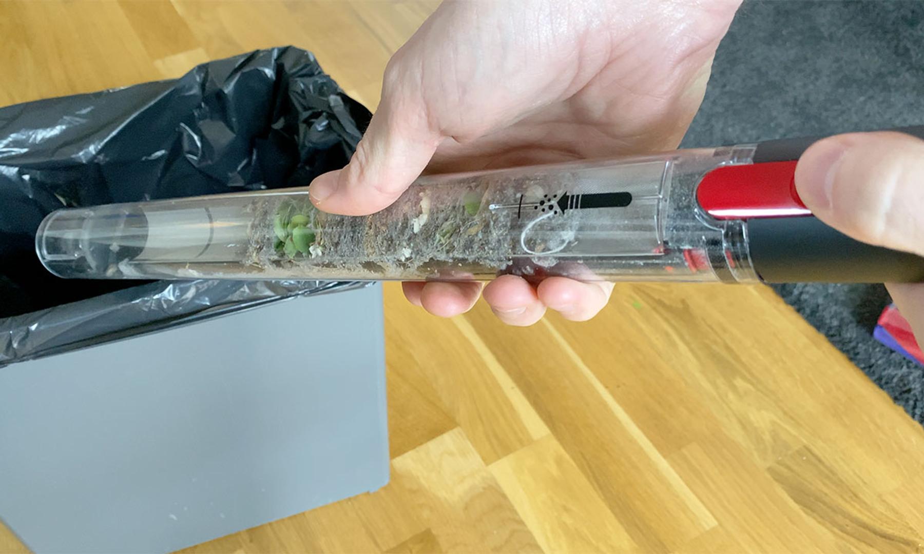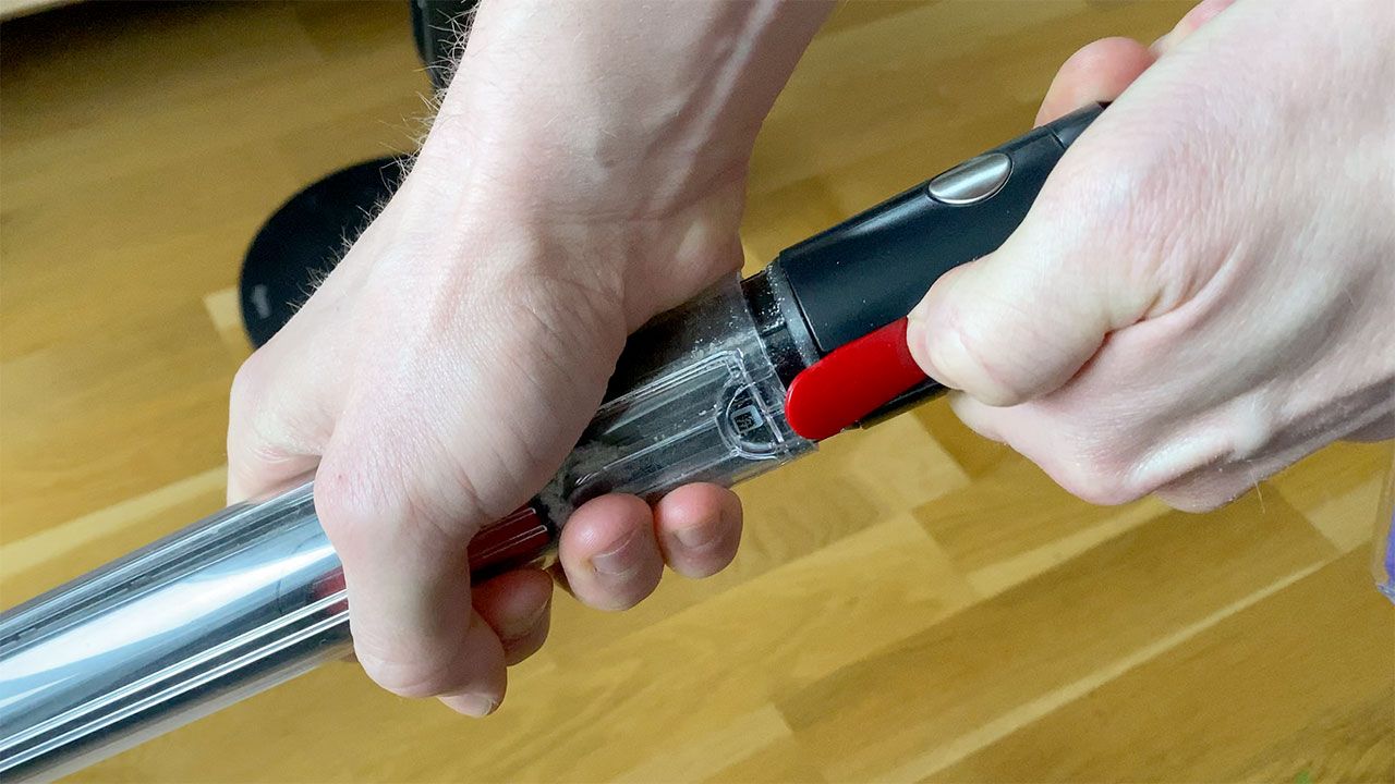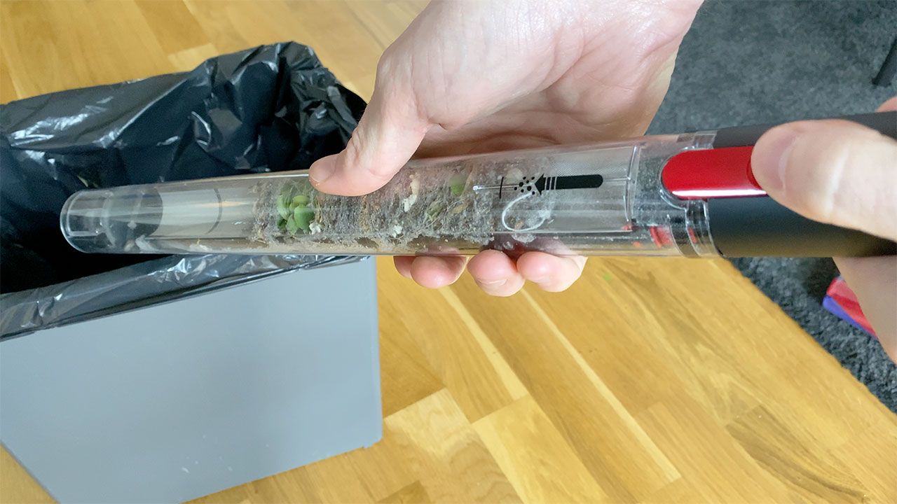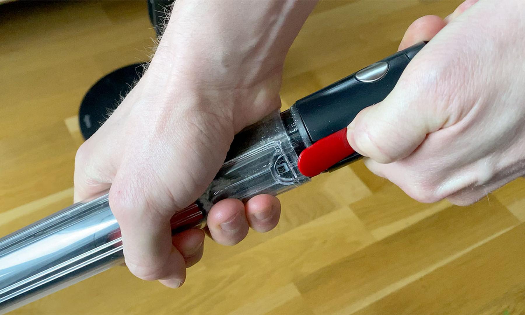 Tömningen är annars ganska innovativ och involverar att man trycker ut dammet i nederkant genom att dra det yttre röret på dammbehållaren över de inre delarna. En process som därtill lämnar förvånansvärt lite damm runtomkring sig jämfört med tömningen hos många andra skaftdammsugare.
