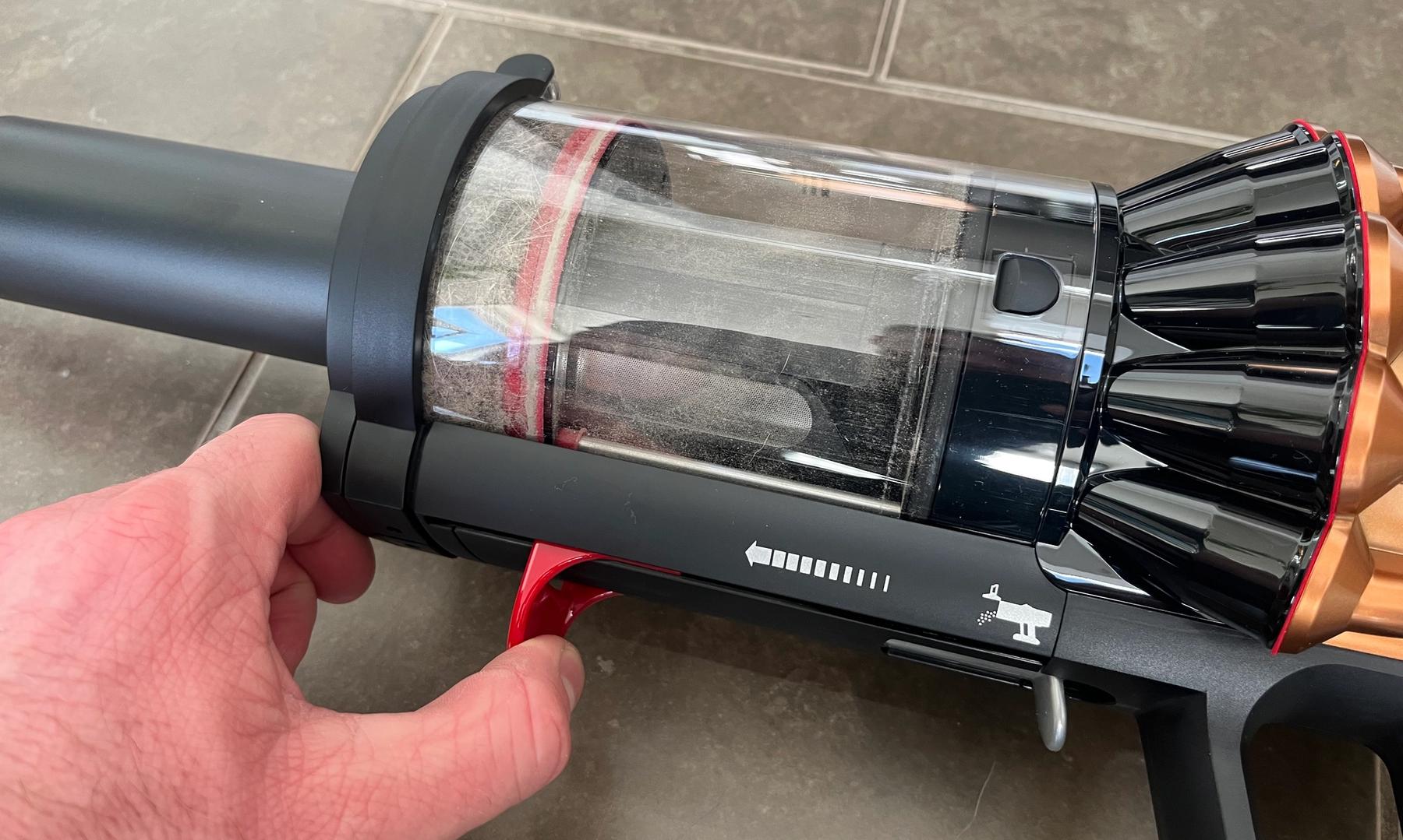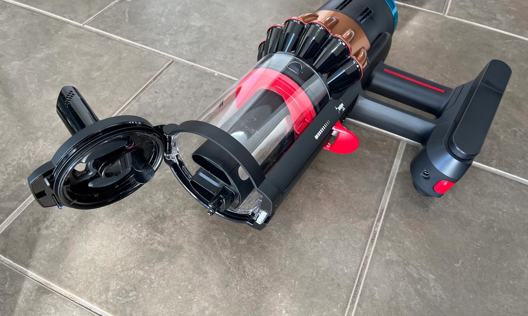 Nytt för V16 är dock det mekaniska kompressionsverktyget som medföljer. Det är ett litet, fjäderbelastat tillbehör som trycker ihop smutsen i behållaren efter städning. Det gör att du får plats med upp till 30% mer damm och hår innan du behöver tömma och det minskar risken för att partiklar virvlar upp när du öppnar locket.