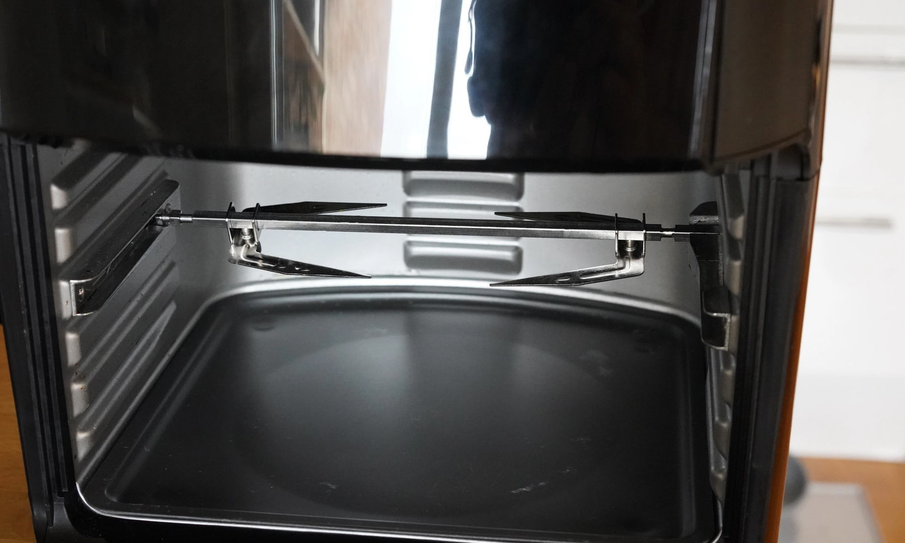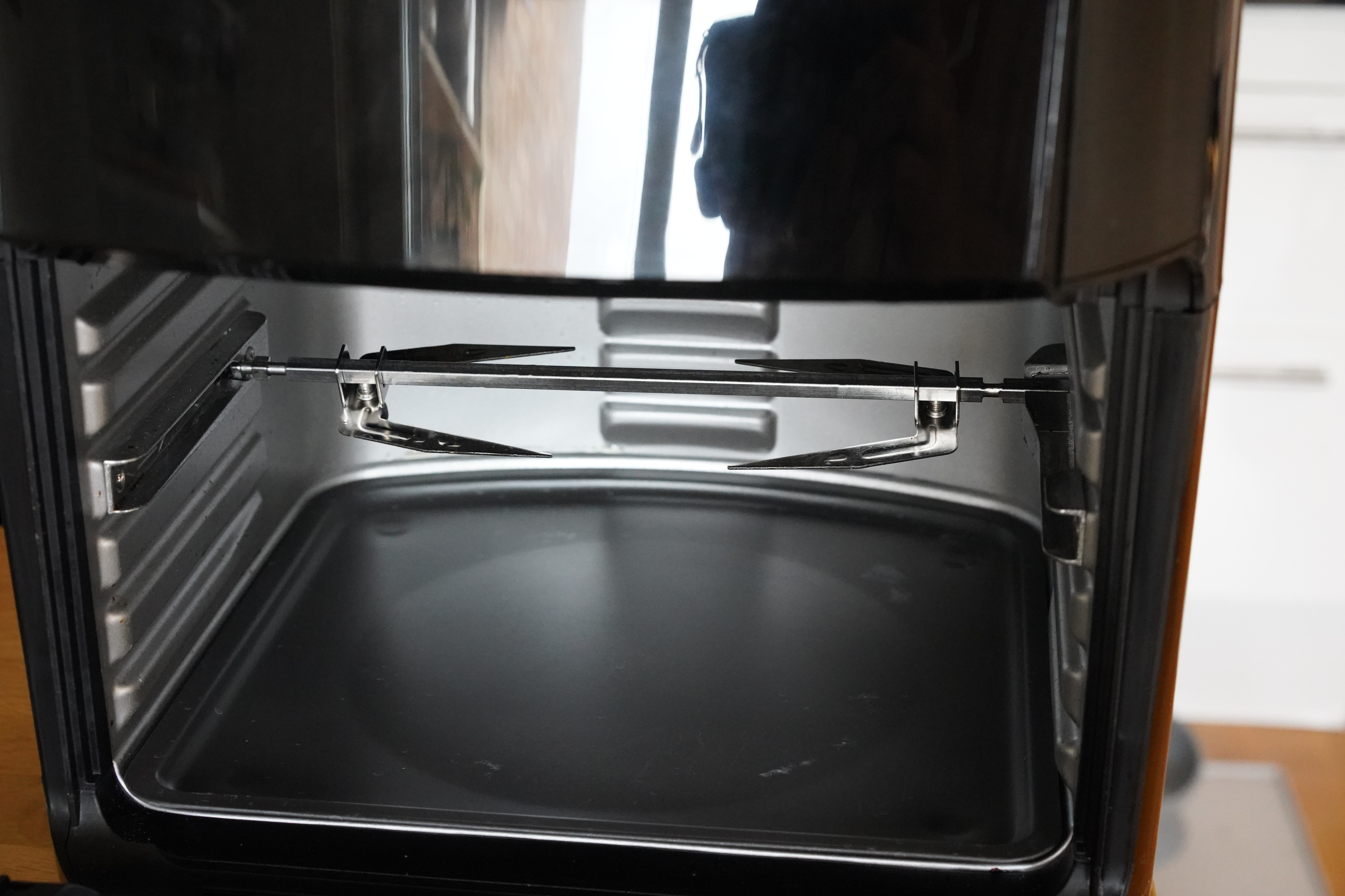 Det som får denna airfryer att sticka ut är att den har en inbyggd rotisseriefunktion. Alltså, med det medföljande verktyget (en stång med fästen) placerar du stången i mitten av airfryern och klickar in den i sidorna.