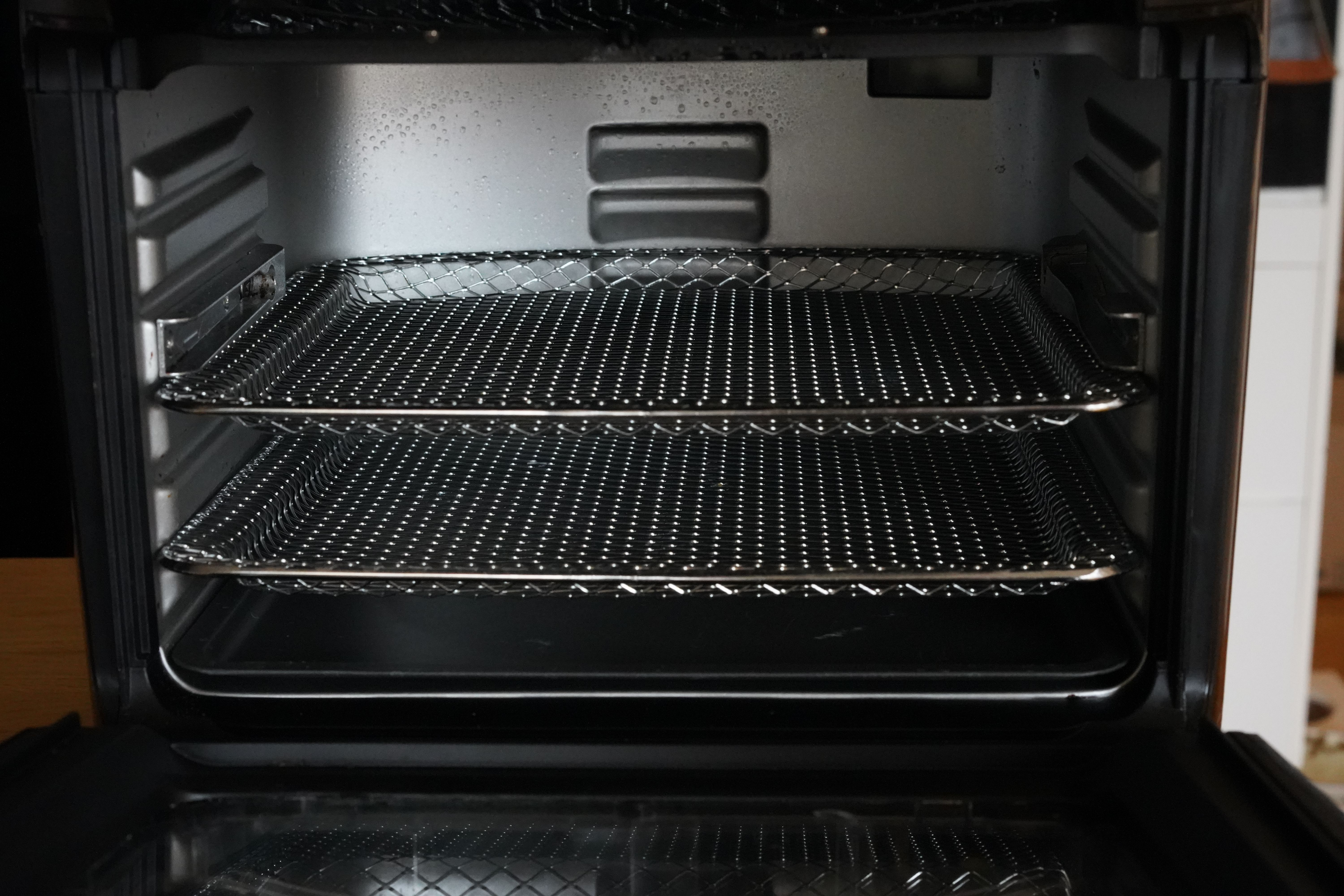 Den har våningar likt en ugn, den har liksom olika våningar och det du får med är en droppbricka, 2 nätvåningar (likt nätkorgarna vissa airfryers kan ha) och en ihålig ugnsform.
