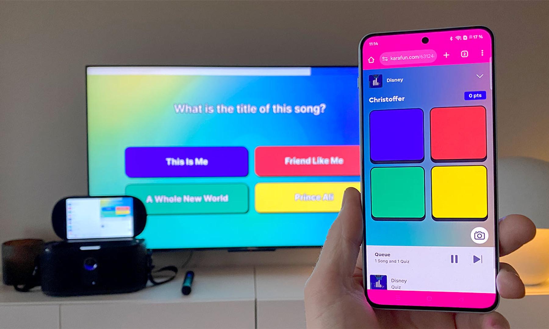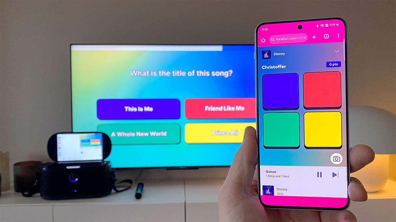 Det går också att scanna en QR-kod på skärmen och därefter kasta sig direkt in i att söka efter låtar och ställa dem i kö för uppspelning, justera uppspelningslaternativ eller vara med i nämnda quiz. Däremot ska man som sagt och absolut ha med sig att om det är KaraFun man vill åt, kommer det bli en merkostnad att fortsätta använda tjänsten. En lite tråkig parantes här är också att just quiz-delen, åtminstone i mitt fall, fått appen att krascha ett par gånger. Något som förtar mycket av trevligheten i funktionen.