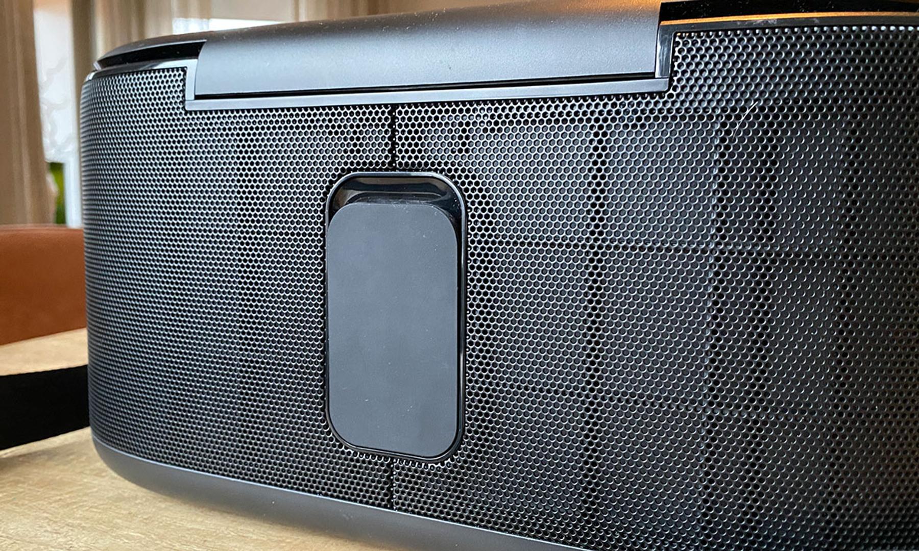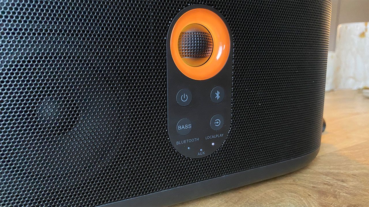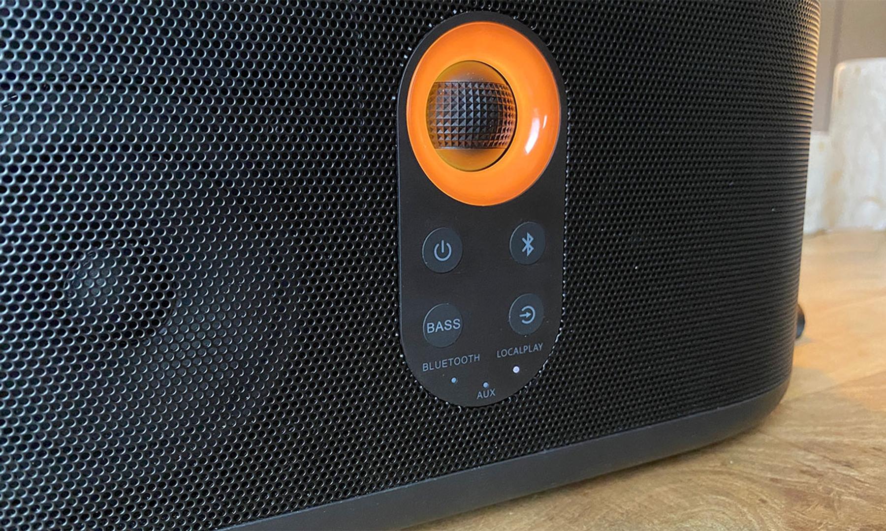 Frampå högtalaren finns ett stort snurreglage för volymjustering, en av- och på-knapp, en knapp för att aktivera eller stänga av bas-läget samt två knappar för att växla mellan olika inkällor respektive koppla in en Bluetooth-enhet.