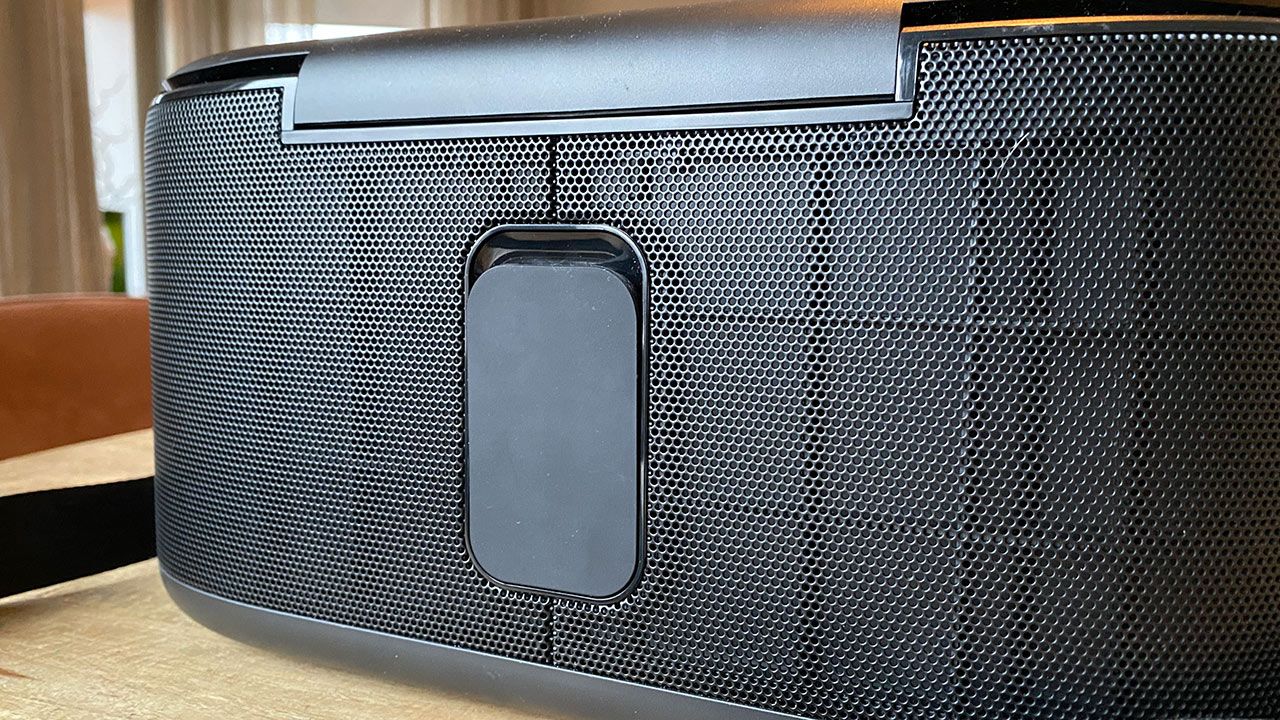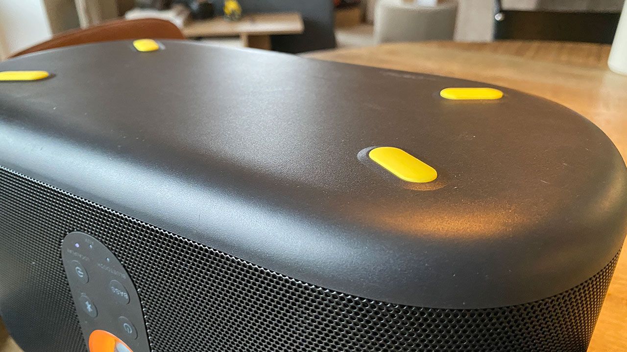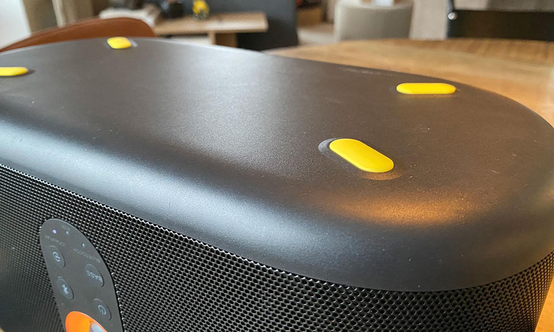 Frampå högtalaren finns ett stort snurreglage för volymjustering, en av- och på-knapp, en knapp för att aktivera eller stänga av bas-läget samt två knappar för att växla mellan olika inkällor respektive koppla in en Bluetooth-enhet.