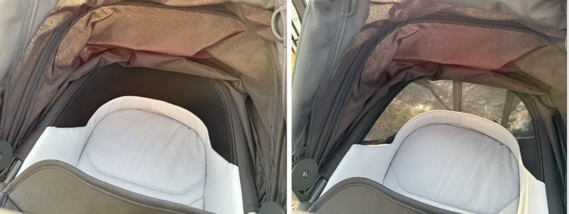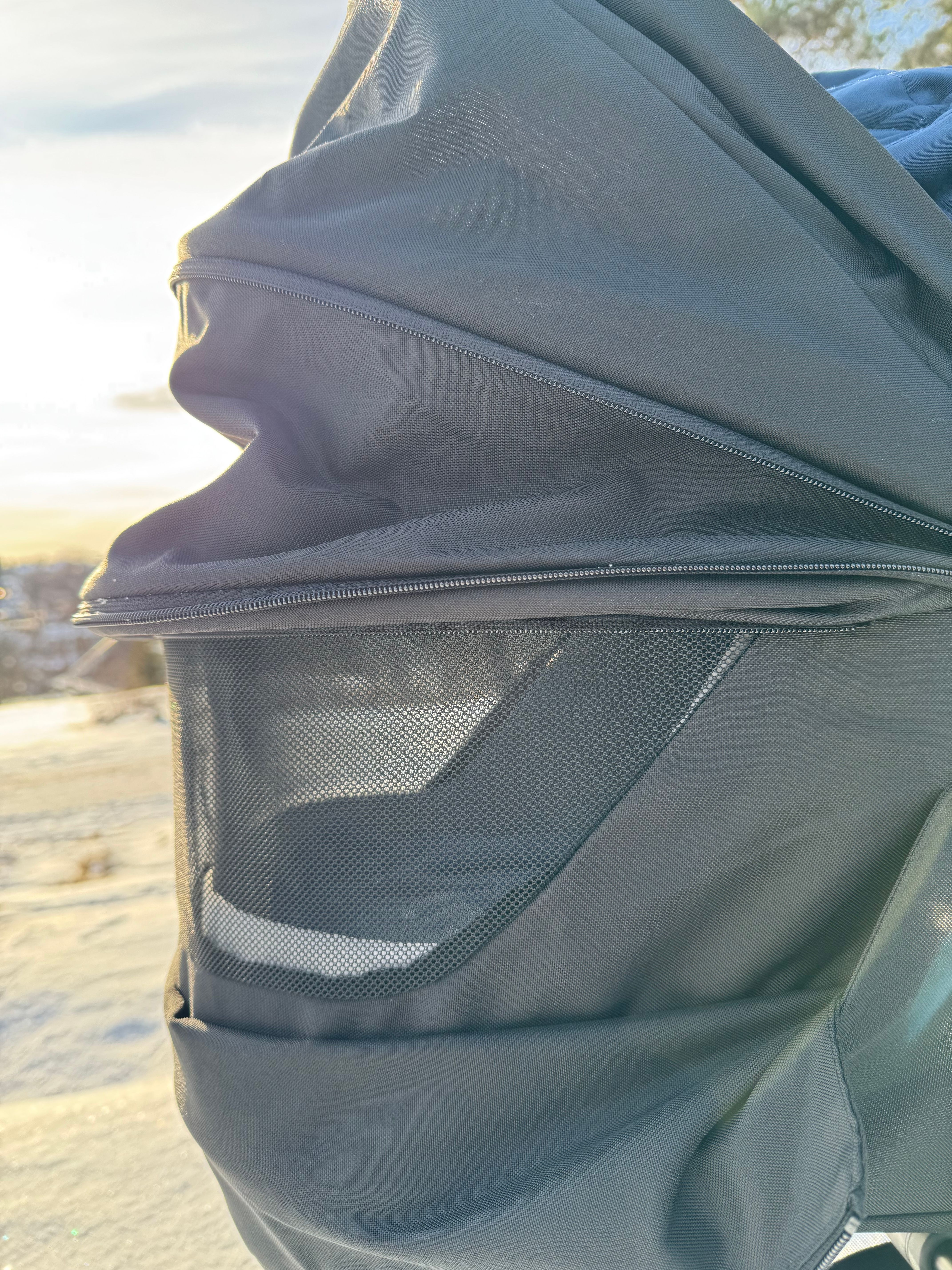 Liggdelen har en öppningsbar ventilationslucka i huvudänden. Det är en lucka som öppnas med en dragkedja och tyget viks ner. Jag hade önskat en ventilationslucka i mitten av liggdelen eller vid fötterna, eftersom solen skiner rakt in på barnets huvud på soliga dagar. Men det är ändå bra att kunna öppna upp för ventilation, såklart.
