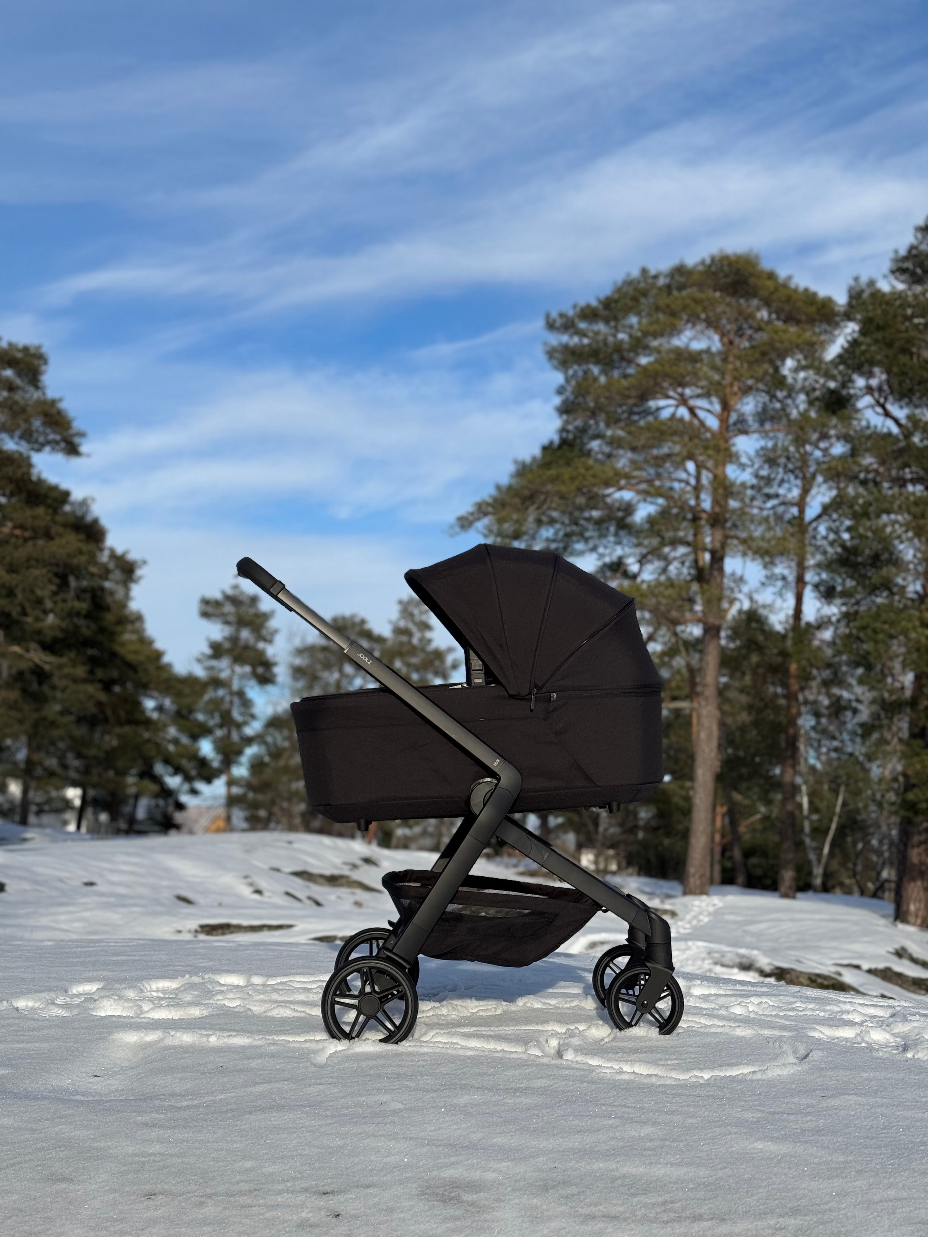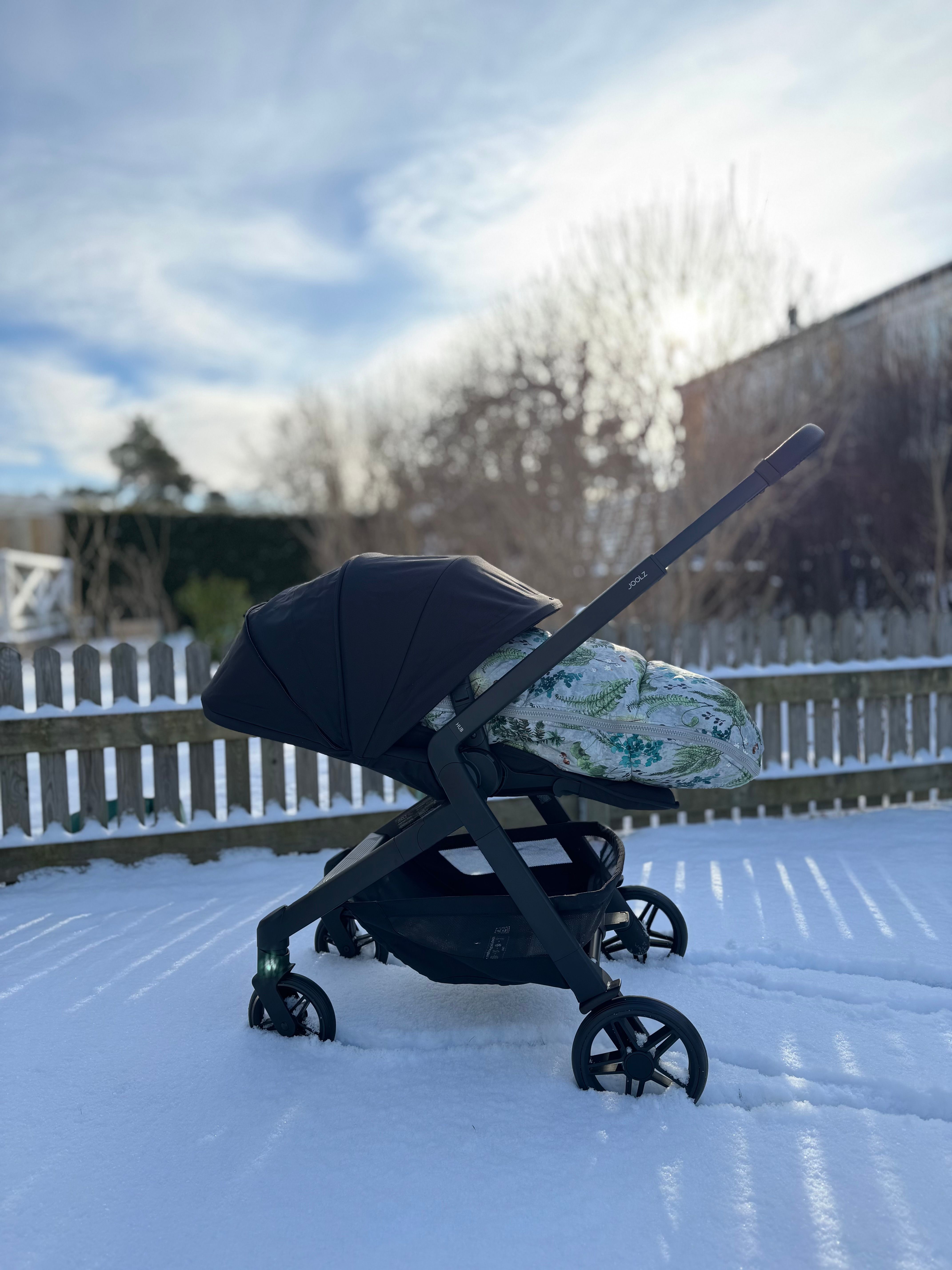 Den klarar faktiskt lite terräng (större skogsstigar) och ett par centimeters snö! Jag trodde det skulle vara tvärstopp i snö, men den klarar 3-5 cm utan problem. Mer snö än så är dock inte att rekommendera att köra i. Då framhjulen inte går att låsa blir det väldigt svårmanövrerat. Men om man inte behöver köra i mycket oplogad snö, så är Joolz Hub 2 en riktigt bra vagn som är skön att köra och åka i!
