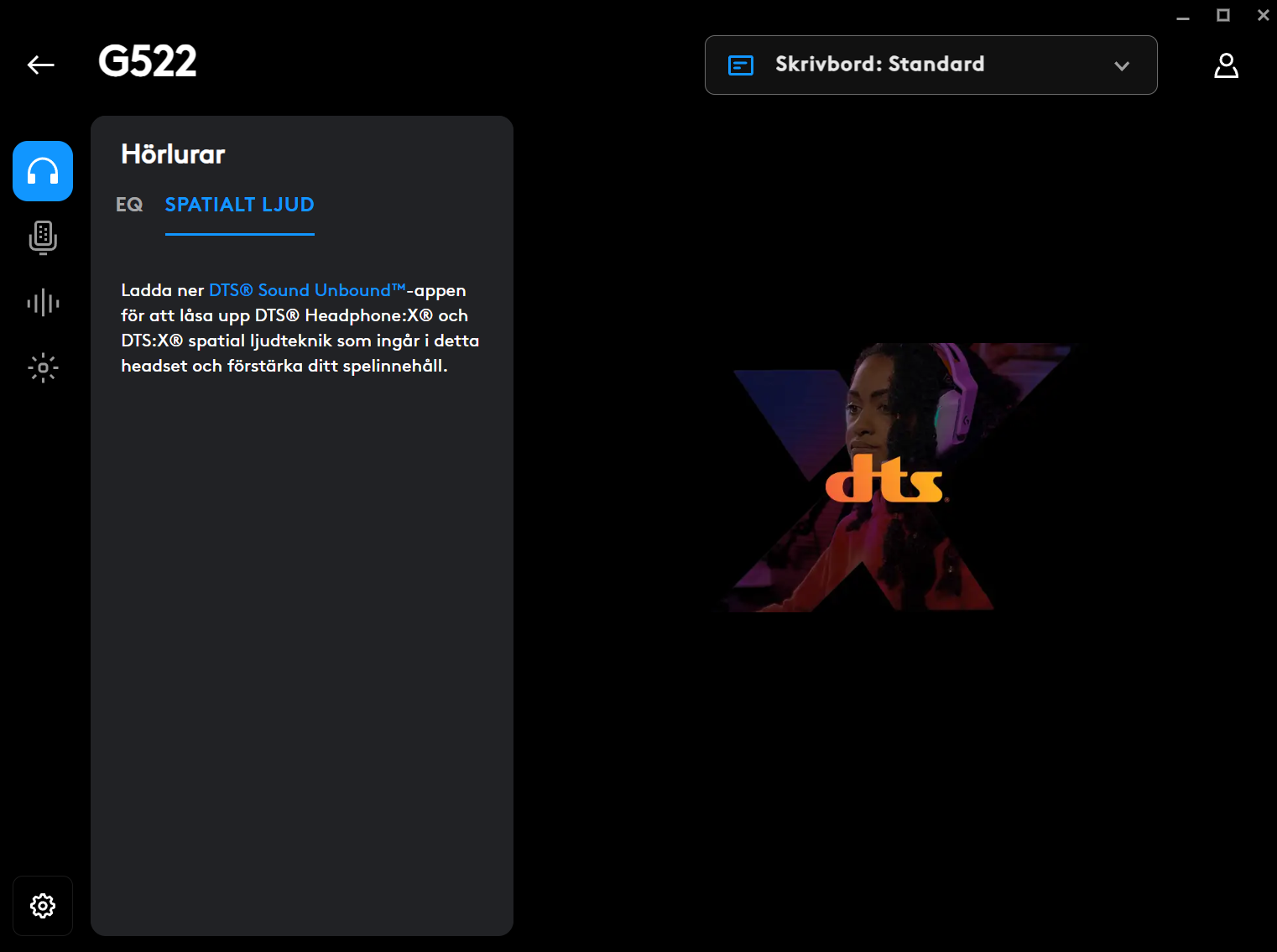 Vill du ha spatialt ljud, även kallat rumsligt ljud, så finns möjligheten via appen DTS Sound Unbound. Logitech säger att en licens är inkluderad ihop med köpet av G522. Detta skulle ske automatiskt vid installation men fungerade inte för mig, vilket i och för sig kan hänga ihop med att jag har fått förtur för att testa hörlurarna så allt kanske inte helt är på plats ännu.