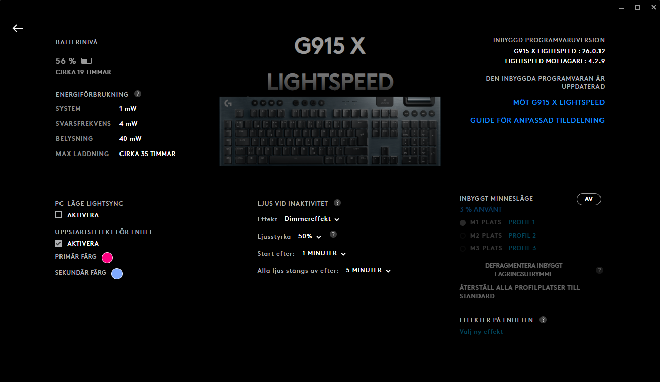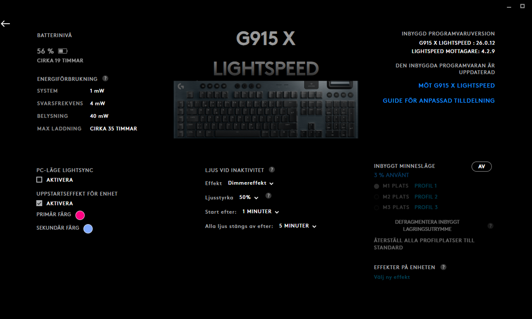 Batteritiden har fått en uppgradering, och det fullstora G915 X som jag testat håller upp till 800 timmar utan belysning och 36 timmar med 100 % ljusstyrka, vilket är ungefär en 20 % förbättring jämfört med G915.