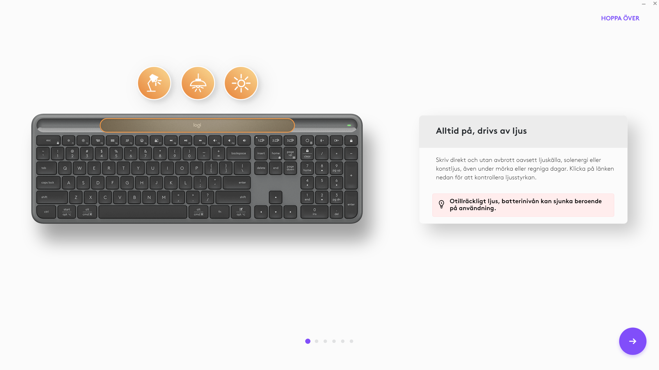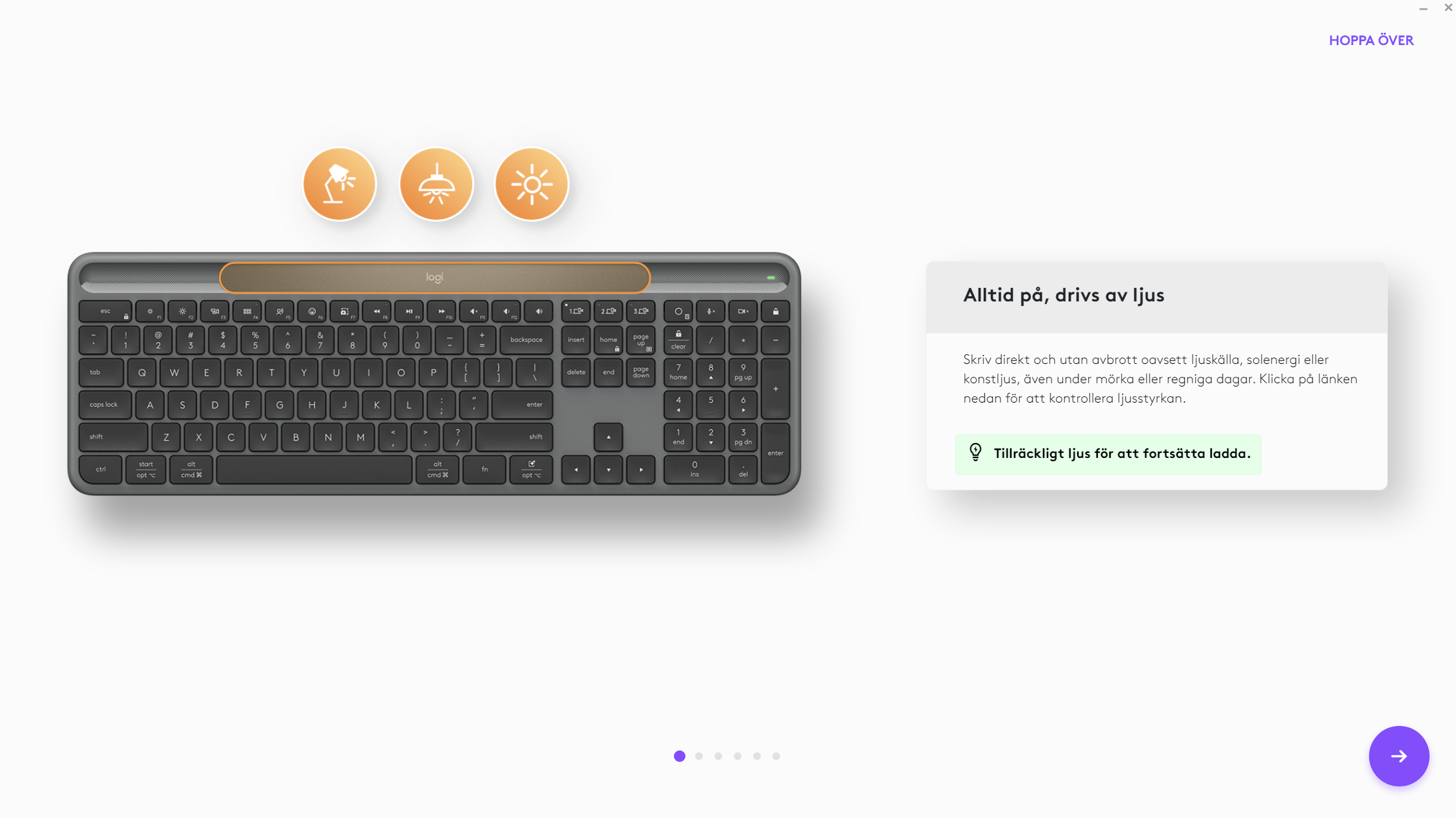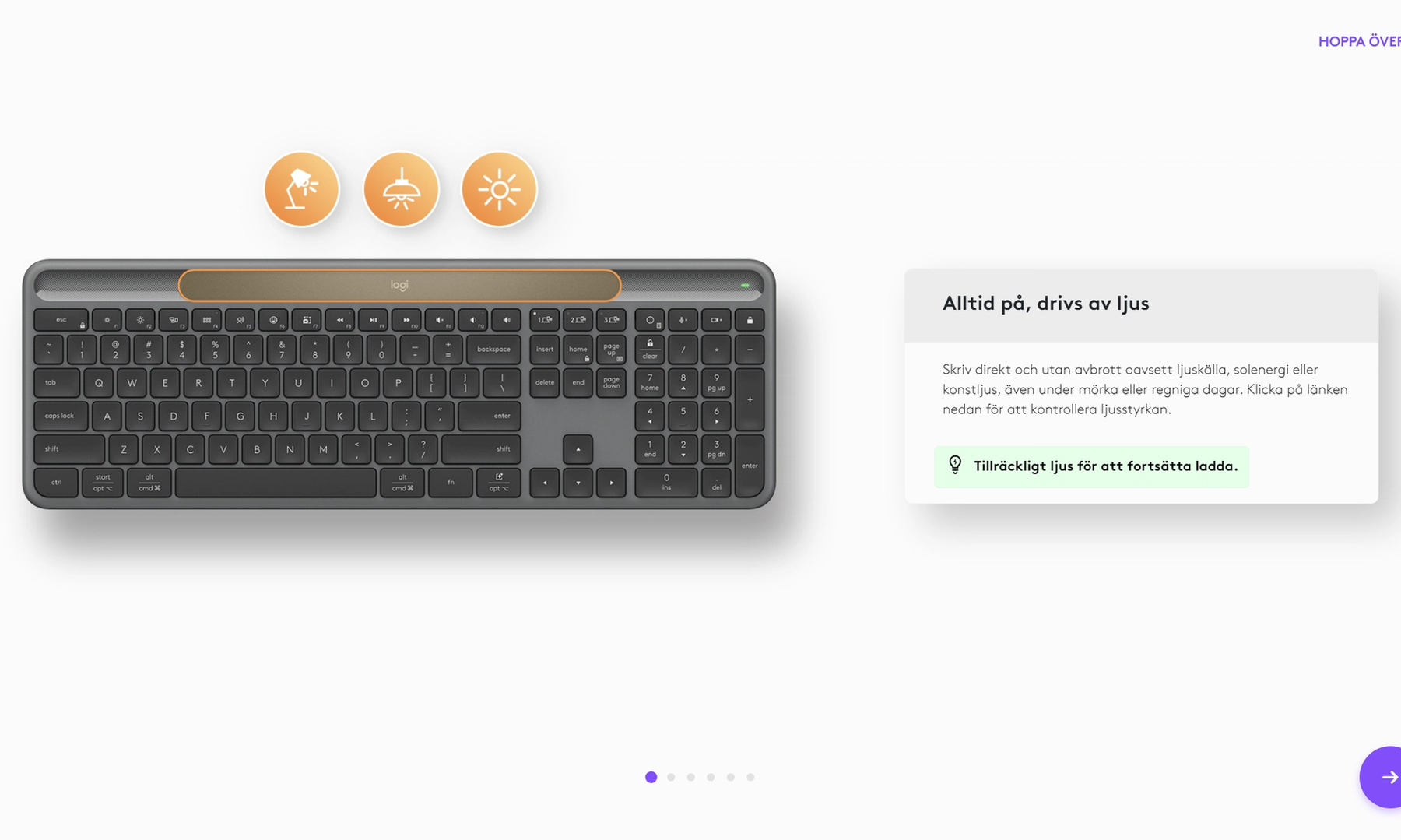 Laddtekniken kallas Logi LightCharge och vid uppsättning av Logi Options+ kan du som användare se över dina förutsättningar för laddningen. Man kan göra ett ljustest och se ifall ljuset du har vid tillfället räcker för att ladda upp tangentbordet. Det räcker inte med min taklampa i sovrummet eller ljuset från min skärm (även med högsta ljusstyrkan och vit bild). Men med studiolampan riktad mot skrivbordet räcker det till för att ladda tangentbordet.