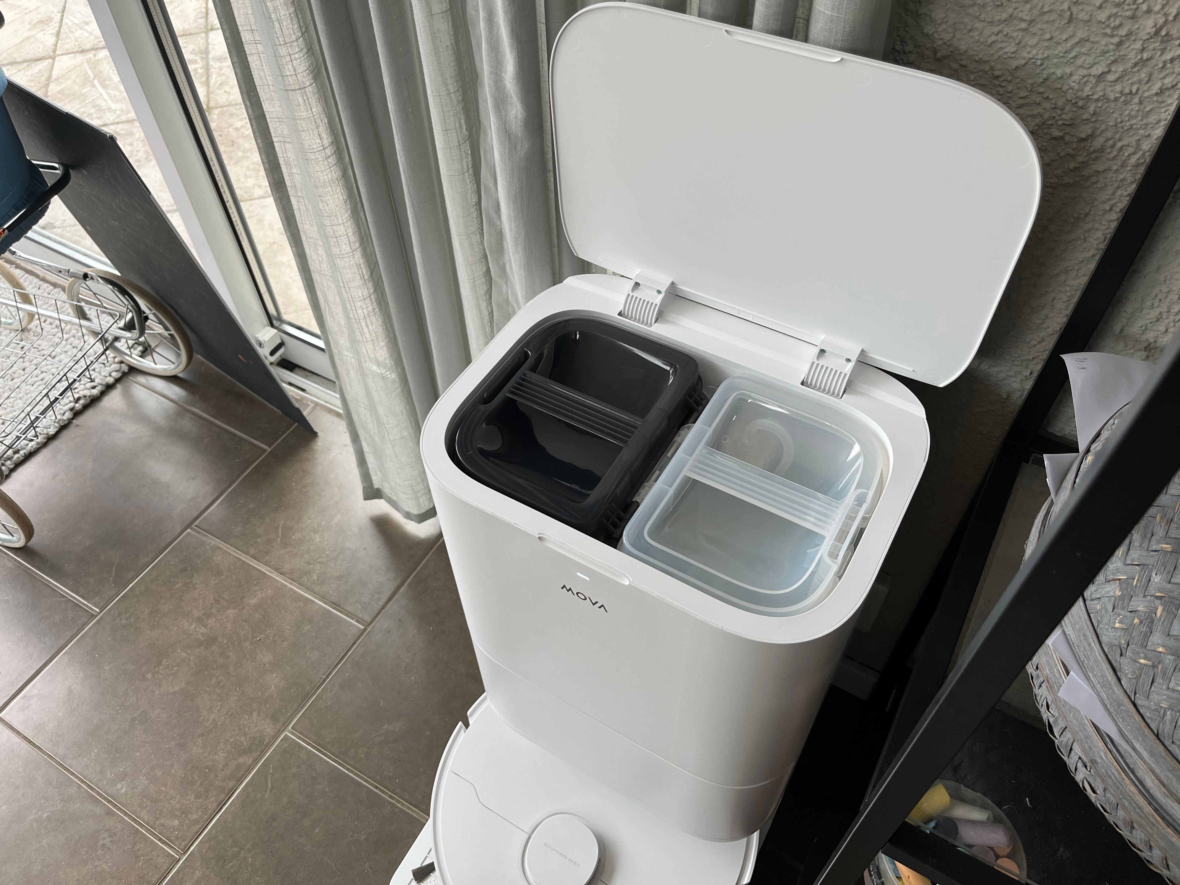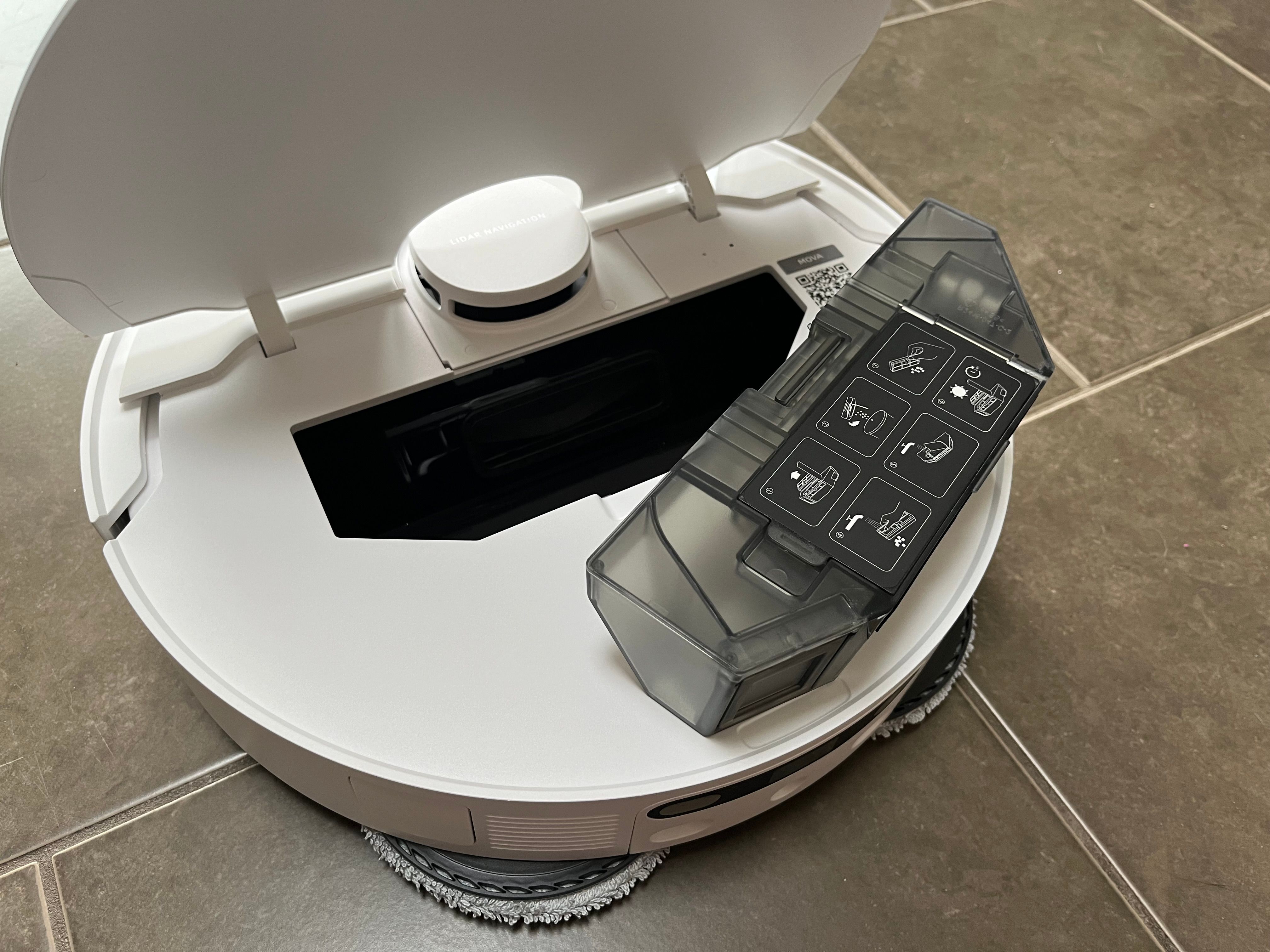 En sak jag saknar med MOVA E30 Ultra är att man inte kan använda rengöringsmedel i robotdammsugaren. Den använder enbart vatten för att moppa golven, vilket troligen är en kompromiss för att hålla nere priset. Efter att stationen har rengjort moppdynorna torkas de med varmluft för att förhindra uppbyggnad av bakterier och dålig lukt.