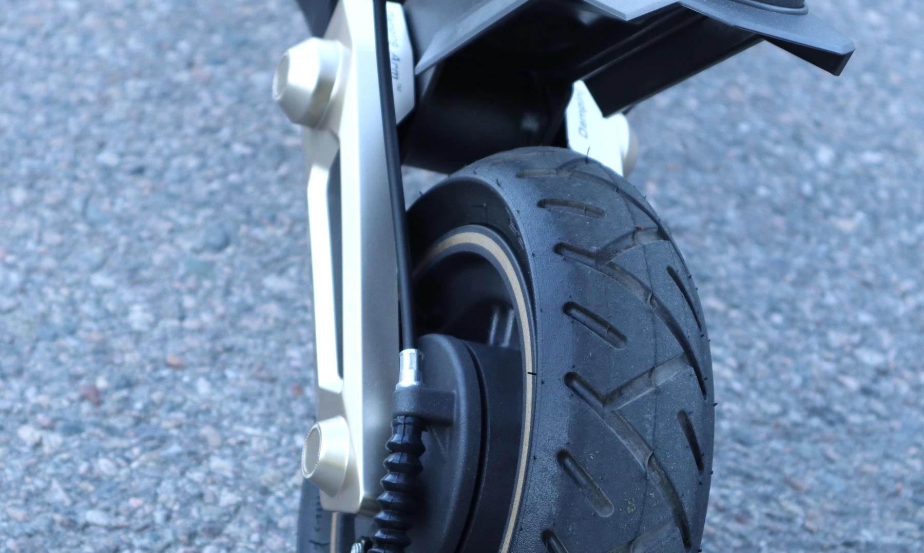 Däcken är 10-tums, självläkande och slanglösa. Du kan därför ganska bekymmersfritt råka köra över små vassa objekt.