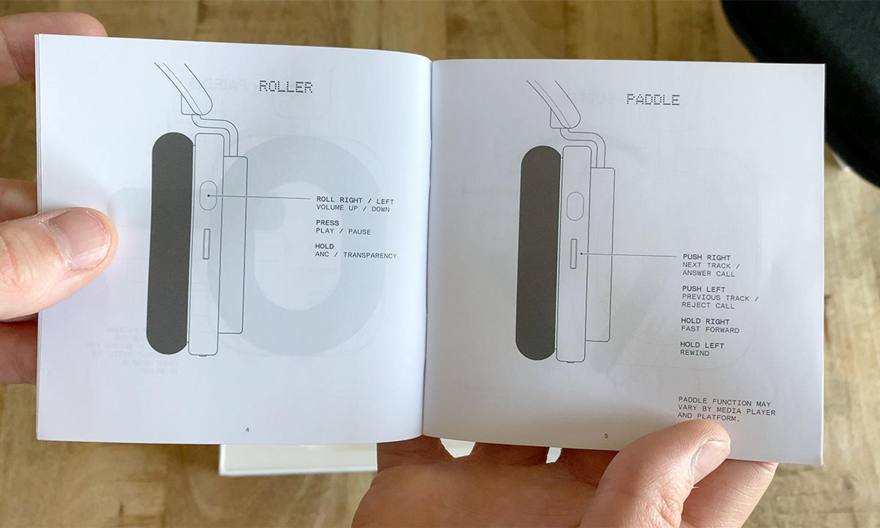 Högst upp på den högra kåpan (via vilken all kontroll sker) finns en snurrknapp som agerar både volymkontroll, start/stopp-knapp samt gör det möjligt att byta mellan olika ANC-lägen genom att hålla knappen intryckt någon sekund. Under denna finns en ”paddel-knapp” som både fungerar för att hoppa till nästa eller föregående låt och även gör det möjligt att snabbspola. En lite ovanlig, men kul-att-ha funktion.
