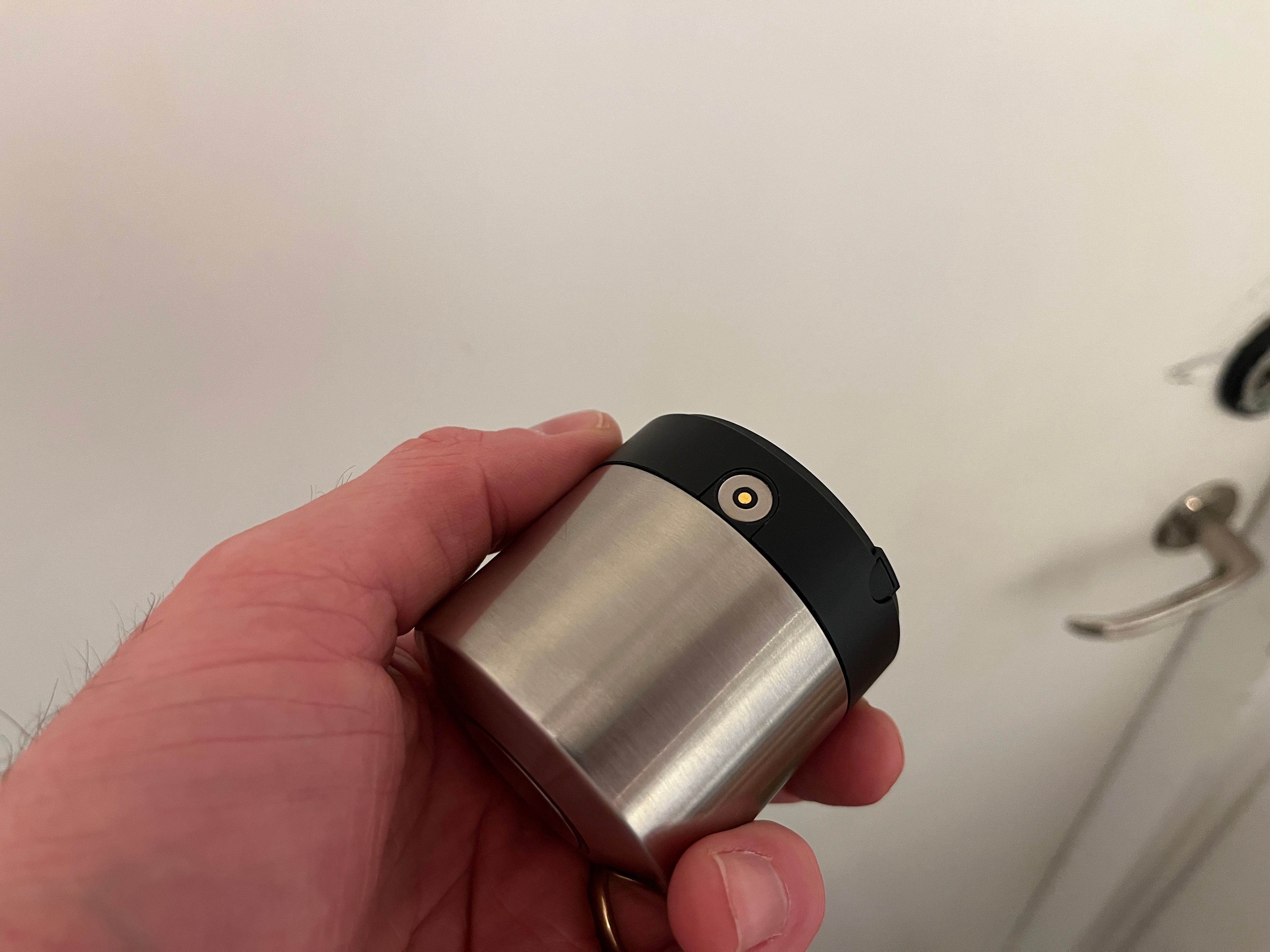 Låset har ett kraftfullt inbyggt batteri som man enkelt laddar genom den medföljande kabeln som har magnetisk kontakt, antingen på plats eller så lossar man enkelt låshuset från dörren och laddar på lämplig plats.