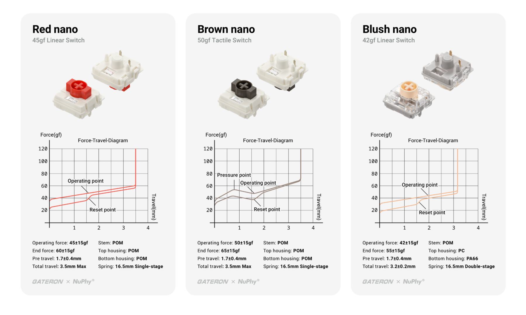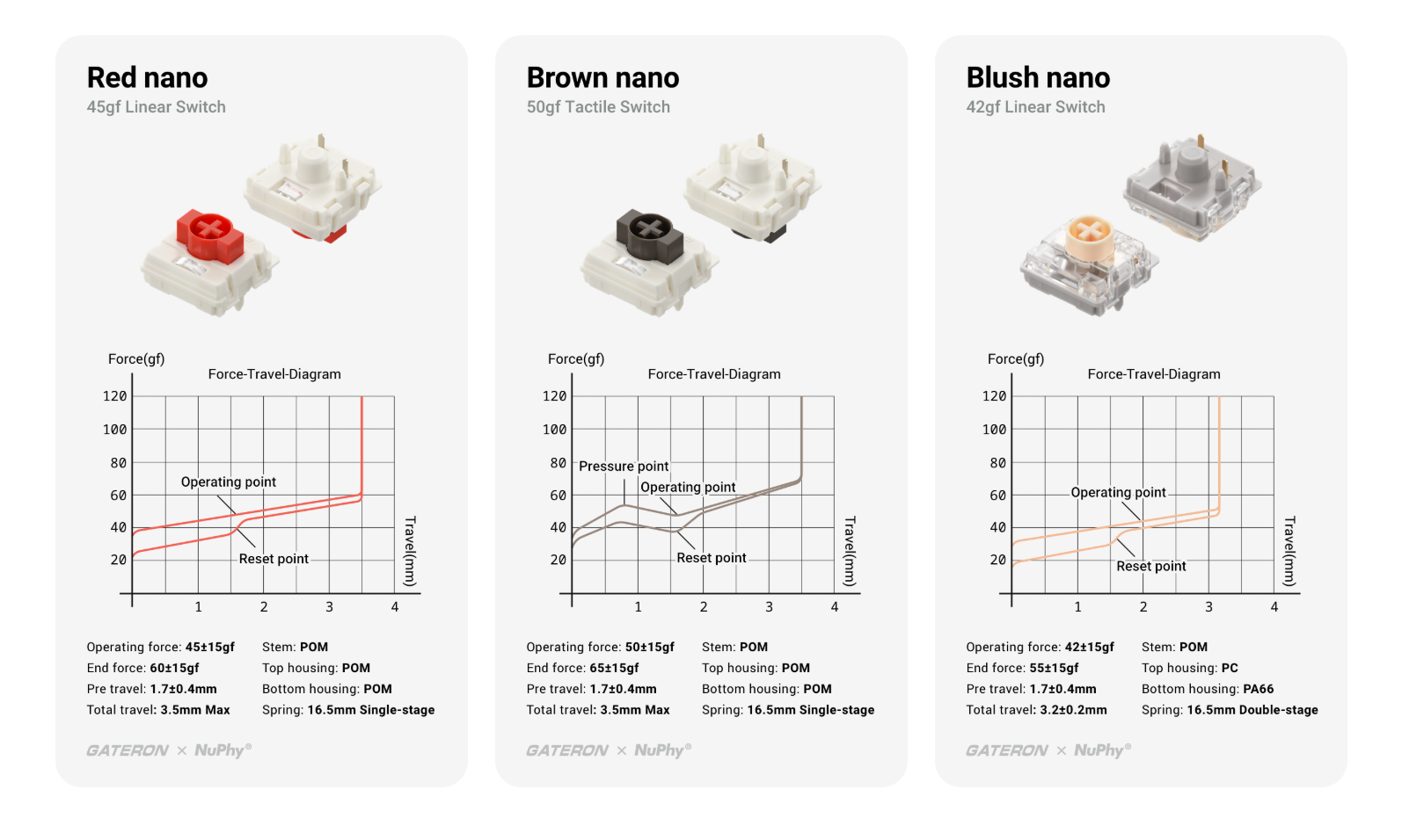 I detta stycke tänkte jag att vi djupdyker lite i de olika brytarna som detta tangentbord kan användas med. Jag har testat "Blush nano" som är en linjär brytare som aktiveras med 42 g i aktiveringskraft. Jag tycker att bilden illustrerar väldigt tydligt hur aktiveringen går till och hur dessa brytare skiljer sig. Min korta rekommendation är att 42 g är betydligt trevligare om du också skriver mycket, medan 45 eller 50 g kan vara trevligt om du främst spelar. Notera dock att "Brown nano" är en taktil brytare som ger en liten bump när tangenten trycks ned. Trevligt för den som uppskattar feedback direkt när tangenterna trycks ned.