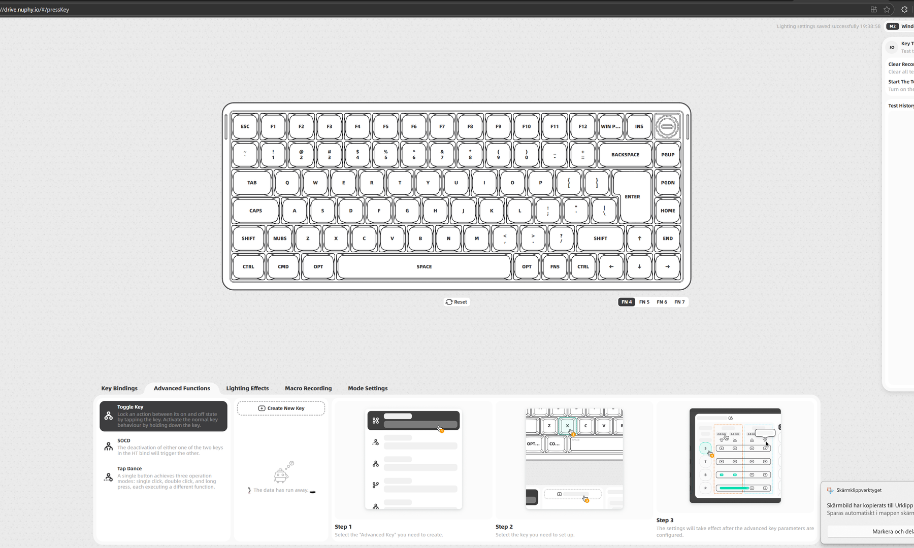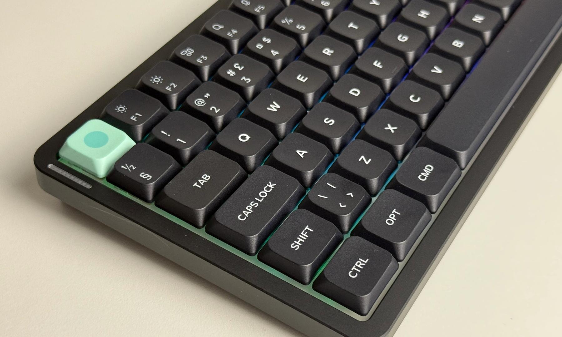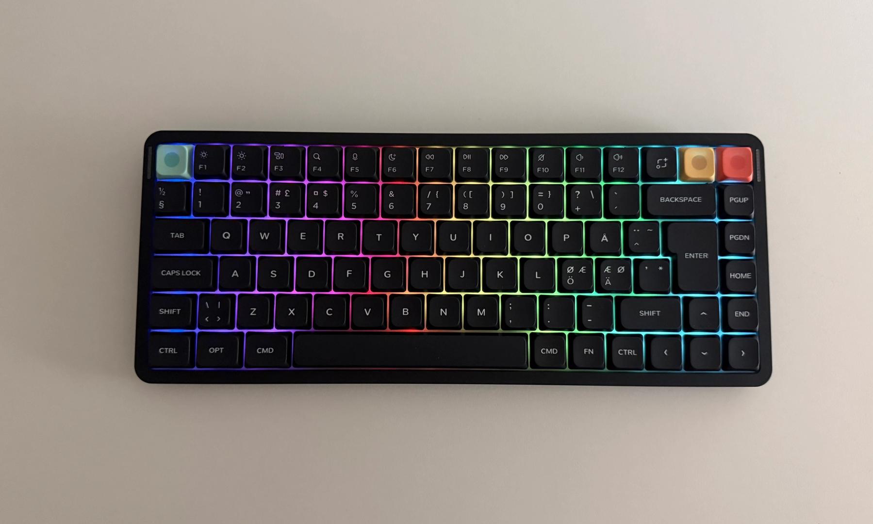 Min första känsla är att tangenbtordet känns väldigt bekant och familjärt. Främst syftar jag på tangenternas snarlika, om inte identiska, känsla mot Lofree Flow Lite som jag nyligen testade. Tangenterna och blush nano-brytarna (som jag testat) är stabila och vobblar minimalt. Tangentbordet är också väldigt tyst och trevligt att skriva på. Märkbart tystare än Lofree Flow Lite som ändå har ett trevligt men retro-aktigt ljud. RGB-belysningen kan ställas upp och lyser väldigt starkt vid 100% ljusstyrka.
