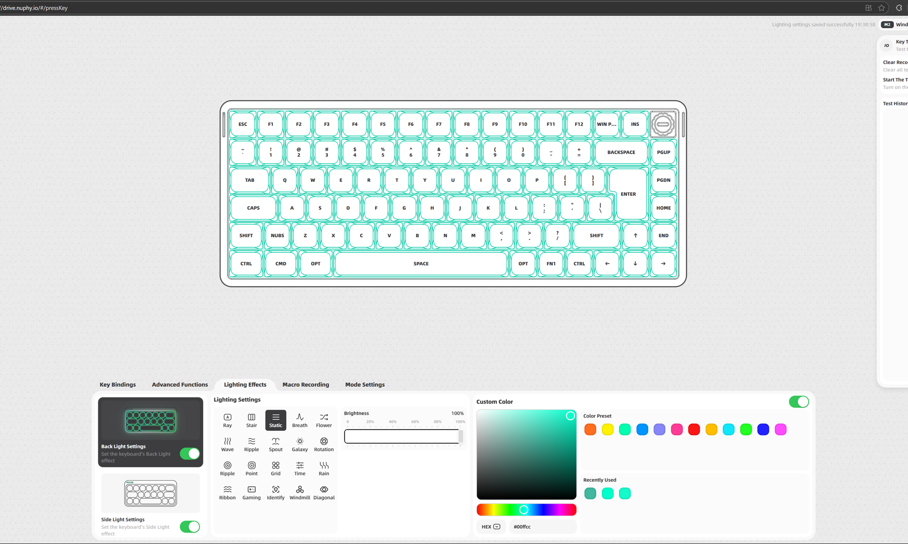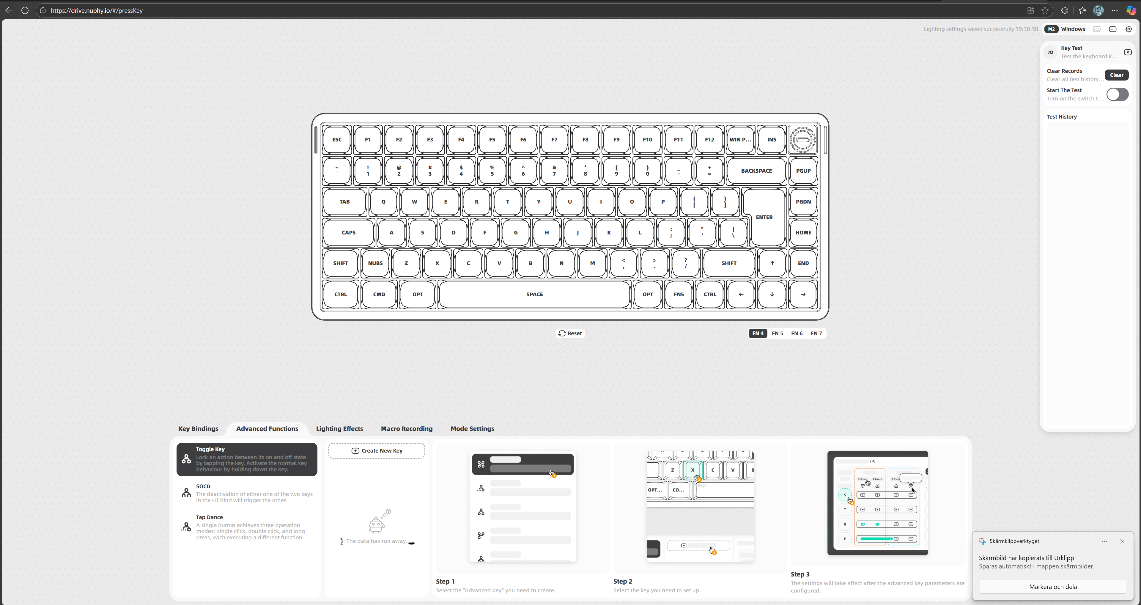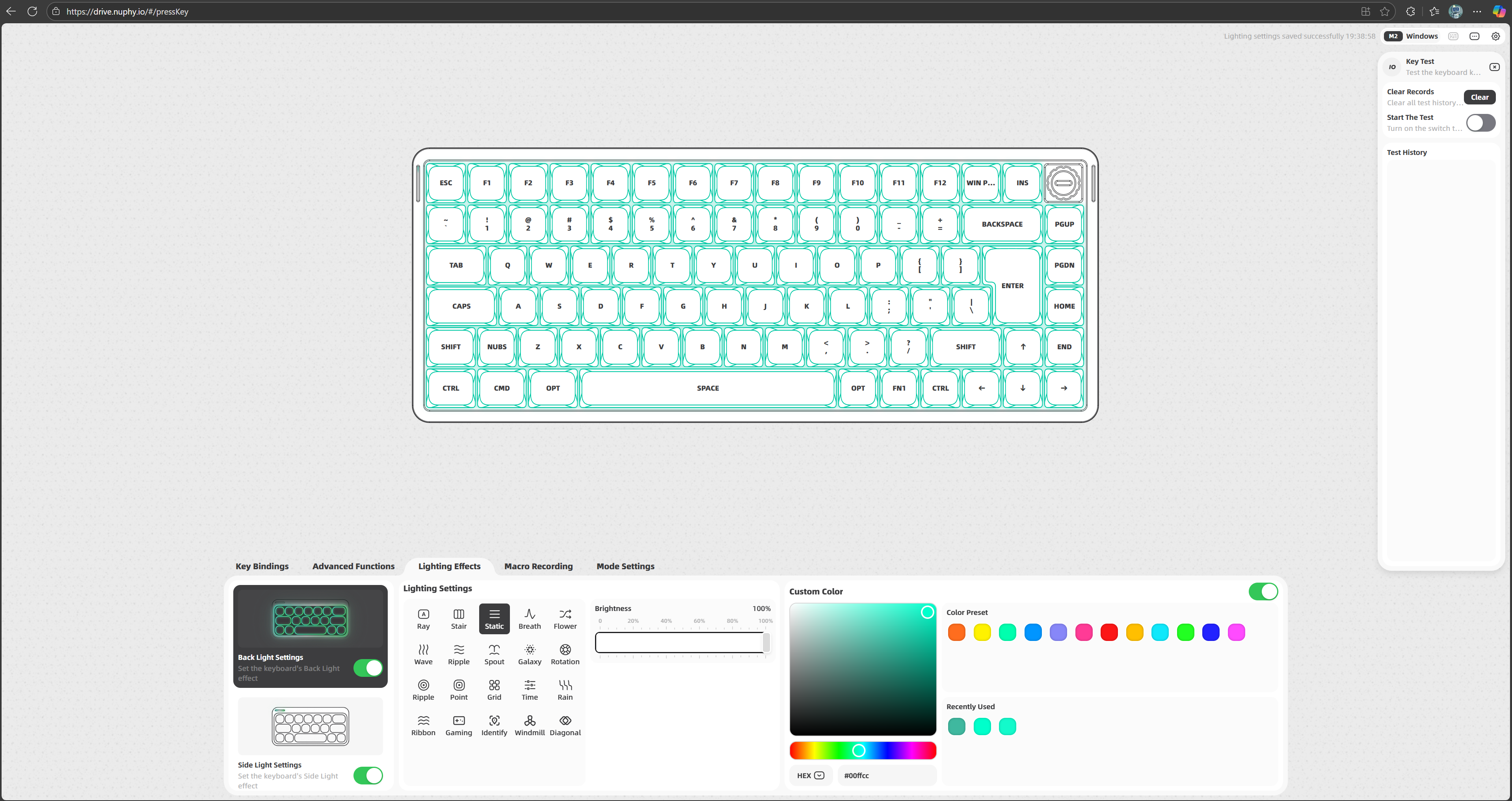 Min första känsla är att tangenbtordet känns väldigt bekant och familjärt. Främst syftar jag på tangenternas snarlika, om inte identiska, känsla mot Lofree Flow Lite som jag nyligen testade. Tangenterna och blush nano-brytarna (som jag testat) är stabila och vobblar minimalt. Tangentbordet är också väldigt tyst och trevligt att skriva på. Märkbart tystare än Lofree Flow Lite som ändå har ett trevligt men retro-aktigt ljud. RGB-belysningen kan ställas upp och lyser väldigt starkt vid 100% ljusstyrka.